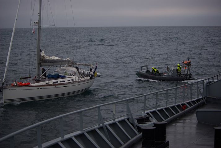 Varðskipið Týr kom að áströlsku skútunni sem óskað hafði aðstoðar vegna leka klukkan rúmlega tíu í gærkvöldi. Í tilkynningu frá Landhelgisgæslunni segir að varðskipsmenn hafi flutt tæpa 220 lítra af eldsneyti yfir til skútunnar, auk þess að kanna skemmdir á henni. „Að lokinni eldsneytisgjöf og mati á skemmdum var ákveðið að skútan héldi til hafnar á Íslandi til viðgerðar en ekki var talin þörf á að varðskipið fylgdi skútunni. Skútan er í samfloti með annarri skútu sem mun fylgja henni til hafnar og eru þær væntanlegar seinnipartinn á morgun, fimmtudag,“ segir í tilkynningunni.Mynd/Landhelgisgæslunnar