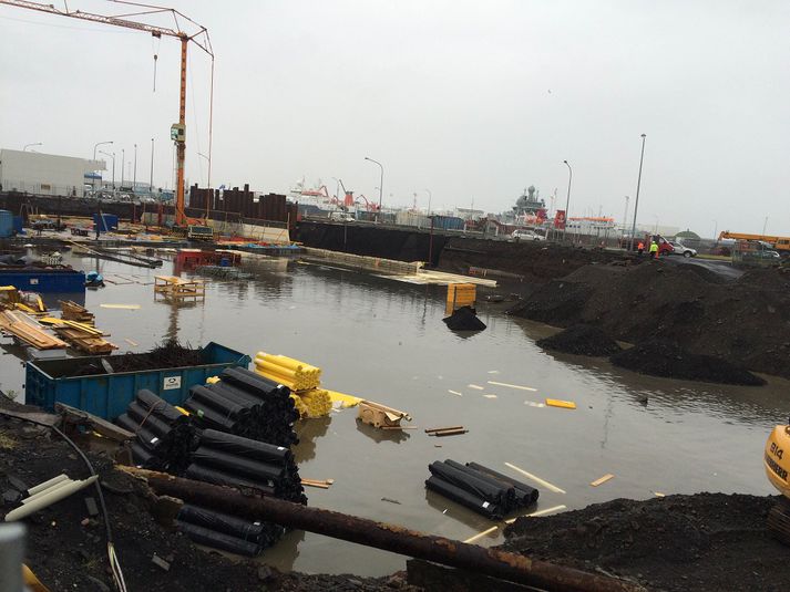 Ný tjörn myndaðist í miðbæ Reykjavíkur í dag Birgir Örn Steinarsson skrifar 25. júlí 2016 19:53 Vinnumaður fluttur á milli staða yfir vatnið í dag með gröfu. Vísir/Hjalti Hannesson Úrhellisrigning hefur verið á höfuðborgarsvæðinu í dag. Rigningarskúrarnir hafa komið í bylgjum og hafa margir eflaust lent í hellidembu á göngu sinni um miðbæinn í dag. Hjalti Hannesson ljósmyndari var einn þeirra sem átti leið um miðbæinn í dag og rakst á afar sérstaka sjón þegar hann átti leið fram hjá Geirsgötuplani. Þar standa nú yfir framkvæmdir þar sem verið er að grafa grunn fyrir nýju verslunarhúsnæði en þar safnaðist mikið vatn fyrir í dag. Vatnsmagnið var slíkt að vinnumenn á svæðinu þurftu að grípa til sérstakra ráðstafanna vegna þess eins og sjá má á myndinni hér fyrir ofan. Gröfurnar á svæðinu fengu því nýtt hlutverk í dag og voru nýttar til þess að ferja menn yfir vatnið sem myndast hafði í grunninum. Magnið var slíkt að nánast væri hægt að tala um nýja tjörn í miðbænum.Magnið af vatni í grunninum á Geirsgötuplani var slíkt að nánast var hægt að tala um nýja tjörn í miðbæ Reykjavíkur.Vísir/Hjalti Hannesson Mest lesið Davos-vaktin: Útilokar að beita hervaldi á Grænlandi en krefst viðræðna Erlent Sex sagt upp í menntamálaráðuneytinu Innlent Miðflokkurinn nálgast Samfylkingu Innlent Stjórnarformaður Vélfags handtekinn í aðgerðum saksóknara Innlent Fyrstu viðbrögð við ræðu Donalds Trump: „Ég bíð enn eftir að mennirnir í hvítu sloppunum nái í hann“ Erlent Unnu að því að stofna „Vélfag 2.0“ og tölvur með teikningum fjarlægðar Innlent „Það er ekki laust við að það fari um mann“ Innlent Vél Trump snúið við en ræðan enn á dagskrá Erlent Hvað býr bakvið sólgleraugu Macron? Erlent Vinnuslys þar sem maður „missti höndina inn í vals“ Innlent Fleiri fréttir Formaður Sjálfstæðisflokksins fer yfir þunga stöðu Taldi sig mega birta nektarmyndir af fyrrverandi en dómarinn hélt ekki Unnu að því að stofna „Vélfag 2.0“ og tölvur með teikningum fjarlægðar Drógu dauðan hval lengst út í hafsauga Segir gagnrýni minnihlutans til þess gerða að dreifa athygli Nú má heita Friðálv Gletting Lucíuson Náðu sex byssum úr byssuskáp á Akureyri Parísarheimsókn fjárlaganefndar „mjög fróðleg“ Með 29 kíló af maríjúana í töskunum Brúnni yfir Helluvatn lokað í fimm vikur Stjórnarformaður Vélfags handtekinn í aðgerðum saksóknara „Það er ekki laust við að það fari um mann“ Miðflokkurinn nálgast Samfylkingu Milljarða útspil meirihlutans „fullkomlega ábyrgðarlaust“ og lykti af prófkjörsbaráttu Ákærður fyrir nauðgun á nýársdag Markverð tíðindi í nýrri Maskínukönnun um fylgið á landsvísu Hátt í tíu þúsund manns án atvinnu í desember Sex sagt upp í menntamálaráðuneytinu Hættur í Viðreisn og sækist eftir formennsku í SI Vinnuslys þar sem maður „missti höndina inn í vals“ Baráttan um Framsókn muni snúast um sögulega stöðu Ráðherra segir ríkisvaldið gefa í með framkvæmdir Sverrir Bergmann hættir í bæjarstjórn Norðfirðingar gleðjast að sjá loðnuna birtast Annasamasti dagur á bráðamóttöku í lækna minnum Neituðu að greiða starfsfólki á leið í eigin rekstur uppsagnarfrest Gríðarleg fjölgun hótana og dæmi um að setið sé fyrir lögreglumönnum Kvaðst hafa drepið fjölskylduna og ætlað að stinga sig í hjartað Ofbeldi gegn lögreglumönnum magnast og baráttan hafin um Framsókn Nemi í jarðfræði hlaut Nýsköpunarverðlaunin Sjá meira