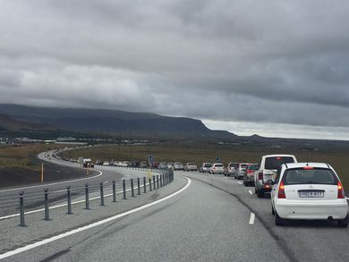 Bæjarhátíðin Blómstrandi dagar stendur nú sem hæst í Hveragerði og er þangað stöðugur straumur af fólki að sögn Jóhönnu M. Hjartardóttur viðburðastjóra hátíðarinnar. „Jú, það er rosalega margt fólk hér en það er orðið árlegt að hingað komi margir og taki þátt í hátíðinni með okkur. Laugardagurinn er svona stærsti dagurinn hjá okkur enda er ísdagur Kjöríss í dag sem trekkir að og heillar marga,“ segir Jóhanna í samtali við Vísi. Ísveisla Kjöríss hófst klukkan 13 í dag og stendur til klukkan 16 en er þetta í tíunda sinn sem hún er haldin. Á boðstólnum er úr mörgum nýstárlegum bragðtegundum að velja í veislunni og má helst nefna Guðna forseta, Hilarrís, Trumpís, Geitamjólkurís og Wasabís.Stöðugur straumur hefur verið í Hveragerði í dag á Blómstrandi daga.vísirJóhanna segir að mikið sé um að vera í bænum og dagskráin sé fjölbreytt; sýningar á vinnustofum og í galleríum, Fornbílaklúbburinn er á staðnum og svo er skemmtidagskrá í lystigarðinum. Aðspurð hversu margir hafa lagt leið sína á hátíðina undanfarin ár og hversu mörgum Hvergerðingar eiga von á segir Jóhanna erfitt að nefna nákvæma tölu. „Þetta hafa verið svona á bilinu sjö til tólf þúsund manns sem hafa verið að koma en bærinn ber þetta mjög vel enda dreifist dagskráin vel um bæinn.“ Mikil umferð hefur verið niður Kambana vegna hátíðarinnar eins og meðfylgjandi myndir sýna en Jóhanna bendir fólki á að einnig sé hægt að fara um Þrengslin; það muni ekki svo miklu í vegalengd en létti á umferðinni um Kambana.