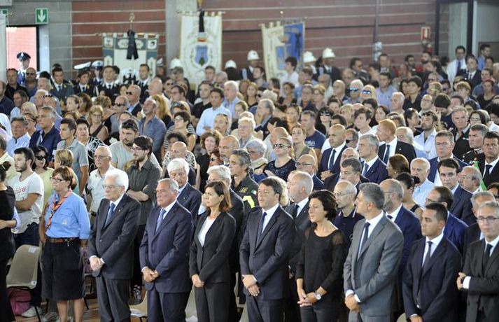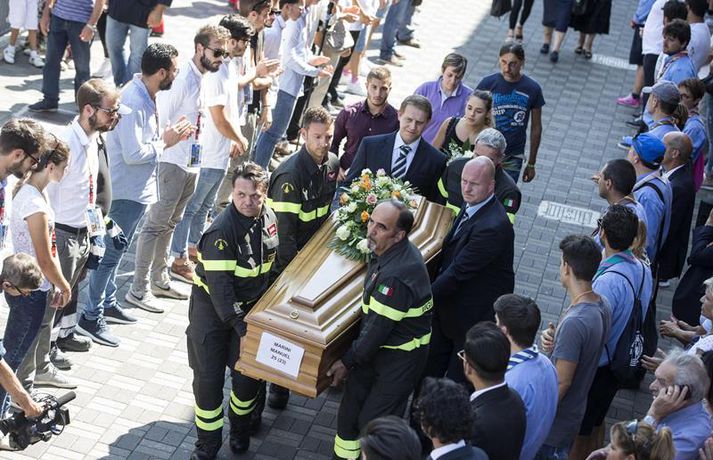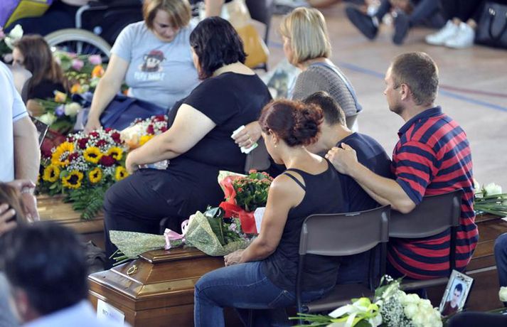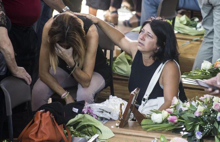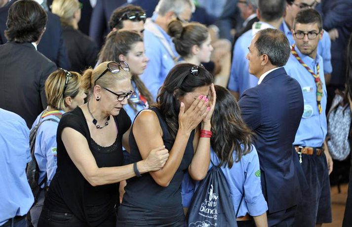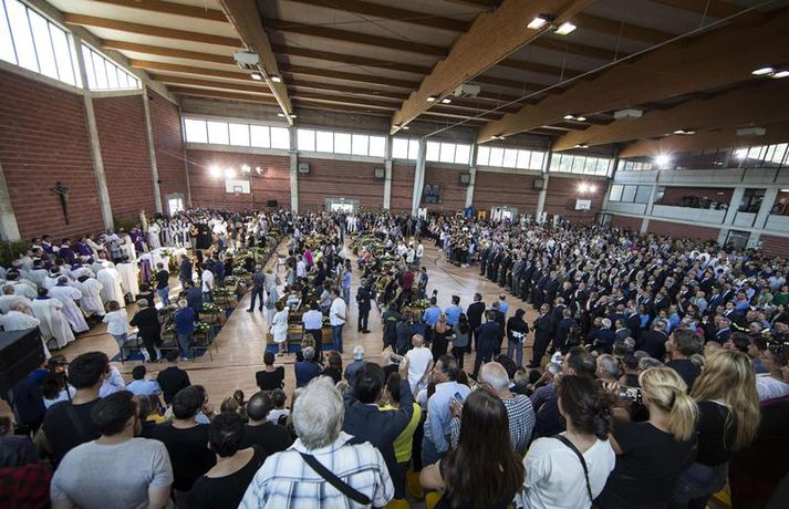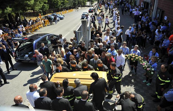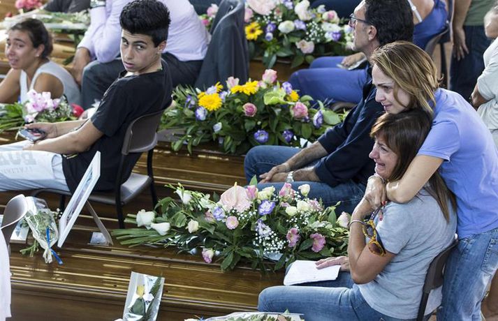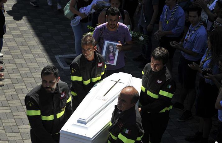 Fjögurra ára stúlka fannst á lífi undir líki eldri systur sinnar Una Sighvatsdóttir skrifar 27. ágúst 2016 19:30 Fyrstu fjöldaútfarir fórnarlamba jarðskjálftans á Ítalíu fóru fram í dag. Á sama tíma heldur rústabjörgun áfram, en lítil von er þó um að nokkur finnist á lífi. Tala látinna fer áfram hækkandi og er nú staðfest að minnst 290 hafi farist. Hundruð manna kom saman til að fylgja til grafar 35 af fórnarlömbum náttúruhamfaranna, í bænum Arquata í dag. Athöfin fór fram í íþróttasal og var sjónvarpað á stórum skjám fyrir utan, þar sem ekki var nægilegt húsrúm fyrir syrgjendur. Líkkistum var stillt upp í röðum, þar á meðal tvær hvítmálaðar barnakistur. Í annarri þeirri hvílir hinn 9 ára gamla Giulia Rinaldo, eitt yngsta fórnarlamb skjálftans. Yngri systur hennar, Giorgiu, var bjargað úr rústum heimilis þeirra og átti hún fjögurra ára afmæli í dag. Það varð henni til lífs að hún lá undir látinni systur sinni. Opinber þjóðarsorg hófst á Ítalíu í dag og var flaggað í hálfa stöng um landið allt. Ítalska jarðfræðistofnunin segir að yfir 13 hundruð eftirskjálftar hafi riðið yfir svæðið frá skjálftanum stóra aðfaranótt miðvikudags. Um fjögur þúsund sérfræðingar og sjálfboðaliðar eru enn að störfum á hamfarasvæðinu yfir helgina, bæði við hreinsunarstarf og leit. Minnst níu lík fundust í húsarústum í dag og er tala látinna þar með komin upp í 290 manns. Langflest dauðsföll urðu í bænum Amatrice, þar sem 230 létust. Nánast allar sögulegar byggingar bæjarins eru rústir einar. Íbúar óttast nú að mörg smáþorpanna á áhrifasvæðinu séu nú dæmd til að verða yfirgefnir draugabæir. Hér að neðan má sjá myndir frá útförinni í dag sem teknar voru fyrir EPA myndaveituna. Tengdar fréttir Neyðarástandi lýst yfir á Ítalíu Vonir um að fólk finnist á lífi í rústunum fara hratt dvínandi. 26. ágúst 2016 07:54 Spurningar vakna um byggingar á Ítalíu Þrátt fyrir fjölda mannskæðra jarðskjálfta á síðustu áratugum er áætlað að 70 prósent húsa séu ekki byggð með jarðskjálfta í huga. 26. ágúst 2016 10:37 Minnst 247 látnir á Ítalíu Fjölmargra er saknað og búist er við að tala látinna muni hækka meira. 25. ágúst 2016 07:30 Eftirskjálftar viðhalda ótta Neyðarástandi hefur verið lýst yfir á þeim svæðum á Mið-Ítalíu sem verst urðu úti í jarðskjálftanum á miðvikudag. Ítalíustjórn ætlar að verja 50 milljónum evra til enduruppbyggingar á svæðinu. 27. ágúst 2016 07:00 Mest lesið Íslendingur handtekinn á EM Innlent Rauð norðurljós vegna kórónugoss Innlent Samþykktu aldrei að Sanna fengi oddvitasætið Innlent Hljóp á sig Innlent Minnir á hvernig Hitler komst til valda Innlent „Þarf að klára að setja slaufu á pakkann“ Innlent „Dapurlegt að gera ákvarðanirnar tortryggilegar“ Innlent Þjóðverjar yfirgefa Grænland Erlent Hafi brotist inn til föður barnsmóður sinnar og reynt að myrða hann Innlent Hættur að hugsa bara um frið fyrst hann fékk ekki Nóbelinn Erlent Fleiri fréttir Vitleysan „í þessum óþekka strák í Hvíta húsinu“ leiði vonandi til sjálfstæðis Skoða bann við nektarforritum eftir X-hneykslið Býður Pútín sæti í „friðarráði“ fyrir Gasaströndina Hættur að hugsa bara um frið fyrst hann fékk ekki Nóbelinn Tala látinna hækkar í lestarslysinu á Spáni Danir máttlausir gagnvart rússnesku ógninni í 20 ár Rúmlega tuttugu látnir eftir árekstur tveggja hraðlesta Boðar leiðtogaráðið á aukafund vegna hótana Trumps Brýndi fyrir Trump að tollun hans væri „röng“ Þjóðverjar yfirgefa Grænland Ræddi við Trump: „Hlakka til að sjá hann“ Hervæddur hvunndagurinn í Nuuk Átta látnir á einum degi vegna snjóflóða Miklar sviptingar í Sýrlandi Gríðarleg vonbrigði og mikið áhyggjuefni Tollahótanir Trump gætu hrundið af stað uggvænlegri atburðarás Nóbelsnefndin afdráttarlaus varðandi framsal verðlaunapeninga Vilja beita „ofurvopni“ ESB gegn Bandaríkjunum Hundruð hermanna í viðbragðsstöðu vegna Minnesota Myndir: Þúsundir mótmæltu á Grænlandi Segir þúsundir hafa dáið á grimmilegan máta Setur „stærsta samning í sögunni“ í uppnám Evrópuleiðtogar bregðast við: „Við látum ekki fjárkúga okkur“ Macron: „Engin ógnun eða hótun mun hafa áhrif á okkur“ Ekki útilokað að Ísland sæti Grænlandstollum Þyrfti líklega að leggja toll á allt Evrópusambandið Reyna að rjúfa nettenginu endanlega Boðar 10 prósenta toll á Norðurlönd, Breta, Frakka, Þjóðverja og fleiri Þúsundir baula á bandaríska sendiherrann Ítalir lögðu hald á skip frá Rússlandi Sjá meira