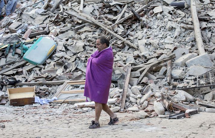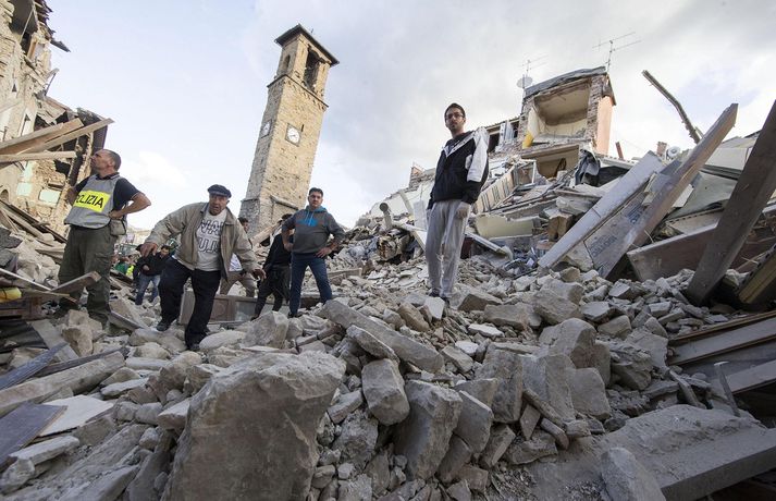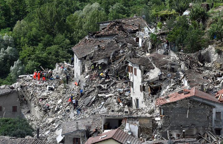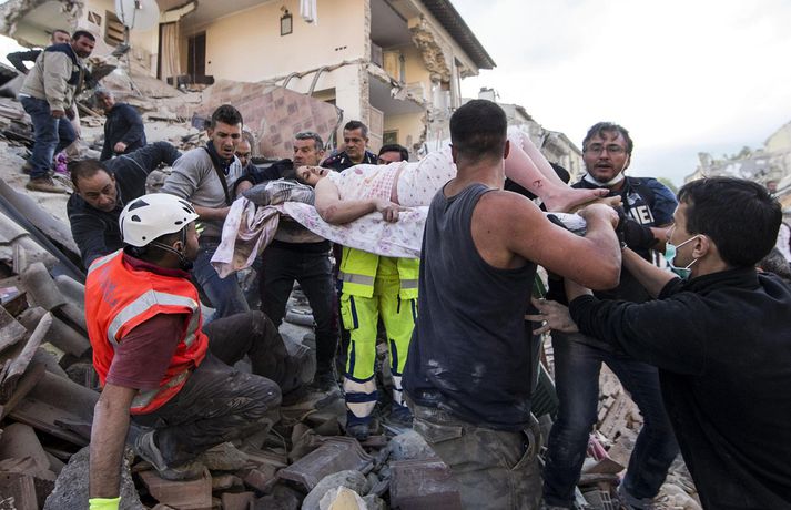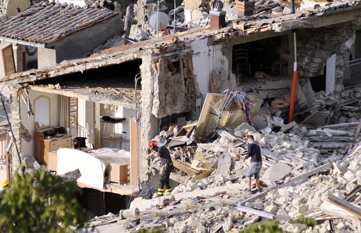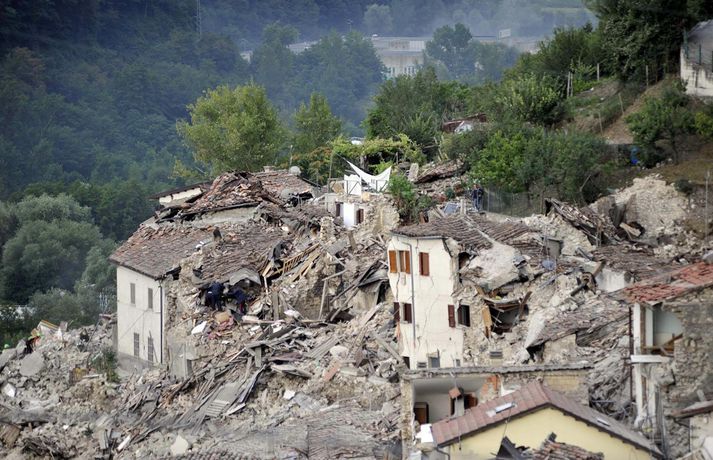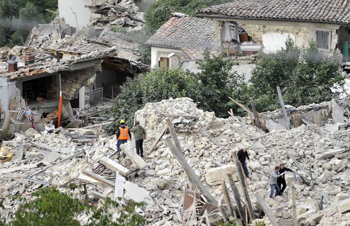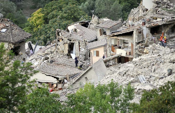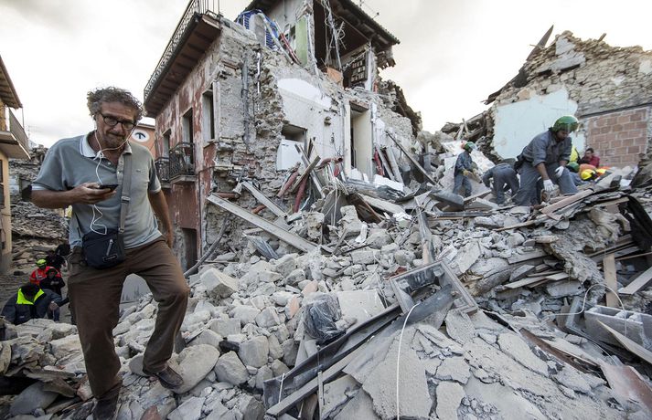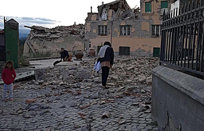 Myndir sem sýna hörmungarnar á Ítalíu Samúel Karl Ólason skrifar 24. ágúst 2016 10:18 Vísir/EPA Tugir eru látnir og fjölmargra er saknað eftir að öflugur jarðskjálfti varð á Ítalíu í nótt. Þorpið Pescara del Tronto er nánast rústir einar og fleiri þorp urðu verulega illa úti.Sjá einnig: Stór jarðskjálfti á Ítalíu Björgunaraðilar vinna nú hörðum höndum að því að ná fólki úr rústum húsa og að koma innviðum aftur í lag. Um 80 eftirskjálftar hafa mælst á svæðinu. Hér að neðan má sjá myndir frá myndaveitunni EPA sem teknar voru í Pescara del Tronto og Amatrice. Mest lesið Martraðakennd flugferð: „Það voru allir að öskra á Allah og hágrátandi“ Innlent „Erum að sjá allt niður í níu og ellefu ára stúlkur“ Innlent Allt bendi til þess að breytingar séu í farvatninu Erlent Sundlaugum lokað vegna óöruggra aðstæðna Innlent Viðverustjórn er hluti af sérfræðiþekkingu mannauðsfólks Innlent Gæsluvarðhaldskröfu yfir grunuðum barnaníðingi hafnað Innlent Miklar tafir á Hellisheiði vegna slyss Innlent Tár féllu, veðurguðir léku sér og stórmenni kvöddu sviðið Innlent Nýtt myndband af banaskotinu: „Helvítis tík“ Erlent Ráðast í úttekt á hljóðdempun á höfuðborgarsvæðinu Innlent Fleiri fréttir Nýtt myndband af banaskotinu: „Helvítis tík“ Allt bendi til þess að breytingar séu í farvatninu Annar eigandi skemmtistaðarins í Sviss í haldi Verði að eignast Grænland svo Kína og Rússland geri það ekki Tuga saknað eftir ruslskriðu á Filippseyjum Bresk stjórnvöld segja viðbrögð X „móðgandi“ Ætlar að taka við nóbelnum frá Machado Tóku fimmta olíuskipið: Svona virkar „skuggaflotinn“ Stendur fastur fyrir og fordæmir Trump Flytja áhöfn geimstöðvarinnar heim vegna veikinda Hjón skotin af alríkisútsendurum í Portland Takmarka myndaframleiðslu Grok í skugga gagnrýni Segir Bandaríkin þurfa að eignast Grænland, sáttmálar séu ekki nóg Netsambandslaust meðan mótmælt er í Íran Bandaríkin áður mun öflugri á Grænlandi Telur að Evrópa myndi fórna Grænlandi fyrir NATÓ Mikil spenna í Minneapolis eftir banaskot ICE-liða Veikindi geimfara gætu flýtt heimför áhafnar geimstöðvar Segist hafa grænt ljós frá Trump fyrir frekari refsiaðgerðum gegn Rússum Enn mótmælt í Íran og átök að aukast Gervigreind Musk sögð hafa búið til kynferðislegar myndir af ellefu ára gömlum börnum Þingmaður Svíþjóðardemókrata tekin full undir stýri með kókaín í poka Trump-liðar hóta fauta Maduros sömu örlögum eða dauða Trump sé tilbúinn að ganga „eins langt og nauðsynlegt er“ gagnvart Grænlandi Þyngdartap með lyfjum mun fljótara að ganga til baka eftir að notkun er hætt Trump dregur enn frekar úr þátttöku Bandaríkjanna á alþjóðasviðinu Þúsundir Kólumbíumanna mótmæltu hótunum Trump „Trúið ekki þessari áróðursvél“ Gæti leitt til aukinnar íhlutunar í Atlantshafi Fulltrúi ICE skaut konu til bana í Minneapolis Sjá meira