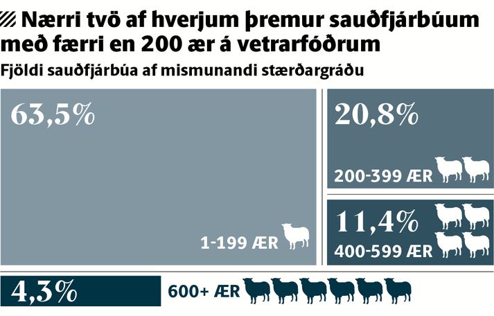Tveir af hverjum þremur sauðfjárbændum með mjög fátt fé Sveinn Arnarsson skrifar 24. ágúst 2016 07:00 Nærri tvö af hverjum þremur sauðfjárbúum á Íslandi eru með færri en 200 ær á vetrarfóðrum. Aðeins fjögur prósent sauðfjárbúa eru með yfir 600 ær á fóðrum. Prófessor í hagfræði segir íslenska sauðfjárrækt að mestu leyti hobbívinnu sem sé þægileg með annarri vinnu. Svavar Halldórsson, framkvæmdastjóri Félags sauðfjárbænda, segir marga bændur vinna önnur störf meðfram sauðfjárrækt. „Í nýrri skýrslu Arion banka kemur fram að margir bændur séu í öðrum störfum svo sem ferðaþjónustu, í alls kyns verktakavinnu og svo framvegis. Einnig er auðvitað mikið enn um blönduð bú þar sem sauðfjárrækt er með kúabúskap eða hrossarækt svo eitthvað sé talið,“ segir Halldór. Tölur um stærð sauðfjárbúa birtust í skýrslu Byggðastofnunar um staðsetningu sauðfjár á Íslandi. Kemur fram í úttekt Byggðastofnunar að flest fé er á Norðurlandi vestra og í Skagafirði. Einnig eru langflest stór sauðfjárbú á Norðvesturlandi.Þórólfur MatthíassonÞórólfur Matthíasson, prófessor í hagfræði við Háskóla Íslands, segir mjög erfitt að setja upp sauðfjárbú sem veiti manni fulla vinnu allan ársins hrings. „Álagspunktar í sauðfjárrækt eru fáir þannig að þetta er vinna sem hentar ágætlega með öðru. Það yrði erfitt að setja upp svo stórt bú að það veiti fulla vinnu 365 daga á ári. Svo stór bú myndi landið í kring svo ekki þola. Menn verða að horfast í augu við að á mörgum stöðum ber landið ekki sauðfjárrækt og er illa farið,“ segir Þórólfur. Svavar sér smæð sauðfjárbúa ekki sem vandamál. „Það eru skýringar á þessu. Við vitum hins vegar að menn tala um að bú þurfi að vera með um 400 til 800 ær á vetrarfóðrum til að standa undir sér en það er að því gefnu að menn séu aðeins í sauðfjárrækt sem er nokkuð sjaldgæft á Íslandi,“ bætir Svavar við.Fréttin birtist fyrst í Fréttablaðinu Birtist í Fréttablaðinu Mest lesið Lamdi konu stuttu eftir að hann var stunginn Innlent Vöruðu við slæmum skilyrðum á brautinni Erlent Rauð norðurljós vegna kórónugoss Innlent Ráðherra hafi gefið veiðileyfi á sig Innlent Deilt um verðhækkanir Veitna Innlent Trump fer mikinn á Truth Social og virðist ætla sér Kanada Erlent Sænski herinn með viðbúnað á Íslandi Innlent Vitleysan „í þessum óþekka strák í Hvíta húsinu“ leiði vonandi til sjálfstæðis Erlent Hljóp á sig Innlent Loðnuvertíð hafin og floti farinn til loðnumælinga Innlent Fleiri fréttir Lamdi konu stuttu eftir að hann var stunginn Sænski herinn með viðbúnað á Íslandi Loðnuvertíð hafin og floti farinn til loðnumælinga Deilt um verðhækkanir Veitna Veita hjúkrunarheimilum ráðgjöf vikulega vegna drykkju eldri borgara Ráðherra hafi gefið veiðileyfi á sig Rauð norðurljós vegna kórónugoss Hljóp á sig Ósanngjarnt að skattgreiðendur borgi framkvæmdaruslið Vegagerðin ræðst í úrbætur á slysstað banaslyss Össur um öryggismálin, vandi vinstrisins og falin fíkn eldri borgara Íslendingur handtekinn á EM Ráðuneytið vill að fleiri bjóði sig fram Ólafur sakar Ingu um að vera sjúka í að láta mynda sig við skóflustungur „Dapurlegt að gera ákvarðanirnar tortryggilegar“ Hundaeigendur hvattir til að vera á varðbergi Hafi brotist inn til föður barnsmóður sinnar og reynt að myrða hann Handtökur, húsleit og haldlögð vopn í lögregluaðgerðum á Akureyri Vegagerðin bæti hringveginn eftir að grjót banaði ferðamanni Bréf Trumps til Norðmanna og væringar innan VG Verkútboð í vegagerð auglýst eftir langt hlé „Þarf að klára að setja slaufu á pakkann“ „Blasir við að íslenskt launafólk var svikið“ Um tvöfalt fleiri óánægðir en ánægðir með frestun gangna Ekki rétta leiðin að kynda undir læsisstríð Mælir fyrir samgönguáætlun í dag Fann kattarhræ í margnota poka úti í hrauni Samþykktu aldrei að Sanna fengi oddvitasætið Minnir á hvernig Hitler komst til valda VG og Sanna sameina krafta sína Sjá meira