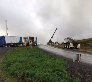 Ökumaður slapp með skrekkinn þegar stór flutningabíll valt við Reynisfjall Gissur Sigurðsson og Kolbeinn Tumi Daðason skrifa 23. ágúst 2016 10:44 Frá vettvangi á þjóðveginum við Reynisfjall. Mynd/Bryndís Fanney Ökumaður á stórum flutningabíl, slapp nær ómeiddur þegar bíll hans valt rétt ofan við Vík í Mýrdal um miðætti. Hann komst af sjálfdáðum út úr bílnum. Bíllinn var lestaður fiskikörum, fullum af ísuðum fiski, og voru björgunarsveitarmenn úr nágrenninu kallaðir út og hófust handa klukkan fimm í nótt við að tína fiskinn saman og setja yfir í annan flutningabíl. Búast má við að þjóðveginum verði lokað undir hádegi á meðan stórir kranabílar ná flutningabílnum upp á veg aftur. Tildrög þess að svona fór liggja ekki fyrir en bíllinn var í beygju þegar ökumaðurinn missti stjórn á honum. Rigning, hvassviðri og lélegt skyggni voru á þessum slóðum þegar þetta gerðist.Ökumaðurinn slapp ótrúlega vel.Mynd/Bryndís Fanney„Þetta var ekki fallegt að sjá, mikill fiskur og kjötmeti út um allt. En heppinn bílstjórinn að sleppa,“ segir Orri Örvarsson hjá björgunarsveitinni Víkverja í Vík í Mýrdal. Hann segir fiskinn og kjötið ekki hafa dreifst á stórt svæði. „En bíllinn fór alveg á hvolf og vagninn sprakk alveg í sundur. Það dreifðist úr þessum körum. Við erum búin að vera í nótt að tína þetta saman. Við náðum að bjarga töluverðu af þessu. Það kom góður mannskapur að tína saman í kör. En það er alltaf eitthvað svolítið skemmt.“ Orri segir flutningabíla stundum lenda í vandræðum á þessum slóðum á veturna en mjög sérstakt sé að þetta gerist að sumri til. Sem fyrr segir slapp ökumaðurinn ótrúlega vel. „Það var ekki skráma á honum. Það bjargaði honum að vera í belti því farþegamegin fór bíllinn alveg í klessu.“ Mest lesið Trump fer mikinn á Truth Social og virðist ætla sér Kanada Erlent Lamdi konu stuttu eftir að hann var stunginn Innlent Vöruðu við slæmum skilyrðum á brautinni Erlent Rauð norðurljós vegna kórónugoss Innlent Ráðherra hafi gefið veiðileyfi á sig Innlent Flughált í höfuðborginni og víðar um land Innlent Fjórar hákarlaárásir á aðeins 48 klukkustundum Erlent Deilt um verðhækkanir Veitna Innlent Sænski herinn með viðbúnað á Íslandi Innlent Vitleysan „í þessum óþekka strák í Hvíta húsinu“ leiði vonandi til sjálfstæðis Erlent Fleiri fréttir Sandra tekin við af Guðbrandi Flughált í höfuðborginni og víðar um land Lamdi konu stuttu eftir að hann var stunginn Sænski herinn með viðbúnað á Íslandi Loðnuvertíð hafin og floti farinn til loðnumælinga Deilt um verðhækkanir Veitna Veita hjúkrunarheimilum ráðgjöf vikulega vegna drykkju eldri borgara Ráðherra hafi gefið veiðileyfi á sig Rauð norðurljós vegna kórónugoss Hljóp á sig Ósanngjarnt að skattgreiðendur borgi framkvæmdaruslið Vegagerðin ræðst í úrbætur á slysstað banaslyss Össur um öryggismálin, vandi vinstrisins og falin fíkn eldri borgara Íslendingur handtekinn á EM Ráðuneytið vill að fleiri bjóði sig fram Ólafur sakar Ingu um að vera sjúka í að láta mynda sig við skóflustungur „Dapurlegt að gera ákvarðanirnar tortryggilegar“ Hundaeigendur hvattir til að vera á varðbergi Hafi brotist inn til föður barnsmóður sinnar og reynt að myrða hann Handtökur, húsleit og haldlögð vopn í lögregluaðgerðum á Akureyri Vegagerðin bæti hringveginn eftir að grjót banaði ferðamanni Bréf Trumps til Norðmanna og væringar innan VG Verkútboð í vegagerð auglýst eftir langt hlé „Þarf að klára að setja slaufu á pakkann“ „Blasir við að íslenskt launafólk var svikið“ Um tvöfalt fleiri óánægðir en ánægðir með frestun gangna Ekki rétta leiðin að kynda undir læsisstríð Mælir fyrir samgönguáætlun í dag Fann kattarhræ í margnota poka úti í hrauni Samþykktu aldrei að Sanna fengi oddvitasætið Sjá meira