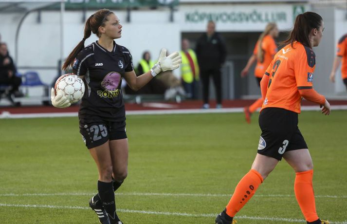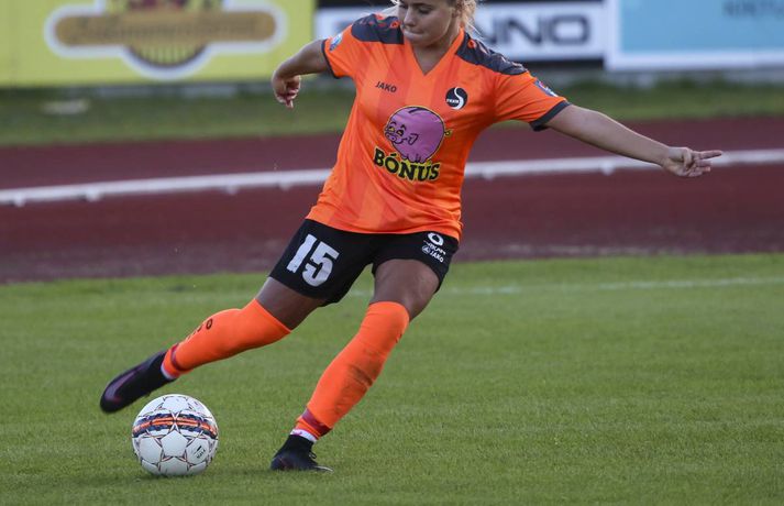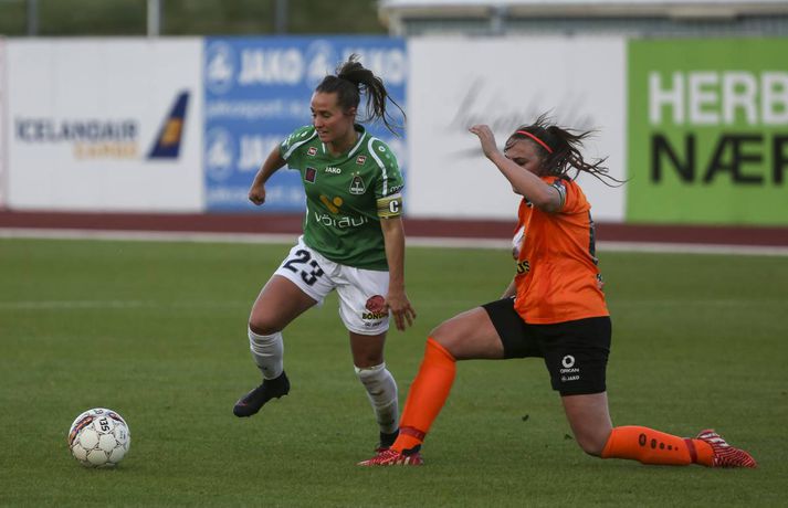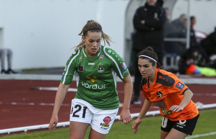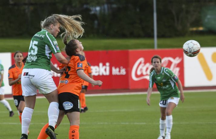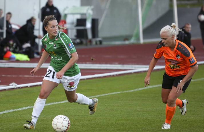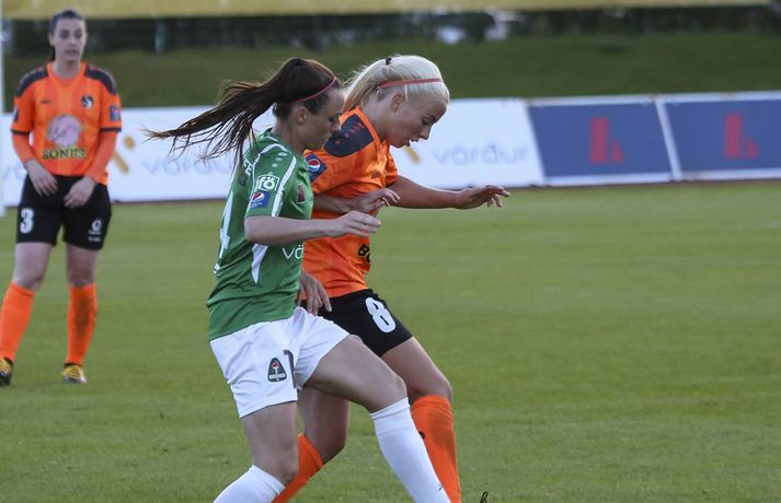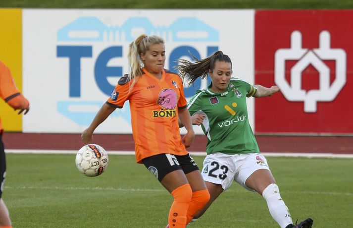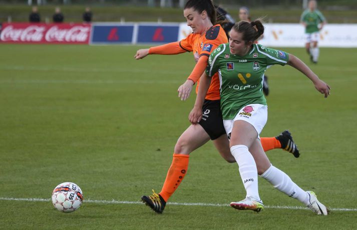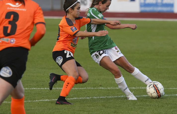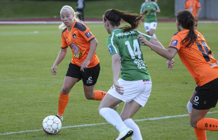 Breiðablik minnkaði forskot Stjörnunnar á toppi Pepsi-deildar kvenna niður í tvö stig með öruggum 4-0 sigri á Fylki í lokaleik 14. umferðar á Kópavogsvelli í kvöld.Ernir Eyjólfsson, ljósmyndari Fréttablaðsins og Vísis, var á Kópavogsvellinum í kvöld og tók meðfylgjandi myndir. Blikar gengu frá leiknum á fimm mínútna kafla snemma leiks þegar þær skoruðu þrjú mörk. Blikar voru á ferðinni í forkeppni Meistaradeildar Evrópu í Wales í síðustu viku en það var ekki að sjá að þátttakan sæti í leikmönnum Íslandsmeistaranna. Svava Rós Guðmundsdóttir braut ísinn á 14. mínútu og þremur mínútum síðar bætti Esther Rós Arnarsdóttir öðru marki við. Fyrirliðinn Rakel Hönnudóttir lagði bæði mörkin upp. Blikar tóku sér svo aðeins tveggja mínútna pásu áður en Hildur Antonsdóttir skoraði þriðja markið eftir stoðsendingu Fanndísar Friðriksdóttur. Ótrúlegur kafli hjá Íslandsmeisturunum og leik í raun lokið. Blikar fengu færi til að skora fleiri mörk en létu eitt duga. Það gerði hin nýsjálenska Olivia Chance á 76. mínútu eftir sendingu frá Svövu Rós. Lokatölur 4-0, Breiðabliki í vil Gríðarleg spenna er nú komin í toppbaráttu Pepsi-deildar kvenna eftir úrslitin í 14. umferð. Stjarnan er á toppnum með 34 stig, tveimur stigum meira en Breiðablik. Valur er svo í 3. sæti með 30 stig. Stjörnukonur og Blikar mætast í þarnæstu umferð og þá leiða Breiðablik og Valur saman hesta sína í lokaumferðinni.Upplýsingar um úrslit og markaskorara eru fengnar frá Fótbolta.net.vísir/ernir