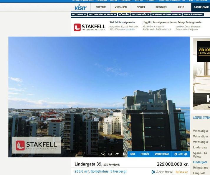 Á fasteignavef Vísis voru í gær 35 íbúðir í jafnt einbýlis- og fjölbýlishúsum auglýstar til sölu fyrir meira en 100 milljónir króna. Dýrasta eignin er glæný íbúð á tíundu hæð á Lindargötu 39. Tvær fasteignasölur bjóða íbúðina, önnur á 229 milljónir króna en hin á 211 milljónir. Íbúðin er 256 fermetrar með 109 fermetra þakgarði. „Mikið útsýni til sjávar og yfir Reykjavík og nágrenni,“ segir í auglýsingu fasteignasölunnar Stakfells. Talsvert er einmitt af íbúðum í nýjum eða nýlegum fjölbýlishúsum meðal dýrustu eignanna. Af áðurnefndum 35 eignum eru fimmtán í fjölbýlishúsum, nítján í einbýlishúsum og eitt raðhús er á listanum.Á Lindargötu 39 er íbúð sem kostar yfir 200 milljónir króna.Mynd/Visir.is fasteignirDýrasta einbýlishúsið stendur á sjávarlóðinni Skildinganesi 54. Það er 457 fermetrar og ásett verð er 189 milljónir króna. Hús á Fjólugötu 19, sem er lítið eitt minna, eða 421 fermetri, er til sölu fyrir 180 milljónir. Á Selbraut 1 á Seltjarnarnesi er 402 fermetra einbýlishús til sölu á 175 milljónir króna. Eina raðhúsið á listanum er í boði á 110 milljónir króna. Það er húsið Bakkavör 2 á Seltjarnarnesi. Það er 278 fermetrar að flatarmáli. Nokkuð er af eignum í nýjum hverfum. Í Kópavogi er til dæmis húsið Asparhvarf 16 á 149 milljónir. Eignin er samtals 501 fermetri. Inni í þeirri tölu er 60 fermetra hesthús.Fréttin birtist fyrst í FréttablaðinuNokkrar íbúðanna