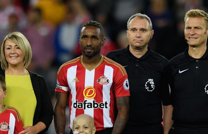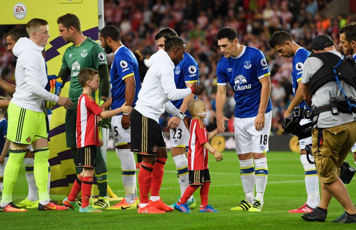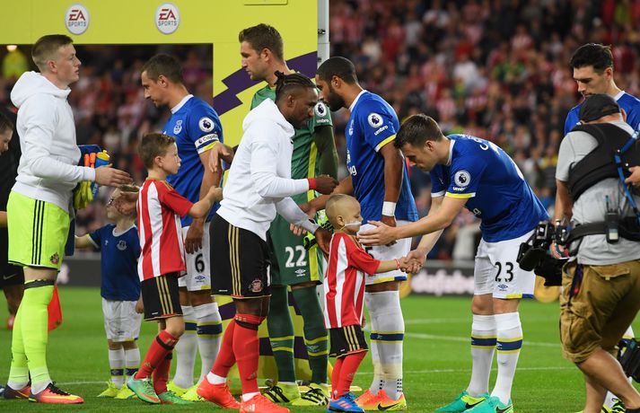 Bradley Lowery, fimm ára enskur drengur sem glímir við krabbamein, leiddi Jermain Defoe, fyrirliða Sunderland, inn á völlinn þegar liðið mætti Everton á Ljósvangi í kvöld. Bradley litli greindist með krabbamein þegar hann var aðeins eins árs. Hann gekkst undir viðamikla aðgerð árið 2014 þar sem meinið var fjarlægt. En krabbameinið lét aftur á sér kræla í sumar. Meðferðin sem Bradley þarfnast er ekki í boði í Bretlandi og hann þarf því að fara til Bandaríkjanna. Það kostar sitt, nánar tiltekið 700.000 pund, og fjölskylda Bradleys setti af stað söfnun fyrir meðferðinni. Bradley fékk að leiða Defoe inn á völlinn í kvöld og það vakti mikla athygli á söfnuninni. Eftir leikinn bárust svo fréttir af því að Everton hefði gefið 200.000 pund í söfnunina. Félagið greindi einnig frá því að Bradley yrði boðið á leik Everton og Sunderland á Goodison Park seinna á tímabilinu og að áritaðar treyjur frá leiknum í kvöld yrðu settar á uppboð til styrktar söfnuninni. Fjölmargir hafa lagt söfnuninni lið í kvöld en um 500.000 pund hafa þegar safnast.Everton Football Club has pledged a donation of £200,000 to support @Bradleysfight in his brave battle. Donate here: https://t.co/fxR5tYwG5L— Everton (@Everton) September 12, 2016