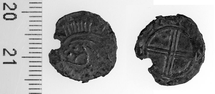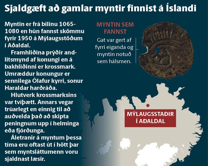 Mynt frá 11. öld skilað sextíu árum eftir fund Jóhann Óli Eiðsson skrifar 12. september 2016 06:45 grafík/birgitta Mynt frá því er Ólafur kyrri réð ríkjum yfir Íslandi var skilað til minjavarðar Norðurlands í síðustu viku. Peningurinn fannst skömmu eftir heimsstyrjöldina síðari en ástæða þess að honum var skilað nú er fréttaflutningur af fornminjafundi liðinnar viku. „Þetta er mynt sem hefur fylgt mér lengi. Ég held ég hafi fundið hana skömmu fyrir 1950,“ segir Hermann Jónsson, fyrrverandi hafnarvörður á Akureyri.Hermann Jónsson með myntina.„Ég var bara patti, um sjö ára að ég held, að leika mér að bílum í moldinni heima þegar ég rakst á hann. Einhverra hluta vegna ákvað ég að taka hann upp. Síðan þá hef ég geymt myntina.“ Hermann ólst upp á Mýlaugsstöðum í Aðaldal en flutti til Akureyrar árið 1963. Peningurinn var með í för. Hann segist lengi hafa ætlað sér að fara með hann til minjavarðar en það hafi alltaf gleymst þar til nú. „Ég fór með hann núna í síðustu viku eftir að það var sagt frá sverðinu sem fannst í Skaftárhreppi. Það var vítamínsprautan sem þurfti til,“ segir Hermann. Peningurinn er tæpir fimmtán millimetrar í þvermál og úr silfri. Fyrri eigandi hans hefur sennilega notað hann sem hálsmen því á einum stað í jaðri hans hefur verið gert lítið gat. Þar má ímynda sér að snæri hafi verið dregið í gegn og myntin sett um háls einhvers. „Peningurinn hefur örlítið látið á sjá síðan ég fann hann því ég man að fyrst þegar ég fann hann var gatið heilt. Hann hefur aðeins tærst upp en táknin á báðum hliðum sjást enn nokkur greinilega. Tíminn vinnur á honum líkt og öðrum hlutum.“ Mynt frá þessum tíma er afar fágæt, bæði hér á landi sem og í öðrum löndum, segir Anton Holt myntsérfræðingur. Þó hafa nokkrar slíkar fundist hér víða um land. „Það eru helst Þingvellir sem skera sig úr hvað fjölda fundinna mynta varðar enda fornleifauppgreftir þar verið reglulegir,“ segir Anton. Fréttin birtist fyrst í Fréttablaðinu. Birtist í Fréttablaðinu Tengdar fréttir Fleytti jafnvel kerlingar í Skaftárhlaupi í fyrra Þeim möguleika er nú velt upp að sverðið, sem fannst í Skaftárhreppi á dögunum, hafi aðeins legið þar í stutta stund. Hlaup í ánni gæti hafa numið það með sér og fært til. 10. september 2016 07:00 Fundu sverð sem gæti verið frá árinu 1000 Gæsaveiðimenn á skytterí um helgina fundu sverð sem Minjastofnun telur að gæti verið frá árinu 1000. 5. september 2016 10:46 Með merkari fornleifafundum síðustu ára "Það eru svo fá sverð sem hafa fundist hér og því er þetta mikill fengur fyrir sögu þjóðarinnar,“ dr. Kristín Huld Sigurðardóttir, forstöðumaður Minjastofnunar Íslands. 6. september 2016 07:00 Eigna má sverðið Hróari Tungugoða Sverðið er frá 10. öld fannst á slóðum sem þar sem bær goðorðsmannsins Hróars Tungugoða stóð mögulega. Prófessor emeritus í sagnfræði kastar fram þeirri tilgátu að höfðingi eins og Hróar hafi hugsanlega átt sverðið. 9. september 2016 07:00 Mest lesið Gæsluvarðhaldskröfu yfir Írisi hafnað Innlent Gapandi búrhval rak á land: „Heljarinnar skepna“ Innlent Fullkomin lending eftir sögulega ferð Erlent Ók á tæplega tvöföldum leyfilegum hraða Innlent Sólheimar segja upp þjónustusamningnum Innlent Útlit fyrir vorveður á næstu dögum Veður Segir Stefán hafa gert atlögu að friðhelgi einkalífs Innlent Landskjörstjórn telur spurningu Þorgerðar gildishlaðna Innlent Bein útsending: Artemis II á leiðinni heim Erlent „Þegar allt þrýtur þá ganga gerendur lengra og lengra“ Innlent Fleiri fréttir Fyrir þinginu að breyta svarmöguleikum þó enginn vafi leiki á umsóknarstöðu Til skoðunar að breyta svarmöguleikum á kjörseðli og sprenging í stofnun bókaklúbba Gæsluvarðhaldskröfu yfir Írisi hafnað Ók á tæplega tvöföldum leyfilegum hraða Spá enn vaxtahækkun í maí Gapandi búrhval rak á land: „Heljarinnar skepna“ Verzló hreppti hljóðnemann eftir sigur gegn MR Landskjörstjórn telur spurningu Þorgerðar gildishlaðna Góðan daginn býður góðan dag Óvæntur ríkisstjórnarfundur boðaður að kvöldi Sólheimar segja upp þjónustusamningnum „Þegar allt þrýtur þá ganga gerendur lengra og lengra“ Kristrún kynnir planið fyrir sveitarstjórnarkosningarnar Barátta við verðbólgu, eltihrellir og brugðist við breyttri Reynisfjöru Engir glæpir á bak við aukið sírenuvæl í borginni Bæjarfulltrúa í Grindavík misboðið: „Sleppið af okkur klónum“ Gabríel Douane í síbrotagæslu: Einn handtekinna vegna líkamsárásar í mars Bæjarstjóri Kópavogs lýsir yfir sárum vonbrigðum með efnahagsáætlun ríkisstjórnarinnar Börn flytji ekki til Grindavíkur á meðan óvissa varir Mikilvægt að tala saman, líka karlar Krefjast þess að framkvæmdir við Kaffistofuna verði stöðvaðar Bein útsending: Kynna áform um endurreisn Grindavíkur Guðmundarlundur á bólakafi Kona handtekin vegna dánartilkynningar í Morgunblaðinu Sömdu um starfslok bæjarstjóra Akraness Muni ekki fallast á tilmæli til barnafjölskyldna í Grindavík „Ný atvinnustefna Íslands markar tímamót“ Valkyrjurnar boða aðgerðir til að takast á við verðbólguna Nýtt framboð í Reykjavík á elleftu stundu Segir Stefán hafa gert atlögu að friðhelgi einkalífs Sjá meira