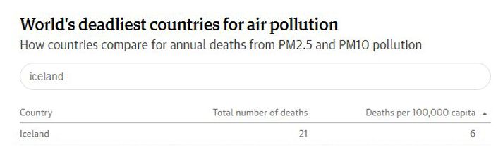 Tuttugu og einn Íslendingur lést árið 2012 af völdum loftmengunar, segir í nýútkominni skýrslu Alþjóðaheilbrigðismálastofnunarinnar (WHO). Ísland er þó eitt af fimm minnst menguðu ríkjum jarðar. Kína skipar efsta sætið yfir menguðustu lönd heims samkvæmt skýrslunni og hefur stofnunin lýst yfir áhyggjum vegna versnandi ástands. Sjá einnig:Tengsl á milli svifryks og ótímabærra andláta Þrjár milljónir manns létust árið 2012 vegna slæmra loftgæða utanhúss en sé innanhúss mengun talin með létust sjö milljónir manna. Þar af lést ein milljón í Kína, 600 þúsund á Indlandi og 140 þúsund í Rússlandi. Þá segir að níu af hverjum tíu andi að sér menguðu lofti og að níutíu og tvö prósent mannkyns búi á svæðum þar sem loftmengun fer yfir þau heilsu- og umhverfismörk sem stofnunin hefur sett. WHO segir að ástandið sé mun verra en áður hafi talið og að aðgerða sé þörf. Þorsteinn Jóhannsson, teymisstjóri hjá Umhverfisstofnun, sagði í samtali við Vísi í september í fyrra að um þrjátíu til sjötíu manns deyi hér á landi sökum mengunar. Dauðsföllin séu algengari á meðal fólks yfir miðjum aldri. „Almennt séð er staðreynd að loftmengun veldur ótímabærum dauðsföllum. Þá eru það sérstaklega hjartaáföll og heilablóðföll. Ef það koma háir mengunardagar þá er aukning á dauðsföllum af völdum þeirra sjúkdóma, dagana á eftir. Svo er líka annar þáttur sem er aukning á krabbameini. Þar sjá menn kannski ekki tengsl við ákveðna daga heldur eru þar einstaka mengunarefni sem eru há í ársmeðaltali,“ sagði Þorsteinn.