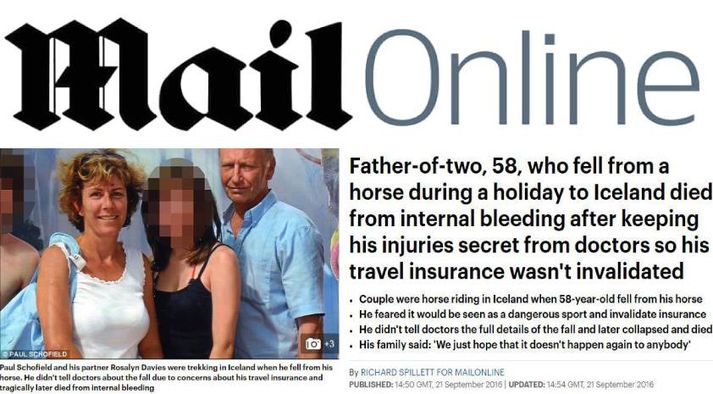 Fall af hestbaki á Íslandi olli dauða bresks manns Jakob Bjarnar skrifar 21. september 2016 16:36 Maðurinn þorði ekki að greina frá slysinu af ótta við að það hefði áhrif á tryggingar sínar. skjámyndir af Daily Mail Breskur maður andaðist eftir slys sem hann varð fyrir á Íslandi, en hann féll af hestbaki þegar hann var hér í fríi fyrir hálfu ári. Honum blæddi út vegna innvortis meiðsla sem hann hlaut við fallið. Maðurinn hélt slysinu og meiðslum sínum leyndum því hann taldi að það kynni að fella úr gildi ferðatryggingu sem hann hafði keypt.Daily Mail greinir frá þessu. Maðurinn heitir Paul Schofield, hann var 58 ára gamall tveggja barna faðir og hafði farið á spítala á Íslandi eftir atvikið. Þar hélt hann því fram að hann væri með brákuð rifbein. Hann óttaðist að tryggingafélagið myndi líta svo á að reiðtúrinn flokkaðist undir gáleysislegt athæfi. Þess í stað sagðist hann hafa runnið til á ösku, og dottið á gangstétt í Reykjavík. Læknarnir hugðu því ekki að sér og útskrifuðu hann með lyfseðil uppá verkjalyf. Hann hneig hins vegar niður þegar hann kom aftur í íbúðina í Reykjavík. Honum var þá ekið í snatri á Landspítala Háskólasjúkrahús með sjúkrabíl en dó eftir aðgerð. Rannsóknir leiddu í ljós að dánarorsökin var rifið milta. Schofield var frá Stockport í nágrenni Manchester og hafði hann keypt ferð til Íslands sem jólagjöf til sín sjálfs og Rosalyn Davies, konu sem hann var í sambandi með. Fóru þau til Íslands í leyfi í apríl á þessu ári. Eins og áður segir greinir Daily Mail frá þessu og þar má sjá talsvert ítarlegri umfjöllun um þessa ferð sem endaði svo hörmulega.Daily Mail fjallar ítarlega um málið í dag.skjámynd af Daily Mail Ferðamennska á Íslandi Tengdar fréttir Lögregla skoðar læknamistök á Landspítala Breskur karlmaður um fimmtugt lést á Landspítalanum um helgina að því er talið er vegna mistaka við umönnun. Lögregla hefur tekið skýrslu af þeim sem komu að meðferð sjúklingsins. 3. maí 2016 07:00 Talið að erlendur ferðamaður hafi látist vegna mistaka á Landspítala Erlendur karlmaður lést á Landspítalanum um helgina að því er talið er vegna mistaka við umönnun. Bæði landlækni og lögreglu var gert viðvart vegna málsins. Á hverju ári koma upp á bilinu átta til tólf mál á Landspítalanum þar sem dauðsföll eða varanlegur miski hljótast af mistökum starfsfólks. 2. maí 2016 18:45 Mest lesið Glæpir eiga ekki að borga sig: Gæti hagnast fjárhagslega á að hafa banað föður sínum Innlent „Ellibætur“ frá ríkinu eigi að heyra sögunni til Innlent Selfoss stöðvaður í Bretlandi Innlent Reyndu að koma útlendingafrumvarpi að á síðustu stundu Innlent Hæðist að og smánar fyrrverandi forseta á „frægðargangi“ Erlent Súlunesmálið: Skoða þurfi lög er varða þagnarskyldu Innlent Myndskeið birt af Reiner eftir morðin og fyrir handtöku Erlent Naustin án bíla og eins og „löber“ með íslensku prjónamynstri Innlent Sex hundruð miðar á vettvangi morðsins: „Fokking hálfvita fífl bæði tvö!!!!“ Innlent Deildar meiningar um tölvupóst sem óvart var sendur á alla í nefndinni Innlent Fleiri fréttir Mikið álag á bráðamóttökunni á Akureyri Magnús Þór sjálfkjörinn Fimm ára dómur fyrir hnífaárás á fjölskylduföður Telur hagræðingaráformin þau metnaðarfyllstu Nauðsyn að skýra betur hvort eða hvenær læknar megi rjúfa þagnarskyldu Selfyssingar í 60 plús heilsueflingu klárir í jólin Skoða að koma á ferjusamgöngum milli Skotlands og Seyðisfjarðar Viðreisn gæti reynst í lykilstöðu milli blokkanna Barnavernd fylgist með fleiri ófrískum konum í neyslu en síðustu ár Fleiri óléttar konur í neyslu á borði barnaverndar og spennandi kosningar framundan Langvarandi einangrun ungrar konu gagnrýnd af Amnesty Selfoss stöðvaður í Bretlandi Þrettán nýir rafknúnir strætisvagnar teknir í notkun Zuism tekið af trúfélagaská eftir áralöng svik og pretti Mun áfram leiða lista Framsóknar í Múlaþingi Töpuðu 133 milljónum króna á kosningaári Reyndu að koma útlendingafrumvarpi að á síðustu stundu Súlunesmálið: Skoða þurfi lög er varða þagnarskyldu Samþykktu tillögu um uppbyggingu á Sorpu-lóð við Dalveg Spurningum Sigmundar Ernis svarað og málið ekki aftur í nefnd Þingstörfin á lokametrunum og styttist í jólafrí Naustin án bíla og eins og „löber“ með íslensku prjónamynstri Taka enn tuttugu þúsund króna beygju Ekið á kyrrstæðan bíl á Suðurstrandarvegi „Ellibætur“ frá ríkinu eigi að heyra sögunni til Áttu að taka tillit til þess að talsmaðurinn klikkaði Guðrún vinsælli en Agnes og traust til kirkjunnar á uppleið Glæpir eiga ekki að borga sig: Gæti hagnast fjárhagslega á að hafa banað föður sínum Björg býður ungliðum til fundar Verði húsið rifið verði fyrst að óska þess að friðun verði afnumin Sjá meira