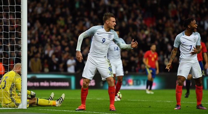 England var aðeins hársbreidd frá því að vinna Spán í vináttulandsleik á Wembley í kvöld. Lokatölur 2-2. Englendingar voru 2-0 yfir þegar ein mínúta var til leiksloka. Iago Aspas, fyrrum leikmaður Liverpool, minnkaði þá muninn í 2-1 og þegar sex mínútur voru komnar fram yfir venjulegan leiktíma jafnaði Isco metin með skoti úr þröngu færi sem Tom Heaton, markvörður Englands, hefði líklega átt að verja. Þetta var fjórði leikur Englands undir stjórn Gareths Southgate og hann byrjaði frábærlega fyrir enska liðið. Á 9. mínútu felldi Pepe Reina, markvörður Spánverjar, Jamie Vardy innan teigs og vítaspyrna dæmd. Adam Lallana fór á punktinn og skoraði af öryggi, sitt þriðja mark í síðustu þremur landsleikjum. Staðan var 1-0 í hálfleik en eftir aðeins þriggja mínútna leik í seinni hálfleik skoraði Vardy annað mark Englendinga með flugskalla eftir fyrirgjöf Jordans Henderson, sem bar fyrirliðabandið í fjarveru Waynes Rooney. England hafði ágætis tök á leiknum framan af seinni hálfleik en undir lokin gáfu gestirnir í og náðu að koma til baka eins og áður sagði. England er samt enn ósigrað undir stjórn Southgates.England 1-0 Spánn England 2-0 Spánn England 2-1 Spánn