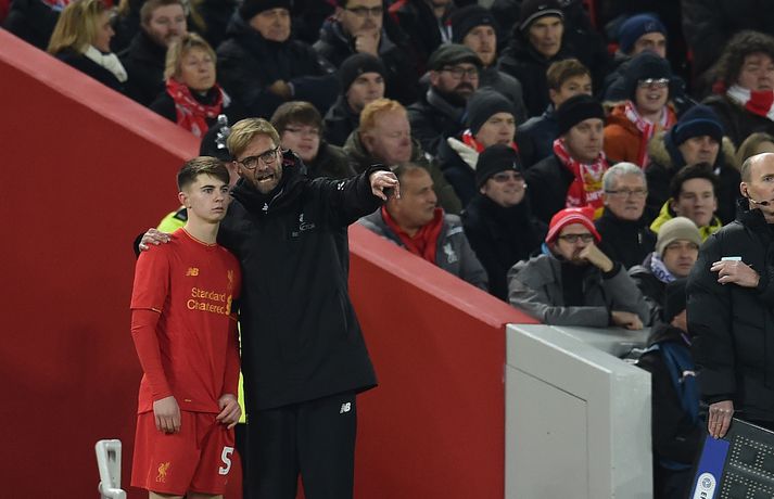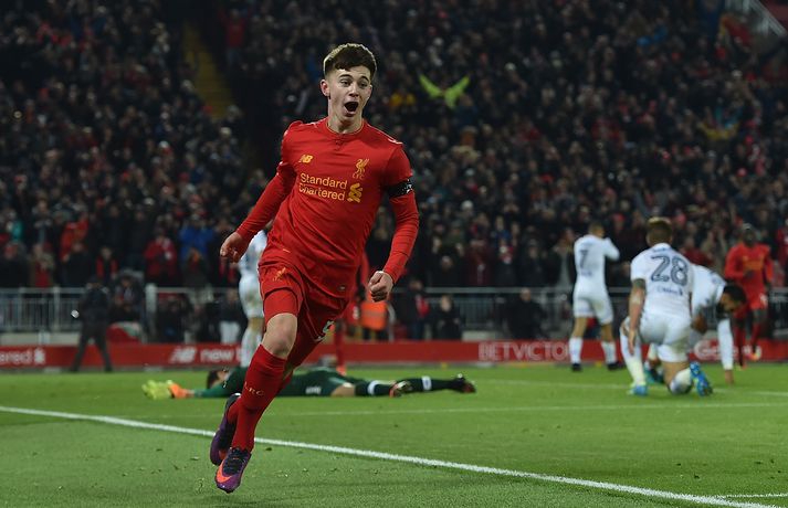 Söguleg stund á Anfield í kvöld | Sjáðu markið hjá Woodburn Ingvi Þór Sæmundsson skrifar 29. nóvember 2016 22:10 Woodburn fagnaði vel og innilega eftir að hafa þrumað boltanum upp í þaknetið á marki Leeds. vísir/getty Ben Woodburn gleymir leik Liverpool og Leeds United í 8-liða úrslitum enska deildabikarsins í kvöld eflaust ekki í bráð. Þessi efnilegi Walesverji, sem varð 17 ára 15. október síðastliðinn, lék sinn fyrsta leik fyrir aðallið Liverpool þegar hann kom inn á sem varamaður í 2-0 sigri á Sunderland á laugardaginn. Woodburn fékk annað tækifæri gegn Leeds í kvöld en hann kom inn á fyrir Kevin Stewart á 67. mínútu. Tíu mínútum síðar kom Divock Origi Liverpool yfir. Belgíski framherjinn stýrði þá fyrirgjöf hins efnilega Trents Alexander-Arnold í netið. Á 81. mínútu var svo komið að Woodburn sem rak smiðshöggið á frábæra sókn Liverpool með skoti upp í þaknetið. Strákurinn réði sér ekki fyrir kæti eftir að hafa skorað, og það skiljanlega. Markið var sögulegt í meira lagi því Woodburn er yngsti markaskorari í sögu Liverpool. Hann sló met Michaels Owen um 98 daga. Owen var 17 ára og 143 daga gamall þegar hann skoraði gegn Wimbledon 6. maí 1997. Owen óskaði markaskoranum unga, sem tók metið af honum, til hamingju á Twitter í kvöld eins og sjá má hér að neðan.Another record taken from me!!! Congratulations @BenWoodburn on becoming the youngest ever scorer for @LFC at 17yrs and 45days. #KopEnd— michael owen (@themichaelowen) November 29, 2016 Enski boltinn Tengdar fréttir Origi og Milner kláruðu Sunderland | Sjáðu mörkin Það tók Liverpool 75 mínútur að komast yfir gegn Sunderland á heimavelli í dag, en lokatölur urðu 2-0 sigur Liverpool. 26. nóvember 2016 16:45 Hazard: Manchester City og Liverpool Eden Hazard, leikmaður Chelsea, telur að Chelsea muni berjast um enska meistaratitilinn við Manchester City og Liverpool en einu stig munar nú á þessum þremur efstu liðum ensku úrvalsdeildarinnar. 28. nóvember 2016 11:30 Coutinho ekki meira með á árinu 2016 Jürgen Klopp, knattspyrnustjóri Liverpool, hefur staðfest að Philippe Coutinho muni ekki spila meira á þessu ári. 29. nóvember 2016 21:18 Ungu strákarnir hjá Liverpool sáu um Leeds | Sjáðu mörkin Liverpool er komið áfram í undanúrslit enska deildabikarsins eftir 2-0 sigur á Leeds United á Anfield í kvöld. 29. nóvember 2016 21:55 Mest lesið Syrgja átján ára fimleikakonu Sport Arnar Þór ráðinn til FIFA: „Himinlifandi að hafa fengið þetta starf“ Fótbolti Fyrsta mark Wirtz í þriðja sigrinum í röð Enski boltinn Hafnaði 34 milljónum: „Vil ekki styðja kerfi sem býr til fíkn og eyðileggur líf“ Sport Írar ætli að fylgja eftir tillögu Heimis Fótbolti Watkins hélt ótrúlegri sigurgöngu Villa áfram Enski boltinn Arsenal aftur á toppinn Enski boltinn Gerir grín að klæðaburði liðsfélaga síns Körfubolti Salah sakaður um dýfu: „Getum ekki keppt við Egypta og dómarana“ Fótbolti Haukur náði hundrað og hundrað fyrir EM Handbolti Fleiri fréttir Liverpool-skotmarkið ekki á förum í janúar Aldrei spilað þarna en sagði strax já „Viss um að ég myndi skora einn daginn“ Watkins hélt ótrúlegri sigurgöngu Villa áfram Schade og Jiménez sendu Brentford og Fulham í efri hlutann Arsenal aftur á toppinn Fyrsta mark Wirtz í þriðja sigrinum í röð Cherki aðalmaðurinn í sigri City Úlfarnir heiðruðu minningu Jota Andri Lucas frá í mánuð Sjáðu dönsku þrumuna sem færði United-mönnum öll þrjú stigin Segir að Arsenal stefni á sögulega fernu á þessu tímabili Amorim endaði viðtalið á gamansömum nótum „Við eigum heima í Evrópu“ Daninn skaut Man. United upp fyrir Liverpool Amorim segir strákinn í frystinum vera framtíðin hjá Man. United Martinez með fyrirliðabandið og báðir Fletcher-bræðurnir á bekknum Havertz gæti snúið aftur á næstu dögum Alfons og Willum sáu tvö rauð spjöld fara á loft Synir Diogo Jota leiða leikmenn út á Anfield Cunha vill skemmta og Howe treystir leikmönnum United horfir til Þýskalands eftir höfnun Semenyo Haaland stóðst vigtun eftir jólin Hápunktarnir hingað til í enska boltanum Goðsögn fallin frá Kærður af knattspyrnusambandinu Bestu jólamörkin: Drogba, Scholes eða Giroud? Van de Ven bað Isak afsökunar: „Vildi ekki meiða hann“ Hvers vegna heillast stórliðin svo af Semenyo? Stewart, Snoop og Modric í eina sæng Sjá meira