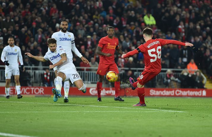 Ben Woodburn gleymir leik Liverpool og Leeds United í 8-liða úrslitum enska deildabikarsins í kvöld eflaust ekki í bráð. Þessi efnilegi Walesverji, sem varð 17 ára 15. október síðastliðinn, lék sinn fyrsta leik fyrir aðallið Liverpool þegar hann kom inn á sem varamaður í 2-0 sigri á Sunderland á laugardaginn. Woodburn fékk annað tækifæri gegn Leeds í kvöld en hann kom inn á fyrir Kevin Stewart á 67. mínútu. Tíu mínútum síðar kom Divock Origi Liverpool yfir. Belgíski framherjinn stýrði þá fyrirgjöf hins efnilega Trents Alexander-Arnold í netið. Á 81. mínútu var svo komið að Woodburn sem rak smiðshöggið á frábæra sókn Liverpool með skoti upp í þaknetið. Strákurinn réði sér ekki fyrir kæti eftir að hafa skorað, og það skiljanlega. Markið var sögulegt í meira lagi því Woodburn er yngsti markaskorari í sögu Liverpool. Hann sló met Michaels Owen um 98 daga. Owen var 17 ára og 143 daga gamall þegar hann skoraði gegn Wimbledon 6. maí 1997. Owen óskaði markaskoranum unga, sem tók metið af honum, til hamingju á Twitter í kvöld eins og sjá má hér að neðan.Another record taken from me!!! Congratulations @BenWoodburn on becoming the youngest ever scorer for @LFC at 17yrs and 45days. #KopEnd— michael owen (@themichaelowen) November 29, 2016