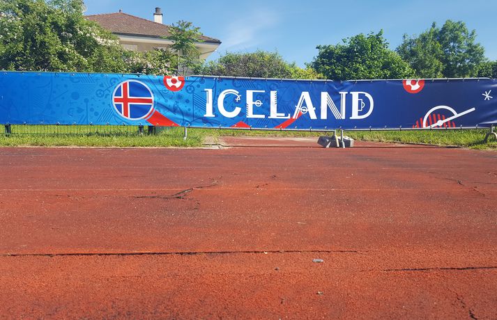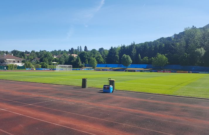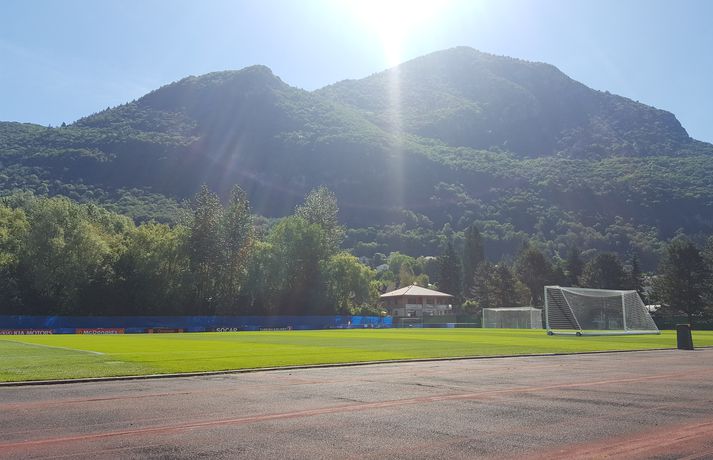Strákarnir okkar æfa í dag í þriðja skiptið á æfingavellinum í Annecy í austurhluta Frakklands þar sem íslenska landsliðið dvelur á milli leikja á EM í Frakklandi. Í dag verður opin æfing fyrir almenning og fjölmiðla og er búist við um 400 manns á æfinguna, samkvæmt upplýsingum heimamanna. Fulltrúar Vísis eru komnir á svæðið og munu fylgja íslenska liðinu náið eftir og flytja fréttir af því í öllum okkar miðlum. Meðfylgjandi eru myndir sem voru teknar af æfingasvæðinu í morgun.