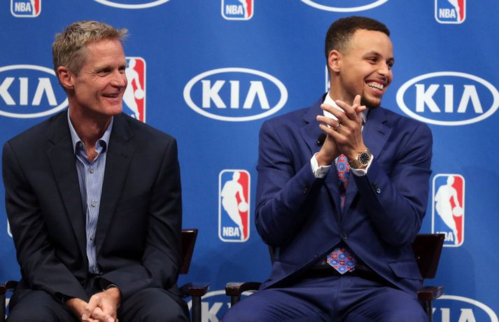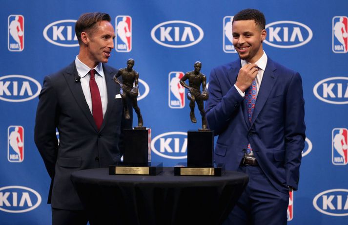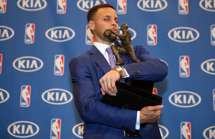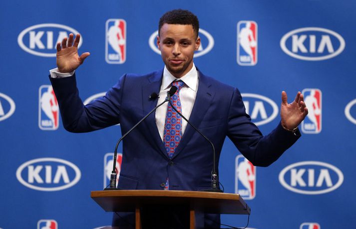Sjáðu ræðuna hans Stephen Curry í gær | Myndband Óskar Ófeigur Jónsson skrifar 11. maí 2016 09:15 Stephen Curry. Vísir/Getty Stephen Curry, leikstjórnandi Golden State Warriors, var í gær valinn besti leikmaður NBA-deildarinnar annað árið í röð. Það var ekki nóg með að þessi litli og netti bakvörður tæki þessi verðlaun annað árið í röð heldur varð hann sá fyrsti í sögunni til að fá öll atkvæði í boði. 130 fjölmiðlamenn sem starfa við það að fjalla um NBA-deildina að staðaldri tóku þátt í kjörinu og allir settu Stephen Curry í fyrsta sætið. Stephen Curry átti líka stórbrotið tímabil, leiddi deildina í stigum (30,1 í leik), þriggja stiga körfum (403), stolnum boltum (2,1) og vítanýtingu (90,8 prósent) auk þess að vera í öðru sæti yfir bestu þriggja stiga nýtingu (45,4 prósent) þrátt fyrir að skora 5,4 þrista að meðaltali í leik. Stephen Curry bætti stigaskor sitt um 6,3 stig frá því í fyrra þegar hann var líka kosinn bestur en enginn leikmaður sem var valinn bestur hefur náð að bæta sig jafnmikið í stigaskori á næsta tímabili á eftir. Stephen Curry fékk verðlaunin daginn eftir að hann snéri til baka eftir meiðsli sem kostuðu hann fjóra leiki. Stephen Curry skoraði 40 stig í fyrsta leiknum eftir að hafa komið inn af bekknum og setti nýtt NBA-met með því að skora 17 stig í fimm mínútna framlengingu. Það er orðið mikil hefð fyrir því að þeir leikmenn sem eru kosnir bestir í NBA haldi eftirminnilegar og dramatískar ræður og hér fyrir neðan má sjá ræðu Stephen Curry frá því í gær. NBA Mest lesið Vonast til að komast í Kórinn: „Menn hafa aldrei séð annað eins“ Fótbolti Landsleiknum aflýst og framhaldið óljóst Fótbolti Fær þrjár milljónir á dag næstu sex árin fyrir að gera ekkert Sport Stöðufundur í Laugardal klukkan 10:30 Fótbolti Enska úrvalsdeildin í jólaköttinn Enski boltinn Elsta konan til klára Járnkarlinn Sport Landsliðskonur aðstoðuðu ökumenn í vanda Fótbolti Markvörður Inter banaði háöldruðum manni í hjólastól Sport Birnir frá Akureyri í Garðabæ Íslenski boltinn Segir að Slot verði að taka tvo leikmenn út úr Liverpool-liðinu Enski boltinn Fleiri fréttir Öllum leikjum Bónus-deildar kvenna í kvöld frestað Stólarnir ekki í vandræðum á Egilsstöðum Enginn Lakers-maður hafði náð þessu í meira en 52 ár Veðmál rædd í Körfuboltakvöldi: „Bara ævintýralega heimskulegt“ Kvöddu húsið og Nablinn klifraði í kveðjuskyni Martin naut sín í fræknum sigri á meisturum Bayern Tryggvi lykilmaður í sigri Bilbao Elvar skoraði tólf í naumu tapi Tilþrifin: Varin skot og ótrúlegar körfur Valsmanna Þriðja tapið í röð hjá Jóni og félögum Fáránlegt eða klókt hjá Kristófer? „Ef það má þá gerir fólk það“ Brassi tekur við af Billups „Það er æðislegt að kveðja húsið svona“ Uppgjörið: ÍA - Álftanes 76-74 | ÍA kvaddi Vesturgötuna með stæl Uppgjörið: Stjarnan - ÍR 91-93 | ÍR skellti meisturunum „Ekki æskilegt og ekki það sem körfuboltinn vill standa fyrir“ Nær fimmtán árum og ætlar með Ísland á HM Stjórnarmaður KKÍ auglýsir ólöglega veðmálastarfsemi Handtökur í NBA: Lak upplýsingum um meiðsli James og bað um bita af kökunni Mál Kristófers enn til skoðunar og fleiri komin á borð KKÍ Uppgjörið: Ármann-Keflavík 94-107 | Öruggt hjá Keflvíkingum Daníel: Ég fór í smá ævintýra starfsemi Uppgjörið: Þór Þ. - Valur 117-119 | Vals sigur eftir tvær framlengingar Uppgjörið: Njarðvík-Tindastóll 98-90 | Njarðvíkingar skelltu Stólunum Átti sumar engu öðru líkt „Ég held að bæði lið séu ekkert himinlifandi með sína frammistöðu“ Uppgjörið: Grindavík-KR 78-77 | Arnór Tristan með sigurkörfuna Þjálfari og leikmaður í NBA handteknir Sá eftirsóttasti treystir bara á pabba gamla Þrenna Maddie Sutton dugði ekki á Hlíðarenda Sjá meira
