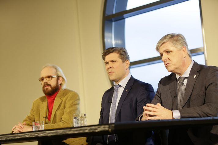 Svona skiptast ráðuneytin á milli flokkanna sunna karen sigurþórsdóttir skrifar 10. janúar 2017 14:54 vísir/ernir Formenn stjórnarflokkanna þriggja tilkynntu á fundi sínum í Gerðarsafni í dag hvernig ráðuneytinum verður skipt á milli flokkanna. Ráðherraskipan hefur þó ekki verið tilkynnt. Sjálfstæðisflokkurinn fær alls sex ráðherra og tekur við forsætisráðuneytinu, utanríkisráðuneytinu, innanríkisráðuneytinu, menntamálaráðuneytinu auk þess sem flokkurinn mun fara fyrir ráðuneyti ferðamála, iðnaðar og nýsköpunar. Innanríkisráðuneytinu verður skipt í tvennt og munu þar starfa tveir ráðherrar, annars vegar á sviði samskipta, fjarskipta og sveitarstjórnarmála og hinn á sviði dómsmála. Viðreisn fær þrjá ráðherra og tekur við fjármálaráðuneytinu, landbúnaðar- og sjávarútvegsráðuneytinu auk félagsmálahluta velferðaráðuneytisins, en Björt framtíð fer með heilbrigðishluta þess ráðuneytis. Þá tekur Björt framtíð við umhverfisráðuneytinu og heilbrigðisráðuneytinu. Hér fyrir neðan má sjá upptöku af blaðamannafundinum sem Óttarr Proppé, formaður Bjartrar framtíðar, Bjarni Benediktsson, formaður Sjálfstæðisflokksins og Benedikt Jóhannesson, formaður Viðreisnar, héldu í Gerðarsafni í Kópavogi fyrr í dag.Þá hefur Vísir fylgst náið með gangi mála í Vaktinni í allan dag eins og sjá má að neðan. Kosningar 2016 Mest lesið Virðist ekki vera hægt á Íslandi Innlent Hiti geti mest náð átján stigum Veður Hyggst kæra dyraverði Auto til lögreglu Innlent „Ótrúlega sorglegt að pabbi sé búinn að vera svona lengi í þessari stöðu“ Innlent Ný könnun Maskínu: „Væri alveg ný staða í íslenskum stjórnmálum“ Innlent Gaf fingurinn á Miklubraut Innlent Stytting framhjá Blönduósi ekki á samgönguáætlun Innlent „Bandaríkin eiga ekki að taka yfir Grænland“ Erlent Breiddi út faðminn fyrir rasista: „Þið þurfið ekki að biðjast afsökunar á að vera hvít lengur“ Erlent „Ég hef aldrei upplifað annan eins harm“ Innlent Fleiri fréttir Virðist ekki vera hægt á Íslandi Stytting framhjá Blönduósi ekki á samgönguáætlun Vestmannaeyingar fá að eiga Vestmannaeyjar Hyggst kæra dyraverði Auto til lögreglu „Ótrúlega sorglegt að pabbi sé búinn að vera svona lengi í þessari stöðu“ Höfðu samband við dönsku herstjórnina á Grænlandi Ný könnun Maskínu: „Væri alveg ný staða í íslenskum stjórnmálum“ Glæný Maskínukönnun og jólaóveður Ársæll hringdi beint í utanríkisráðherra eftir fundinn Ósannað að fimmtán ára stúlka hafi stungið sextán ára pilt tvisvar Sameina Farice, Öryggisfjarskipti og hluta Neyðarlínunnar Gaf fingurinn á Miklubraut Birtir drög að lögum um lagareldi: Hyggst leggja niður Fiskeldissjóð Hundrað og fjörutíu milljarða bótakrafa á Samherja sé súrrealísk Skemmdir í kirkjugörðum vegna aksturs utan vegar Ólýsanlegur harmur fyrir fjölskylduna og söfnun hleypt af stokkunum „Ég hef aldrei upplifað annan eins harm“ Vill leiða lista Sjálfstæðismanna í Reykjanesbæ „Þetta hefur verið þungur tími“ Naut aðstoðar samskiptasérfræðinga vegna veiðigjaldamálsins Hrindir af stað söfnun fyrir móður stúlkunnar sem lést í Suður-Afríku Varð vitni að ótrúlegum norðurljósum: „Mér fannst þetta magnað“ Færir nýársboðið fram á þrettándann Fjórir fluttir á sjúkrahús eftir bílveltu á Suðurlandi Leggur aftur til hverfislögreglustöð í Breiðholti Nú má heita Love, Tóní, Ranimosk og Draumur Kvartar til umboðsmanns og vonar að Vegagerðin sjái að sér Ætlar ekki að beita sér í máli starfsmanns Útlendingastofnunar „Ég vil ekki nokkurn tímann sjá neitt svona aftur“ Gyðingar á Íslandi upplifa aukinn ótta Sjá meira