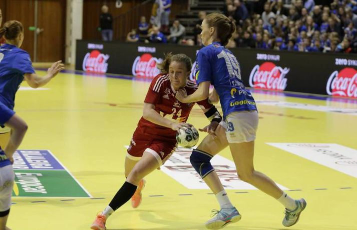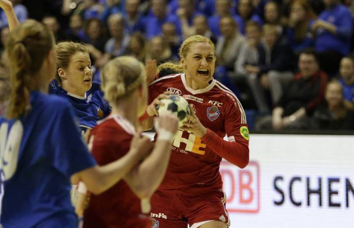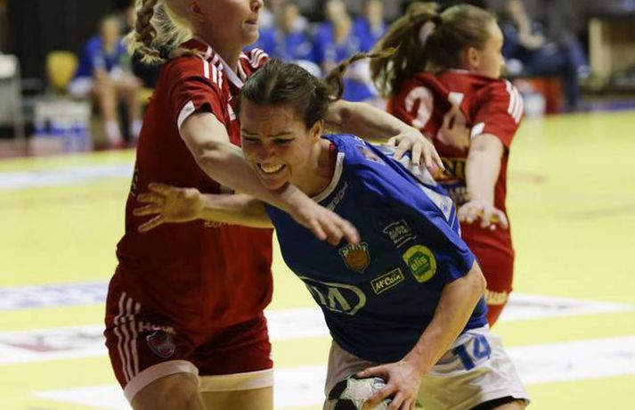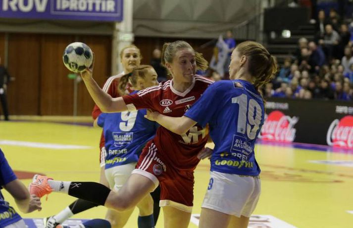 Fram mætir Stjörnunni í úrslitum Coca-Cola bikars kvenna í handbolta eftir 28-21 sigur á Haukum í undanúrslitum í Laugardalshöll í kvöld. Fram var 12-9 yfir í hálfleik.Hanna Andrésdóttir, ljósmyndari Fréttablaðsins og Vísis, var í Laugardalshöllinni í kvöld og tók meðfylgjandi myndir. Fram byrjaði leikinn mun betur. Haukar skoruðu þriðja mark sitt ekki fyrr en á 17. mínútu en þá hafði Fram náði fjögurra marka forystu. Haukar náðu að minnka muninn í eitt mark þegar fimm mínútur voru til hálfleiks en Fram náði að auka forystu sína í þrjú mörk fyrir hálfleik. Haukar áttu í miklum vandræðum gegn sterkri vörn Fram og fyrir aftan vörnina var Guðrún Ósk Maríasdóttir í miklu stuði. Elín Jóna Þorsteinsdóttir markvörður Hauka hélt sínu liði inni í leiknum í fyrri hálfleik með góðri markvörslu en hún varði ófá dauðafærin. Fram byrjaði seinni hálfleikinn einnig af krafti og náði mest sjö marka forystu þegar 19 mínútur voru eftir af leiknum. Haukar skoruðu aðeins 12 mörk fyrstu 40 mínútur leiksins sem er til marks um frábæra vörn Fram í leiknum. Haukar treystu um of á Ramune Pekarskyte í sóknarleiknum og þurfti hún á mun meiri hjálp að halda í leiknum. Haukar náðu þó að minnka muninn í tvö mörk en hafði ekki kraft til að komast nær Fram sem sigldi á ný framúr undir lok leiksins og vann að lokum sannfærandi sigur. Eins og áður segir voru markverðir liðanna öflugir og Ramune bar sóknarleik Hauka uppi. Hildur Þorgeirsdóttir átti greiða leið að marki Hauka framan af leik og Steinunn Björnsdóttir skilaði sínu að vanda. Það var þó Hafdís Iura sem stal senunni með frábærri innkomu í leikinn í seinni hálfleik en hún og Ragnheiður Júlíusdóttir skoruðu 4 mörk hvor seint í leiknum. Fram mætir Stjörnunni í úrslitaleiknum á laugardaginn klukkan 13.30 í Laugardalshöllinni.Steinunn: Góð tilfinning að vera hér Það sást langar leiðir að Fram hungraði virkilega mikið að fara alla leið í úrslitaleikinn hið minnsta og það tók Steinunn Björnsdóttir fyrirliði Fram undir. „Já klárlega. Það er langt síðan við vorum hér síðast. Tilfinningin að vera hér er góð og okkur langaði að vera hér eins lengi og við getum,“ sagði Steinunn. Fram náði sjö marka forystu snemma í seinni hálfleik en Haukar náðu að minnka muninn í tvö mörk. „Við missum þetta aðeins niður. Ég fékk að sjálfsögðu heimskulegar tvær mínútur en við sýnum karakter að koma til baka og vinna leikinn með sjö mörkum.“ Fram byrjaði leikinn með framliggjandi vörn sem skilaði þeim árangri að Haukar skoruðu sitt þrjðja mark ekki fyrr en á 17. mínútu. „Við komum þeim jafnvel á óvart með að byrja í 3-3 vörn. Þær voru kannski ekki tilbúnar í það og þá náum við sjálfstrausti í okkar leik og náum að halda það út. „Þær skora bara 12 mörk á 40 mínútum sem sýnir hve góða vörn við vorum að spila og Guðrún (Ósk Maríasdóttir) er alltaf jafn sterk fyrir aftan,“ sagði Steinunn. Fram tapaði fyrstu tveimur leikjum sínum á tímabilinu áður en liðið vann síðasta leik sinn fyrir bikarúrslitahelgina. „Við misstum aðeins jafnvægið í tveimur deildarleikjum en náum svo að vinna Gróttu sannfærandi og virðumst vera komnar á gott skrið aftur. „Við erum gríðarlega ánægðar með að vera komnar áfram. Við höfum spilað tvo mjög spennandi leiki við Stjörnuna í vetur og þetta verður skemmtilegur leikur,“ sagði Steinunn að lokum um úrslitaleikinn sem er framundan á laugardaginn.Karen: Tökum rugl ákvarðanir Haukar skoruðu aðeins tvö mörk fyrstu 16 mínúturnar í kvöld en Karen Helga Díönudóttir vill alls ekki meina að of hátt spennustig sé ástæða slakrar byrjunar liðsins. „Nei, það getur ekki verið afsökun. Við erum að gera þetta í fjórða skipti. Það er ekki hægt að fela sig á bakvið það,“ sagði Karen. „Við förum ekki nógu vel eftir skipulaginu. Við vissum nákvæmlega hvað þær voru að fara að gera. Við vissum að Hildur ætti að skjóta. Við mætum henni ekki og hún hittir. Þá er þetta erfitt.“ Fram byrjaði leikinn spilandi 3-3 vörn sem virtist slá Hauka útaf laginu. Karen segir að þetta hefði samt ekki átt að koma Haukum á óvart. „Þær hafa gert þetta nokkrum sinnum á móti okkur áður. Þetta ætti ekki að koma okkur á óvart þó þetta liti út fyrir að hafa gert það,“ sagði Karen. Haukar náðu að minnka muninn í tvö mörk þegar innan við tíu mínútur voru eftir af leiknum en það vantaði herslumuninn hjá liðinu að koma sér enn nær eða jafna leikinn. „Mér finnst við taka óþarfa ákvarðanir þegar við erum á grensunni. Við tökum rugl ákvarðanir í sóknarleiknum og gerum asnaleg mistök sem við eigum ekki að gera á þessu stigi. „Varnarlega létum við ekki finna nógu vel fyrir okkur. Þá er lítið hægt að gera og þær voru bara betri,“ sagði Karen að lokum.Steinunn í harðri baráttu við Karenu Helgu Díönudóttur.vísir/hannaKaren Helga reynir skot að marki Fram.vísir/hanna