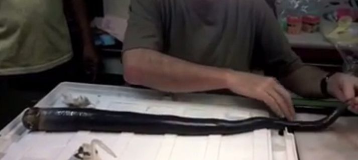 Gríðarstór, langlífur maðkur fannst í fyrsta skipti Kristín Ólafsdóttir skrifar 18. apríl 2017 18:29 Skjáskot Lifandi eintök af hinum sjaldgæfa risatrjámaðki (giant shipworm) hafa fundist í fyrsta skipti. BBC greinir frá. Maðkurinn, sem getur orðið allt að 155 sentímetrar að lengd, hefst við í harðri skel, sem eftirsótt er meðal safnara. Vísindamenn hafa lengi verið meðvitaðir um tilvist tegundarinnar en þetta er í fyrsta skipti sem eintök finnast á lífi. Þrátt fyrir nafngiftina er risavaxni trjámaðkurinn skyldari skelfiskum og kræklingum en ormum. Hann tilheyrir hópi samloka (bivalves) og nær hæstum aldri allra tegunda innan hópsins. Daniel Distel, höfundur skýrslu um maðkinn, sagði að eftir þrotlausa leit í fræðiritum hafi maðkurinn komið í leitirnar eftir að nemandi hans fann myndband af einum slíkum á YouTube. Í kjölfarið hélt hópur vísindamanna til Filippseyja, nánar tiltekið til Mindanao, þar sem fimm lifandi risatrjámaðkar fundust. Áður höfðu einu upplýsingarnar um maðkinn verið fengnar úr teikningum og illa varðveittu sýni frá sjöunda áratug síðustu aldar.Hér fyrir neðan má sjá krufningu á einum risatrjámaðkanna. Myndbandið er ekki fyrir klígjugjarna! Mest lesið „Liggur maður þarna á jörðinni og það var verið að berja hann í stöppu“ Innlent „Koma einhverjir strákar og svo fer allt í háaloft“ Innlent „Dorrit og eiginmaður hennar frá Íslandi eru hér“ Innlent Björg sökuð um brot á kosningareglum Viðreisnar Innlent „Erum rétt byrjuð að sjá ofan í þennan forarpytt“ Erlent Fjöldi ásakana um brot gegn barnungum stúlkum Erlent Mette-Marit biðst afsökunar á tengslum sínum við Epstein Erlent „Mjög áhugaverð umræða“ Innlent Nýbirt skjöl varpa ljósi á dánarstund Epstein Erlent Fífldjarft að fara í formanninn en varaformannsembættið...? Innlent Fleiri fréttir Mette-Marit biðst afsökunar á tengslum sínum við Epstein „Erum rétt byrjuð að sjá ofan í þennan forarpytt“ Fjöldi ásakana um brot gegn barnungum stúlkum Nýbirt skjöl varpa ljósi á dánarstund Epstein Ákæru fyrir manndráp vísað frá Trump útnefnir Warsh sem næsta seðlabankastjóra Tíu ákærðir fyrir að drepa friðaða úlfa Trump vill hafa Pútín og Xi út af fyrir sig Hýdd 140 sinnum fyrir áfengisneyslu og kynlíf utan hjónabands Trump segir Pútín hafa samþykkt hlé á árásum á Kænugarð Njósnastjóri Trumps leitar að kosningasvindli Reyndi að frelsa Mangione vopnaður pítsaskera Saksóknarar hóta uppreisn í Minneapolis „Hættulegasti maður Noregs“ fannst látinn í fangaklefa Segir Venesúela munu þurfa að sækja um úthlutun úr eigin olíusjóði í Katar Ellefu meðlimir glæpafjölskyldu teknir af lífi í Kína Fundu fjarlægustu vetrarbrautina hingað til Segir útsendara „mögulega“ ekki hafa fylgt verkreglum Segir Trump ekki reiðan Íslandi Dómsdagsklukkan færð fram Sendir herskipaflota að Íran og hótar „ofbeldi“ Helsta klappstýran sögð slegin yfir sálarástandi Trumps Verða ekki viðstödd réttarhöld stjúpsonarins Vilja veita þúsundum sem dvelja ólölega á Spáni dvalarleyfi Ná saman um myndun minnihlutastjórnar í Hollandi Maður sprautaði illa lyktandi vökva á Ilhan Omar Róa á nýnasistamið í leit að ICE-liðum Dómari stöðvar brottflutning Liam og föður hans Bandaríkin hyggja á heræfingar í Mið-Austurlöndum Svíar líta til kjarnorkuvopna Sjá meira
