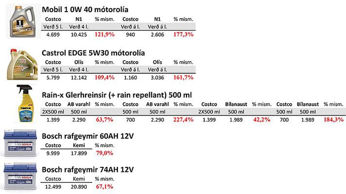 FÍB heldur verðkönnuninni áfram bifreiðaeigendum til leiðbeiningar og kannaði verð á mótorolíum, rafgeymum og á gluggahreini. Sú athugun leiðir í ljós að þessar vörur eru mun ódýrari í Costco en hjá öðrum söluaðilum þegar nákvæmlega sömu vörur eru bornar saman í könnunni. Allt að 227% munur er á glerhreinsi og 177% munur á mótorolíu. Þá munar allt að 79% á verði rafgeyma. Nokkur dæmi um mismun á verði má sjá hér að neðan.Eins og hér sést munar miklu á verði í Costco og hjá öðrum seljendum sömu vara hér á landi.
