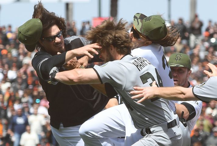 Það var ótrúleg uppákoma í leik Washington Nationals og San Fransisco Giants í bandarísku MLB-deildinni í hafnabolta í gær þegar slagsmál brutust út á milli leikmanna. Allt hófst á því að kastari Giants, Hunter Strickland, kastaði boltanum í mjöðm Bryce Harper. Sá síðarnefndi brást afar illa við og brutust út mikil slagsmál, eins og sjá má í þessu myndbandi á heimasíðu ESPN. „Í þessari stöðu fer maður annað hvort í aðra höfn eða veður í hann. Ég ákvað að vaða í hann,“ sagði Harper í samtali við fjölmiðla eftir leikinn í gær. Boltinn var á mikilli ferð - um 155 km/klst - og sagði þjálfari Giants eftir leik að kastið hafi litið illa út hjá Strickland. Hann sagði þó að um óviljaverk hafi verið að ræða. Bryce Harper was not happy after getting hit by Strickland's pitch. WATCH: https://t.co/t9t3BKWdHx pic.twitter.com/DFJP9mfGYP— ESPN (@espn) May 29, 2017