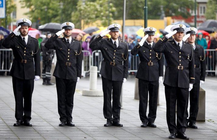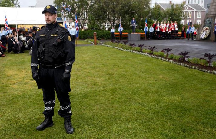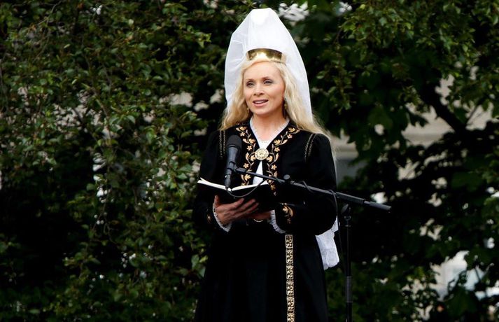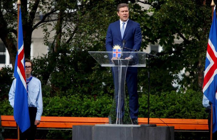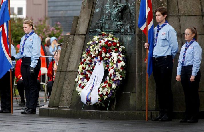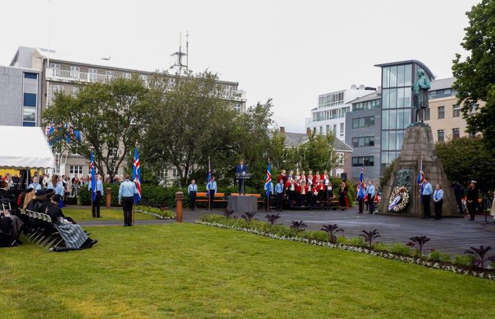 Guðni Th. Jóhannesson, forseti Íslands, lagði blómsveig við styttuna af Jóni Sigurðssyni í fyrsta skipti þegar þjóðhátíðardeginum var fagnað á Austurvelli fyrir hádegi. Fjallkonan að þessu sinni var Þóra Einarsdóttir, söngkona. Hátíðarathöfnin á vegum Alþingis og forsætisráðuneytisins hófst á Austurvelli kl. 11.15. Hún hófst á því að Guðni lagði blómsveig frá íslensku þjóðinni að minnisvarða Jóns Sigurðssonar. Að því loknu hélt Bjarni Benediktsson, forsætisráðherra, hátíðarræðu þar sem hann fjallaði meðal annars um öryggismál.Sjá einnig:Gera allt til að tryggja öryggi landsmanna Þóra reyndist vera fjallkonan að þessu sinni en leynd hvílir ávalt yfir hver hlýtur það hlutverk fram að athöfninni. Mótettukór Hallgrímskirkju og Graduale Futuri, eldri barnkór Langholtskirkju syngja og lúðrasveit Reykjavíkur leikur.Sumir nýttu tækifærið og mótmæltu Bjarna Benediktssyni, forsætisráðherra.Vísir/Andri MarinóGuðni Th.Jóhannesson forseti og Bjarni Benediktsson, forsætisráðherra, búa sig undir að hefja athöfnina.Vísir/Andri MarinóÍ sönnum þjóðhátíðaranda rigndi á viðstadda á Austurvelli.Vísir/Andri Marinó.Lögreglan var með töluverðan viðbúnað við Austurvöll en hún var ekki áberandi vopnuð.Vísir/Andri MarinóVísir/Andri Marinó