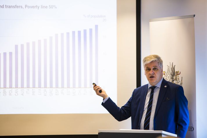 Auka þarf heimildir ríkissáttasemjara til að fresta aðgerðum á vinnumarkaði til að gefa viðsemjendum aukinn tíma og freista þess að ná samningum. Þá þarf að stuðla að meira trausti á vinnumarkaði með því að fá aðila vinnumarkaðarins að þjóðhagsráði. Þetta er á meðal þess sem kemur fram í nýrri skýrslu Efnahags- og framfarastofnunarinnar um stöðu efnahagsmála á Íslandi. Skýrslan var kynnt í fjármálaráðuneytinu í gær. Benedikt Jóhannesson, fjármála- og efnahagsráðherra, segist hafa átt samtal við aðila vinnumarkaðarins um þetta. Hingað til hafi aðilar vinnumarkaðarins ekki viljað taka þátt í starfsemi þjóðhagsráðsins. Gylfi Arnbjörnsson segir ástæðuna vera þá að umræðan um efnahagsmál verði ekki skilin frá umræðunni um félagslegan stöðugleika og velferðarmál. Þetta séu tvær hliðar á sama peningnum. En þegar umræðan snúist um það að tryggja stöðugleikann fari hún alltaf að snúast um að skera niður ríkisútgjöld.Gylfi Arnbjörnsson forseti ASÍ„En það er ekki eina leiðin til að bregðast við þenslu. Það er miklu skilvirkara að bregðast við þenslu með sköttum. Það eru aðrar leiðir færar til að bregðast við. Og ef það er þannig að ríkisstjórnin mótar sér stefnu um að það megi ekki hreyfa við sköttunum, ríkisstjórnin mótar sér stefnu um að það eigi að fara í miklar vegaframkvæmdir og innviðaframkvæmdir, þá er bara eitt eftir. Það er almennur rekstur ríkisins, velferðarkerfið,“ segir hann. Gylfi segir þetta vera merkilegt í ljósi þess að íslenska ríkisstjórnin, sem hafi ekki viljað tengja saman efnahagsmál og velferðarráð, sé aðili að tillögu Norðurlandanna um að Norðurlöndin verði viðurkennd inn í svokallaðan G20 hóp. Þar inni sé tillaga um að það þurfi að auka vægi velferðarmála í umræðu um efnahagsmál á heimsvísu. „Þeir eru kröfugerðarmenn þessarar stefnu erlendis en neita að taka þátt í henni hér heima. Gylfi segir að ef ekki sé vilji til þess að horfa til ábyrgðar stjórnvalda og seðlabanka á stöðu velferðarmála þá ætli ASÍ ekki að láta binda sig í einhverju sem snýr að ábyrgð efnahagsmála. Hvað er þjóðhagsráð? Þjóðhagsráð er skipað fulltrúum ríkisstjórnar Íslands, Sambands íslenskra sveitarfélaga, Samtaka atvinnulífsins og Seðlabanka Íslands. Markmið þjóðhagsráðs er að styrkja samhæfingu hagstjórnar og ákvarðana á vinnumarkaði. Þjóðhagsráð skal fjalla um stöðu í efnahagsmálum og ræða samhengi opinberra fjármála, peningastefnu og kjaramála í tengslum við helstu viðfangsefni hagstjórnar hverju sinni.