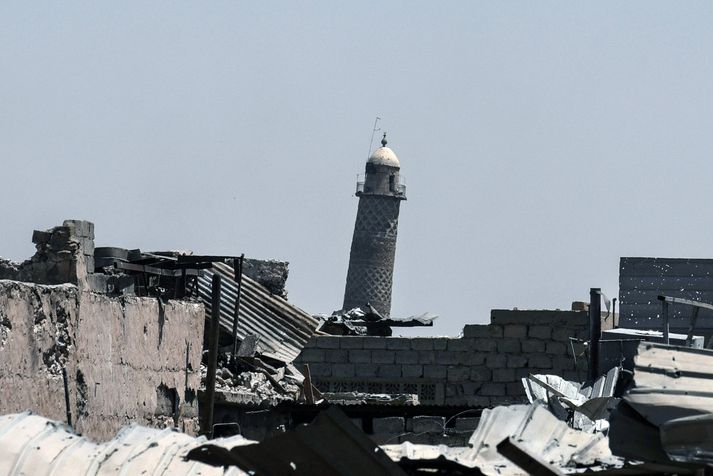 Eyðilegging al-Nuri moskunnar í írösku borginni Mósúl er opinber viðurkenning Íslamska ríkisins á því að það hafi tapað orrustunni um borgina. Sú er skoðun Haiders al-Abadi, forsætisráðherra Íraks, sem hann lýsti í gær. Eins og greint hefur verið frá segja Írakar að ISIS hafi sprengt upp moskuna á miðvikudag. ISIS bendir hins vegar á Bandaríkjamenn sem neita sjálfir sök. Moskan, sem var ríflega 800 ára gömul, er merkileg í sögu ISIS þar sem Abu Bakr al-Baghdadi, leiðtogi hryðjuverkasamtakanna, lýsti formlega yfir stofnun svokallaðs kalífadæmis þar í júlí 2014. Á undanförnum þremur árum hefur hið svokallaða kalífadæmi bæði unnið sigra og tapað. Margir leiðtoga þess hafa fallið í árásum og þá hafa samtökin þurft að færa höfuðstöðvar sínar frá Baqubah í Írak til Rakka í Sýrlandi og þaðan til Mayadin, einnig í Sýrlandi. Allt bendir nú til þess að ISIS sé við það að tapa tveimur stærstu borgunum sem hafa verið á valdi þeirra; Rakka og Mósúl. Í gær greindi Reuters frá því að hersveitir sýrlenskra uppreisnarmanna væru við það að umkringja samtökin í Rakka. Um er að ræða arabíska og kúrdíska vígamenn sem njóta stuðnings bandaríska flughersins. Búist er við því að þeim takist að hrekja ISIS frá borginni en þar hafa samtökin ríkt frá árinu 2014. Orrustan um Mósúl hefur staðið yfir frá því í október síðastliðnum. Hafa Kúrdar og Arabar unnið með hernaðarbandalagi Bandaríkjamanna og tilkynnti ríkisstjórn Íraks að tekist hefði að vinna austurhluta borgarinnar af ISIS í janúar. Verr hefur gengið í vesturhlutanum en á sunnudag tilkynnti íraski herinn um lokakafla orrustunnar. Herinn telur að um 300 skæruliðar séu eftir í borginni, samanborið við 6.000 í október. Til að bæta gráu ofan á svart fyrir ISIS rannsakar rússneska varnarmálaráðuneytið hvort tekist hafi að fella al-Baghdadi sjálfan í loftárás á Rakka. Óljóst er hvort sú sé raunin en margoft áður hefur dauða al-Baghdadis verið lýst yfir. Fall ISIS er þó ekki gulltryggt með væntanlegum ósigrum samtakanna í Rakka og Mósúl, að því er The Independent greinir frá í umfjöllun sinni. Segir þar að fólki í kalífadæminu muni vissulega snarfækka og áhrif þess minnka en að kalífadæmið sjálft sé ekki nauðsynlegt ISIS. Án kalífadæmisins getur ISIS enn þrifist utan stórborga Mið-Austurlanda, rétt eins og samtökin gerðu árið 2013. Gætu samtökin enn skipulagt hryðjuverkaárásir sem og haft áhrif á fólk á Vesturlöndum og hvatt til hryðjuverka líkt og þeirra sem áttu sér stað í París, Brussel og Manchester. Vísir/AFP