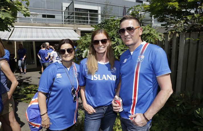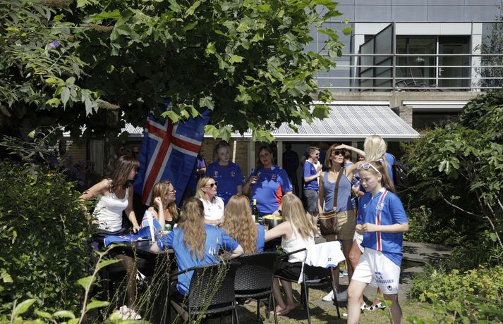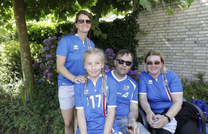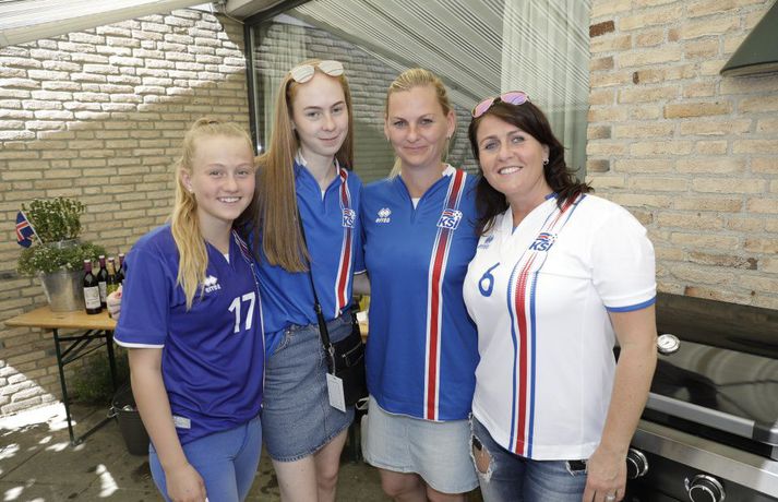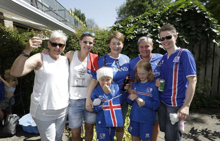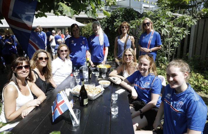Óðum styttist í stórleikinn gegn Frökkum í C-riðli EM kvenna í knattspyrnu. Reiknað er með um þrjú þúsund Íslendingum á leiknum í dag og eru landsmenn farnir að mála bæinn bláan. Kristinn Ingi Lárusson og Ingibjörg Sigfúsdóttir eru búsett í Tilburg í Hollandi en sonur þeirra, Kristófer Ingi, spilar með Willem II í Hollandi. Heimavöllur Willem II er keppnisleikvangurinn þar sem leikurinn í kvöld verður spilaður. Þau bjóða stórum hópi Íslendinga heim til að hita upp fyrir leikinn. Vísir var í beinni útsendingu og tók púlsinn í veislunni, ræddi við forsætisráðherra, fyrrverandi landsliðsmenn, Guðna Bergsson formann KSÍ, Gumma Ben og fleiri. Hér fyrir neðan má síðan fletta myndasafni úr veislunni. Leikurinn gegn Frökkum hefst klukkan 18.45.Veislan hófst klukkan tólf að íslenskum tíma og sífellt fjölgar í partýinu.Vísir/Vilhelm