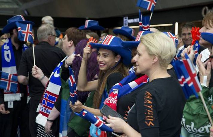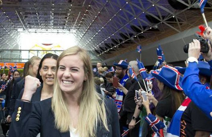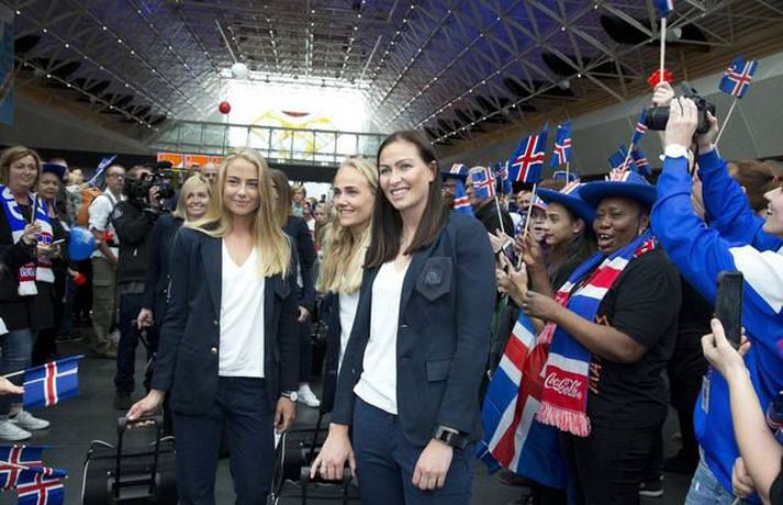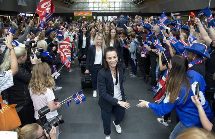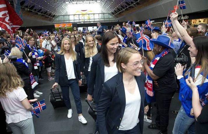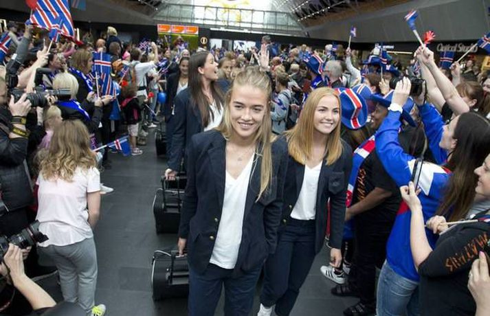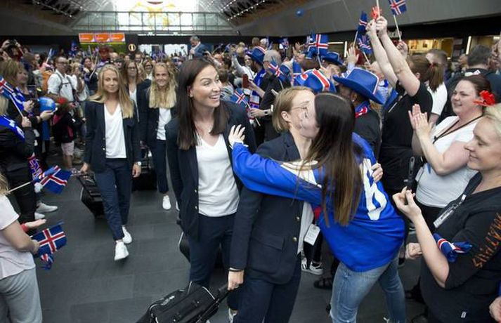 Stelpurnar okkar í íslenska kvennalandsliðinu í fótbolta flugu til Hollands í dag þar sem þær taka þátt á EM. Íslenski hópurinn var kvaddur með stæl í Leifstöð en myndband af kveðjuathöfninni má sjá með því að smella hér. Áður en stelpurnar fóru út í vél horfðu þær m.a. á magnað myndband þar sem fjölskyldur og vinir þeirra og ýmsir þjóðþekktir einstaklingar sendu þeim kveðjur og óskir um gott gengi í Hollandi. Stefán Karlsson, ljósmyndari Fréttablaðsins og Vísis, var í Leifsstöð í dag og tók myndirnar sem má sjá hér að neðan.