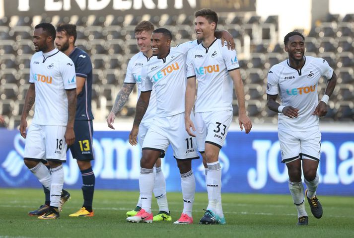 Swansea skoraði fjögur án Gylfa Eiríkur Stefán Ásgeirsson skrifar 5. ágúst 2017 22:30 Swansea saknaði ekki Gylfa í dag. Vísir/Getty Gylfi Þór Sigurðsson var ekki í leikmannahópi Swansea sem vann auðveldan 4-0 sigur á Sampdoria í síðasta æfingaleik sínum á undirbúningstímabilnu. Paul Clement, stjóri Swansea, hafði gefið það út fyrir leikinn að Gylfi myndi ekki spila með liðinu en hann hefur verið sterklega orðaður við Everton síðustu daga og vikur. Bæði Clement og Ronald Koeman, stjóri Everton, reikna með því að mál Gylfa verði kláruð innan fárra daga. Leroy Fer, Tammy Abraham og Federico Fernandez skoruðu mörk Swansea auk þess sem að Ricky Alvarez skoraði sjálfsmark. Swansea mætir Southampton á útivelli í fyrsta leik sínum í ensku úrvalsdeildinni um næstu helgi. Enski boltinn Tengdar fréttir Noble reyndi að lokka Gylfa til West Ham Mark Noble og Kyle Walker mærðu Gylfa Þór Sigurðsson sem hefur verið mikið í fréttunum í Englandi í sumar. 4. ágúst 2017 19:00 Britton telur að Gylfi fari til Everton Leon Britton, samherji Gylfa Þórs Sigurðssonar hjá Swansea, segir að baráttan um íslenska landsliðsmanninn sé líklega töpuð. 31. júlí 2017 22:20 The Times segir Gylfa nálgast Everton Viðræður á milli félaganna eru komnar aftur af stað um íslenska landsliðsmanninn Gylfa Þór Sigurðsson. 5. ágúst 2017 11:02 Koeman vongóður um að fá Gylfa Paul Clement, stjóri Swansea, á von á því að mál Gylfa Þórs Sigurðssonar leysist í vikunni. 2. ágúst 2017 19:33 Sögusagnir um að Swansea hafi samþykkt 48 milljóna tilboð Everton í Gylfa Það lítur út fyrir að eitthvað sé að gerast í málum Gylfa Þórs Sigurðssonar en á samfélagsmiðlum flýgur nú saga að Swansea sé búið að samþykkja 48 milljón punda tilboð Everton í Gylfa. 4. ágúst 2017 14:31 Mest lesið Sakaður um svindl á HM í pílukasti Sport Hleður Kjartan lofi eftir frábæra frumraun með Aberdeen Fótbolti Óttast að Isak hafi fótbrotnað Enski boltinn Ótrúleg tíðindi á HM í pílukasti: „Mikið sjokk“ Sport Hjalti Þór ráðinn aðalþjálfari Álftaness Körfubolti HM í pílu: Littler flaug áfram og kvöldinu lauk með spennutrylli Sport Túfa gerir þriggja ára samning í Svíþjóð Fótbolti Körfuboltakvöld: Tilþrif tímabilsins til þessa Körfubolti Arnór Ingvi orðinn leikmaður KR Íslenski boltinn Dagskráin í dag: Sá elsti á HM í pílu og enski boltinn Sport Fleiri fréttir Óttast að Isak hafi fótbrotnað Tvenna frá Rogers tryggði Villa sigur gegn Manchester United Fimmta sinn sem Arsenal er á toppnum um jólin: Unnu ekki titilinn í fyrstu fjögur skiptin „Viljum við að okkar verði minnst fyrir að vera skræfur?“ „Ef dómarinn hefði sinnt sínu starfi almennilega hefði Romero ekki fengið spjald“ Haaland gaf barnabarni Hareide gjöf Sjáðu mörkin úr enska: Sviptingar, sænskt þema og svakalegar tæklingar Calvert-Lewin hættir ekki að skora Gyökeres skaut Arsenal aftur á toppinn Slot fámáll um stöðuna á Isak Gleði og sorg í sigri Liverpool Dramatík er Broja reyndist hetja Burnley Haaland frábær er Manchester City komst á toppinn Andri Lucas skoraði í langþráðum sigri Blackburn Chelsea vann upp tveggja marka forskot á St James' Park Ekkert fararsnið á Guardiola sem segir að City verði að vera undirbúið Tíu bestu mörkin úr leikjum Liverpool og Tottenham Salah bað samherjana afsökunar Lineker fokillur við blaðamann: „Þvílíkt kjaftæði“ Skírði soninn LFC og Mac Allister lét draum feðganna rætast Jóga og pílates lykillinn að snöggri endurkomu Fantasýn: „Hann setti allt á 3 og það kom upp 19“ Alexander Isak fékk sænska gullboltann „Salah líkaði ekki að vera í skugganum af Isak og Wirtz“ Amorim vill Neves Benti á hinn íslenska Dan Burn Lést á leiðinni heim úr fótboltaleik Forsætisráðherrann hótar Roman Abramovich og segir að „klukkan tifi“ „Sýnum kvennaíþróttir af því að þær eru frábærar“ Snéri aftur í fótbolta eftir 35 ára hlé: „Kalla mig Jackie Grealish“ Sjá meira