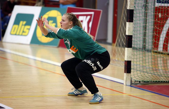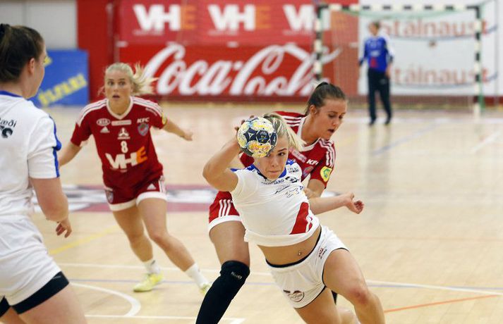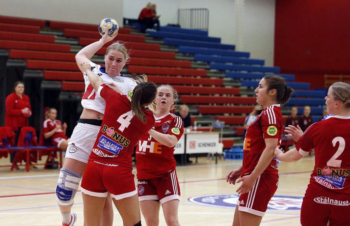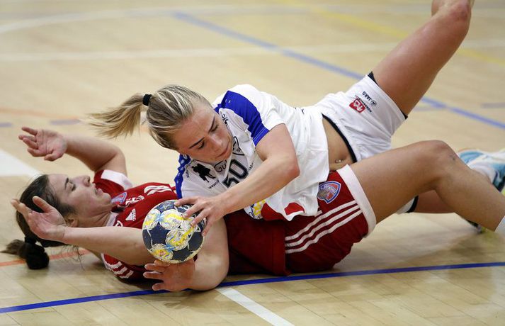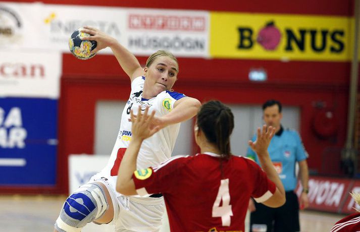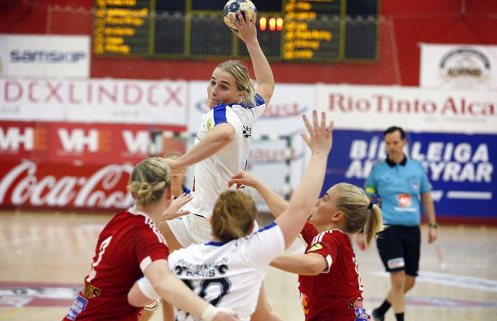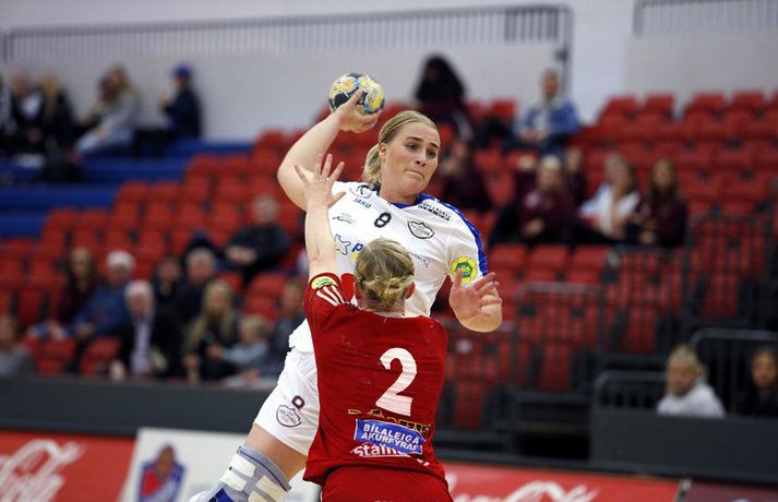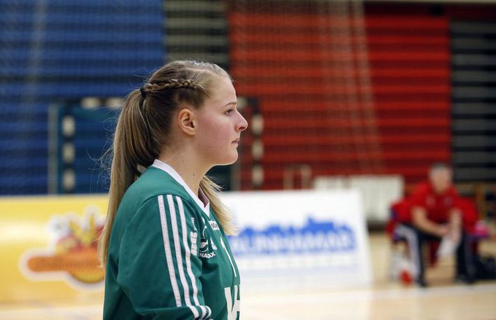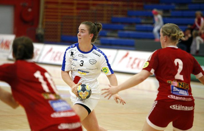Haukakonan Þórhildur Braga Þórðardóttir reynir linusendingu í dag.Vísir/Stefán