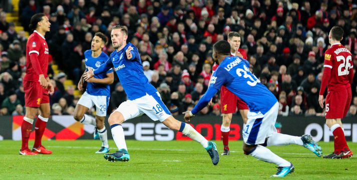 Sjáðu mark Gylfa og öll hin úr bikarsigrum Liverpool og United Eiríkur Stefán Ásgeirsson skrifar 6. janúar 2018 14:04 Gylfi skorar mark sitt í gær. Vísir/Getty Gylfi Þór Sigurðsson skoraði fyrir Everton í ensku bikarkeppninni í gær en það dugði ekki til sigurs gegn grannliðinu Liverpool sem hafði betur, 2-1. Virgil Van Dijk skoraði sigurmark þeirra rauðklæddu í fyrsta leiknum sínum fyrir Liverpool eftir að hann var keyptur til Liverpool. Manchester United komst einnig áfram í bikarnum eftir 2-0 sigur á Derby. United skoraði bæði mörk sín seint í leiknum. Mörkin úr leikjum gærdagsins má sjá hér fyrir neðan. Liverpool - Everton 2-1Manchester United - Derby 2-0 Enski boltinn Mest lesið Áfallið staðreynd og Isak búinn í aðgerð Enski boltinn Einn leikmaður með samning og völlurinn ólöglegur Fótbolti Vildi tapa legg: „Mesti hávaði sem ég hef heyrt“ Sport Salah færði Egyptum draumabyrjun Fótbolti Steraleikarnir segi ungu fólki að það sé aldrei nógu fullkomið Sport Hættur aðeins þrítugur Golf Afkáralegt fagn hjá hetju Sambíu Fótbolti Sagði látna systur sína hafa tryggt sigurinn ótrúlega Sport Körfuboltakvöld: Tilþrif tímabilsins til þessa Körfubolti Aron Einar lagði upp dýrmætt sigurmark Fótbolti Fleiri fréttir Fulham skildi Forest eftir við fallsvæðið Áfallið staðreynd og Isak búinn í aðgerð Fagnaði titli Liverpool sem óður maður um alla borg „Allir virðast elska hann“ „Þetta mun ekki buga okkur“ Guardiola mun vigta leikmenn Man City eftir jólin „Ef þið væruð Antoine Semenyo, hvert mynduð þið fara?“ Sjáðu mörkin: Rogers sá um Manchester United Óttast að Isak hafi fótbrotnað Tvenna frá Rogers tryggði Villa sigur gegn Manchester United Fimmta sinn sem Arsenal er á toppnum um jólin: Unnu ekki titilinn í fyrstu fjögur skiptin „Viljum við að okkar verði minnst fyrir að vera skræfur?“ „Ef dómarinn hefði sinnt sínu starfi almennilega hefði Romero ekki fengið spjald“ Haaland gaf barnabarni Hareide gjöf Sjáðu mörkin úr enska: Sviptingar, sænskt þema og svakalegar tæklingar Calvert-Lewin hættir ekki að skora Gyökeres skaut Arsenal aftur á toppinn Slot fámáll um stöðuna á Isak Gleði og sorg í sigri Liverpool Dramatík er Broja reyndist hetja Burnley Haaland frábær er Manchester City komst á toppinn Andri Lucas skoraði í langþráðum sigri Blackburn Chelsea vann upp tveggja marka forskot á St James' Park Ekkert fararsnið á Guardiola sem segir að City verði að vera undirbúið Tíu bestu mörkin úr leikjum Liverpool og Tottenham Salah bað samherjana afsökunar Lineker fokillur við blaðamann: „Þvílíkt kjaftæði“ Skírði soninn LFC og Mac Allister lét draum feðganna rætast Jóga og pílates lykillinn að snöggri endurkomu Fantasýn: „Hann setti allt á 3 og það kom upp 19“ Sjá meira