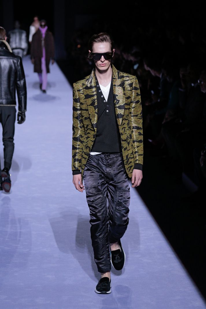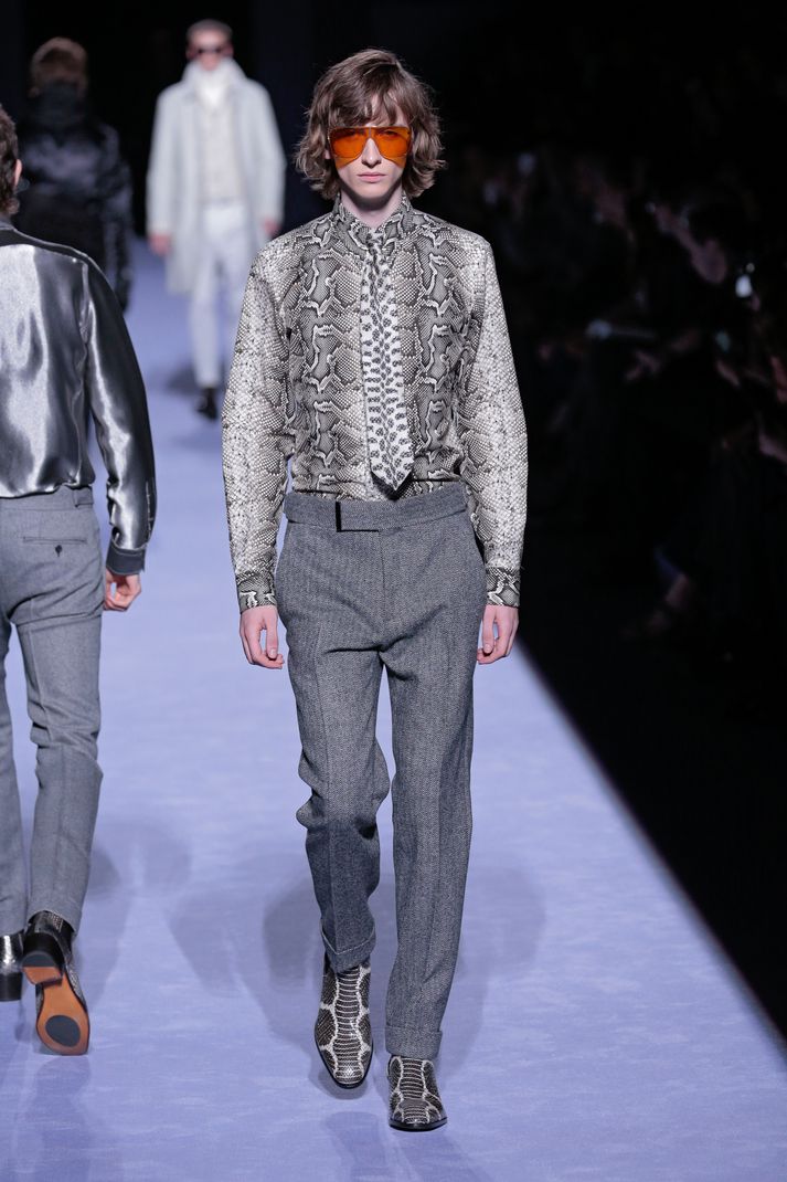 Pastellitir og dýramynstur fyrir karlana Ritstjórn skrifar 7. febrúar 2018 20:00 Glamour/Getty Gull, brons og silfur. Snákaskinnsmynstur og sebramynstur. Pastellitir, skærfjólublár og ljósbrúnt frá toppi til táar. Svona eiga karlmenn að klæða sig næsta vetur að mati Tom Ford, sem sýndi herrafatalínu sína á tískuvikunni í New York. Fötin eru þannig sem Tom Ford myndi klæðast sjálfur, og einnig einhver miklu yngri. Þannig nær línan að ná yfir breitt aldursbil og höfðar til margra tískuáhugamanna. Það er mikið um staka jakka, úr glansandi og bróderuðu efni. Buxurnar eru þröngar og settar saman við ökklastígvél. Innblásturinn fyrir línuna fékk Tom frá tveimur stöðum sem hann hefur búið, Los Angeles og London, og er línan skemmtileg samsetning af þeim báðum. Tom Ford mun sýna kvenfatalínu sína í New York á morgun, þannig það er spurning hversu margar vísanir eða hugmyndir hann er að gefa okkur með því hvernig hún mun líta út. Mest lesið Tíu vinsælustu vörurnar í tískuheiminum í dag Glamour Ég er glamorous! Glamour MTV EMA: Best klæddu stjörnurnar Glamour Ný götutískustjarna í New York Glamour Dragtir og litrík jakkaföt áberandi á rauða dreglinum Glamour Bótox í hársvörðinn er nýjasta æðið Glamour Glamour og Dior gefa heppnum Glamour-unnendum gjöf Glamour Kraftgallinn er kominn aftur Glamour Fimm góð maskara trix Glamour Hliðarspeglatöskur og bílamottupils Glamour