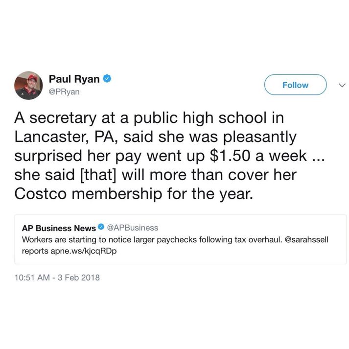 Paul Ryan, repúblikani og forseti fulltrúadeildar Bandaríkjaþings, hefur verið gagnrýndur fyrir tíst sem hann birti á Twitter-síðu sinni í gær. Í tístinu, sem var eytt skömmu eftir birtingu, reyndi Ryan að sýna fram á ágæti umdeildra skattalaga Repúblikanaflokksins með því að greina sérstaklega frá 150 króna launahækkun ritara í Pennsylvaníu-ríki, sem mörgum þótti hlægilega lítil. Skattafrumvarpið umdeilda varð að lögum í desember síðastliðnum en gagnrýnendur hafa sagt lögin koma sér vel fyrir ríka Bandaríkjamenn á kostnað þeirra efnaminni. Lögin eru talin munu kosta 1.500 milljarða dollara á næstu árum og framan af bentu skoðanakannanir til þess að þau væru almennt óvinsæl meðal þjóðarinnar. Samkvæmt frétt Washington Post virðast Bandaríkjamenn þó hliðhollari lögunum nú en áður en um helmingur svarenda var jákvæður í garð þeirra í nýrri könnun.Dugar fyrir Costco-aðildinni í eitt ár Repúblikanar með Paul Ryan í fararbroddi hafa keppst við að sýna fram á ágæti laganna og hafa t.d. fullyrt að meiriháttar skattalækkanir á fyrirtæki og tímabundnar skattalækkanir á einstaklinga muni borga fyrir sig sjálfar. Þær muni ýta undir hagvöxt og fjölga störfum í Bandaríkjunum. Máli sínu til enn frekari stuðnings birti Ryan tíst á Twitter-reikningi sínum í gær. Í tístinu, sem var eytt skömmu síðar, deildi hann tengli á frétt AP-fréttaveitunnar í hverri rætt var við Bandaríkjamenn um áhrif skattalaganna á fjárhag þeirra. Í fréttinni mátti lesa fjölda frásagna sem vörpuðu jákvæðu ljósi á lögin. Það vakti því furðu Twitter-notenda að Ryan skyldi sérstaklega taka fyrir frásögn Juliu Ketchum, ritara frá Pennsylvaníu-ríki, sem hafði hagnast, að því er mörgum fannst, hlægilega lítið á skattalækunum Repúblikana.Skjáskot af tísti Ryans.Vísir/Skjáskot„Ritari við opinberan menntaskóla í Lancaster, Pennsylvaníu, sagði það óvænta ánægju að kaup hennar hækkaði um 1,5 dollara á viku ... hún sagði það myndu duga fyrir Costco-aðildinni í ár, og meira til,“ skrifaði Ryan.Launahækkun á ári lægri en tímakaup Ryans 1,5 dollari er um 150 íslenskar krónur og því er ljóst að launahækkun konunnar er ekki ýkja há. Tíst Ryans þótti leggja áherslu á það sem gagnrýnendur laganna hafi lengi haldið fram, þ.e. að þau hygli þeim efnameiri á kostnað þeirra snauðari. Þannig eru skattalækkanir stórfyrirtækja varanlegar en lækkanir einstaklinga renna út á næsta áratuginum. Þá benti blaðamaður Washington Post á að launahækkun Ketchum á ársgrundvelli, samanlagt um 7800 íslenskar krónur, sé lægri en upphæðin sem Ryan sjálfur þénar á tímann, eða tæpar 11 þúsund krónur. Ryan þykir því sýna af sér töluvert skilningsleysi á högum hins almenna Bandaríkjamanns með tísti sínu.Extremely late to the dunk party on this but $1.50 a week works out to $78 a year, which is less than Paul Ryan makes in one hour (roughly $108) as Speaker of the House— Christopher Ingraham (@_cingraham) February 3, 2018 Hér að neðan má svo sjá nokkur tíst Twitter-notenda, þ.á.m. fulltrúardeildarþingmannsins Joe Kennedy, sem bæði gagnrýndu Ryan og hæddust óspart að honum.Meanwhile the wealthiest 0.1% of Americans receive an extra ~ $3,000 per week. pic.twitter.com/YFci8V5fnN— Rep. Joe Kennedy III (@RepJoeKennedy) February 3, 2018 AIDE: mr ryan ppl are saying ur only working to help the billionaires. they say you hate everyone who isn't richPAUL RYAN: oh yeah? well I'll show them *chucks a handful of loose nickels at the back of a teachers head*— KT NELSON (@KrangTNelson) February 3, 2018 [holding back tears]Paul Ryan.................thank you. pic.twitter.com/gQwYeY2RpR— Chris Jackson (@ChrisCJackson) February 3, 2018 That extra $1.50 Paul Ryan gave me a week in 2018 was totally worth giving up my mom's Medicaid.- A voter Paul Ryan keeps imagining he'll meet— LOLGOP (@LOLGOP) February 3, 2018 PAUL RYAN: The intern who did the bad tweet has been fired, which is a shame because his paycheck recently went up $0.07 per week under our tax plan— Chris Mohney (@chrismohney) February 3, 2018
