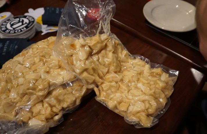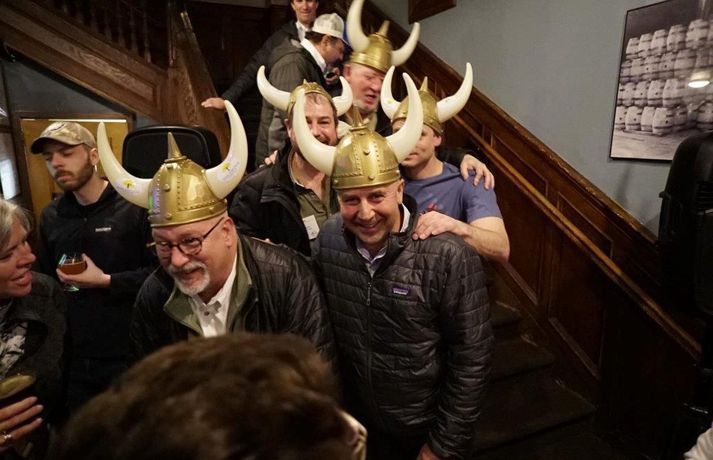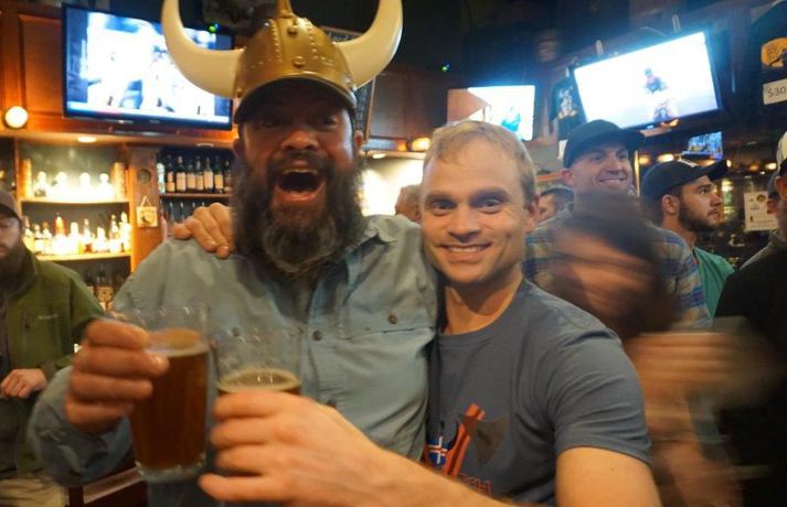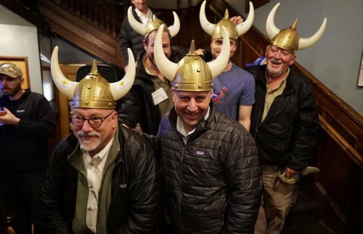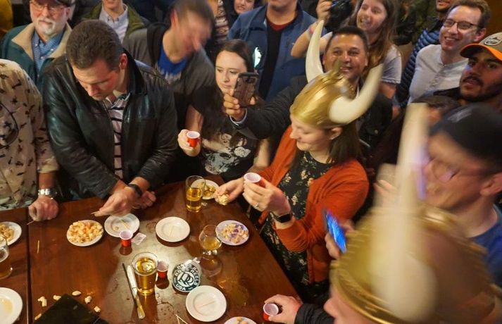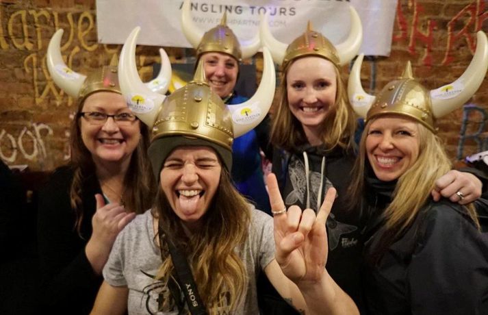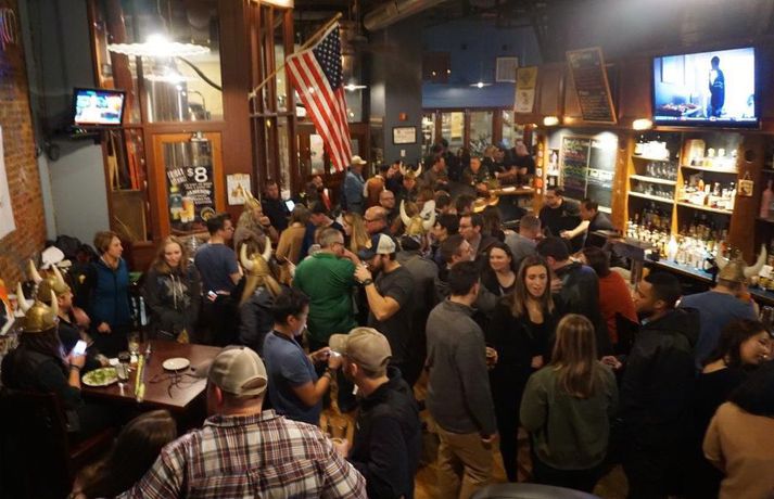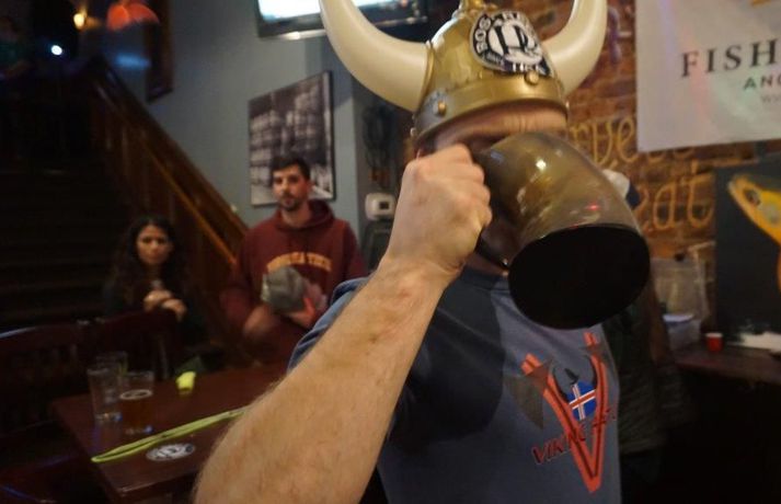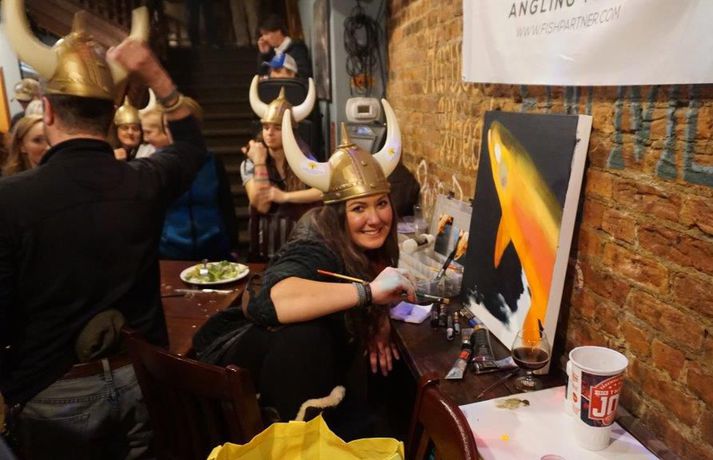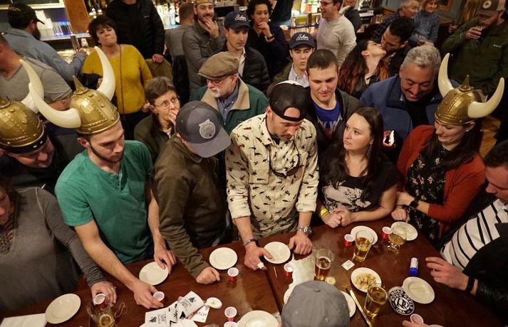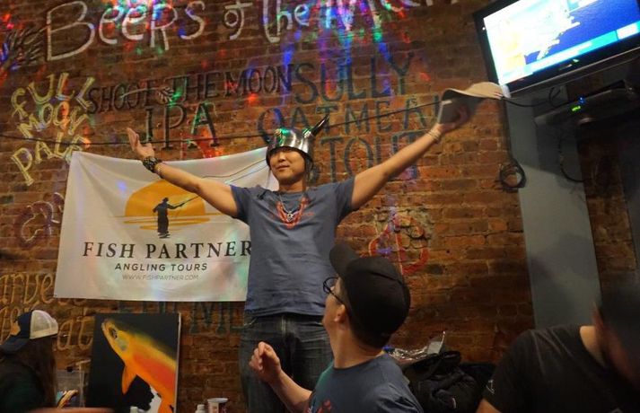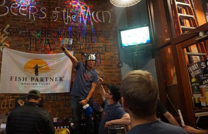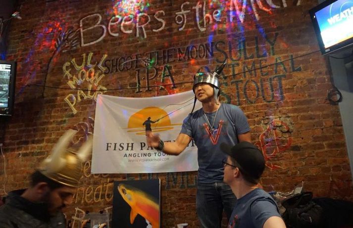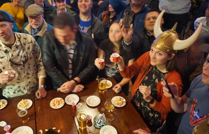 „Við hjá Fish Partner vorum á stærstu fluguveiðisýningu í heimi nýverið í Eddison New Jersey. (The Fly Fishing Show) Við höfum farið nokkrum sinnum áður og langaði okkur í þetta skiptið að gera eithvað öðruvísi, eitthvað skemmtilegt,“ segir Kristján Páll Rafnsson, stofnandi fyrirtækisins Fish Partner, í samtali við Vísi. „Við ákváðum að halda Víkinga partý. Planið var bara að vera með smá djamm en þetta sprakk út. Áður en við vissum af var þetta orðið formlegt eftirpartý fyrir sýninguna og aðal athöfn kvöldsins var kappát á kæstum hákarli.“ Kristján segir að Íslendingarnir hafi tekið með nóg af íslensku brennivíni í íslenskum bjór. „Fjöldi stórra aðila í Fluguveiðibransanum stóðu við bakið okkur og má þar nefna: Ross Reels, Abel Reels, Tacky Fly Boxes, Blue Halo Rod company og fleiri smærri aðilar. Lista konan Jessica Callihan, sem sérhæfir sig í að mála myndir af fiskum, kom og málaði verk á staðnum og svo vorum við með fullt af vörum frá styrktaraðilum sem við gáfum gestum.“ Keppnin var þannig að keppendur fengu 100 grömm af hákarl, eitt brennivínsstaup og tvær mínútur til að klára eða borða sem mest. „Það tók innan við mínútu fyrir vinningshafann að slafra í sig þessu hnossgæti í sig. Í fyrstu Verðlaun var 400 dollara fluguhjól frá Ross Fly reels. Það var nægur afgangur eftir kappátið því við tókum tvö kíló með okkur. Og fengu allir gestir að bragða á þessum þjóðarrétt okkar við misgóðar mótökur. Sumir kúguðust en aðrir átu þetta með bestu list. Hákarlinn var eins kæstur og hann getur orðið og því angaði staðurinn gjörsamlega af hákarli,“ segir Kristján en hann var beðin um leið að halda samskonar keppni að ári. Hér að neðan má sjá myndband af keppninni og þar fyrir neðan má sjá myndir sem teknar voru á svæðinu.