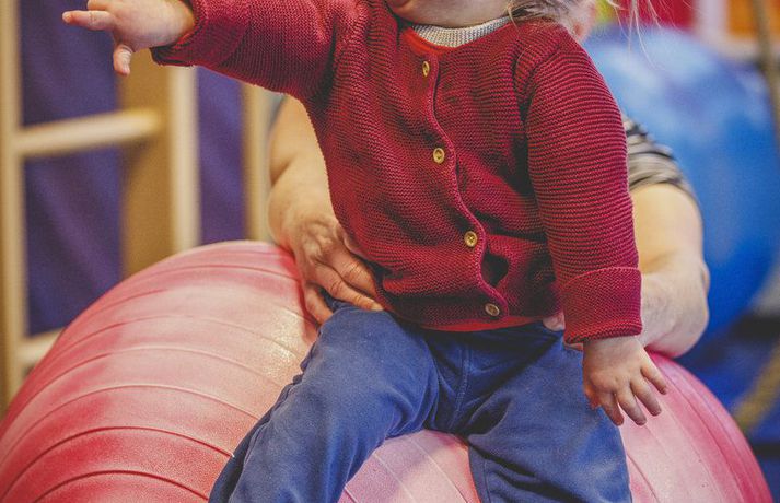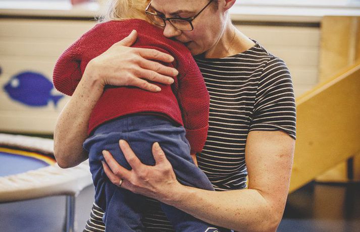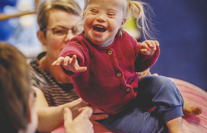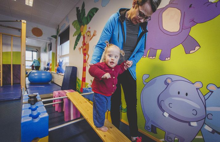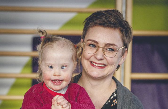 „Við duttum í lukkupottinn“ Ásta Hrafnhildur Garðarsdóttir skrifar 10. febrúar 2018 09:00 Ída skemmtir sér alltaf vel í sjúkraþjálfuninni og mamman fylgist með. Myndir/Fréttablaðið-Auðunn Hjónin Katrín Árnadóttir og Anton Rúnarsson áttu von á sínu öðru barni og ekkert á meðgöngunni benti til annars en að allt væri í stakasta lagi. En handrit lífsins er oft margslungnara en við gerum ráð fyrir og fer með tilveru okkar á óþekktar slóðir. „Við duttum í lukkupottinn. Ída kom inn í lífið og gerði allt betra,“ segir Katrín Árnadóttir, móðir tveggja ára stúlku sem fæddist með Downs heilkenni öllum að óvörum. Katrín býr á Akureyri ásamt eiginmanni sínum Antoni Rúnarssyni og tveimur dætrum þeirra. Hún starfar í Háskólanum á Akureyri en örlögin höguðu því þannig að kúvending varð á tilveru þeirra hjóna. Ída litla skaust í heiminn í janúarbyrjun árið 2016. Hún fæddist á sjúkrahúsi í Berlín þar sem foreldrar hennar bjuggu. Allt gekk sinn vanagang og fékk móðirin að hvíla sig eftir fæðinguna líkt og venja er í Þýskalandi og faðirinn var farinn heim að leggja sig. Hjúkrunarkona læddist mjúklega inn á sjúkrastofuna og skoðaði litlu stúlkuna gaumgæfilega og barnalæknir staðfesti síðan grun ljósmæðranna um að ekki væri allt með felldu. „Það var tilviljun að ég fór ekki í skimun, þá hefði litningagallinn uppgötvast,“ segir Katrín og bætir því við að sér þyki það sjálfsagt mál að fara í skimun til að fólk geti undirbúið sig fyrir þetta verkefni í lífinu. „En Ída átti bara að koma, ég get ekki hugsað mér lífið án hennar í dag,“ segir Katrín geispandi eftir lítinn jólasvefn, en Ída svaf ekki vel í desember og janúar. „Fyrstu vikurnar eftir að hún fæddist þurftum við að stilla klukku til að vekja hana á nóttunni. Síðan þá hefur hún sofið glimrandi – þar til nú fyrir jól. Þá erum við að borga sektina fyrir friðsamlega fyrstu mánuði.“ Vandamál sem margir foreldrar kannast við.Í skjól fjölskyldunnar Katrín og Anton bjuggu alls 15 ár í Þýskalandi lengst af í höfuðborginni Berlín. Þeim leið vel í stórborginni þar sem þau höfðu nýlega keypt sér íbúð og voru ekki með nein áform um að flytja aftur til Íslands. En tilvist Ídu breytti því. „Það var á öðrum eða þriðja degi eftir að Ída fæddist sem við hjónin litum á hvort annað, hugsandi það sama: Við erum að fara heim, er það ekki? Okkur fannst það bókað mál, við eigum svo margt fólk heima á Akureyri og okkur fannst okkur best borgið þar.“ Hjónin eru bæði að norðan og því lá beinast við að fara aftur „heim“ og leita í skjól fjölskyldunnar. „Mamma var okkur stoð og stytta fyrstu dagana. Hún flaug beint út til okkar og var einfaldlega til staðar. Hún og Ída tengdust strax mjög vel og það gaf okkur ráðrúm til að sinna Elínu, þá þriggja ára systur Ídu, sem var ekki endilega að fíla dreifingu athyglinnar. Það er skrítið að hugsa til baka til þessa tíma. Að maður hafi verið hræddur, pælt í hvaða aldri hún næði, hvort hún myndi nokkru sinni halda höfði, hvað þá labba. Allt hugsanir sem leituðu á okkur vegna vanþekkingar. Svo var gott að komast út, hitta vini, fá að gráta smá og hlæja um leið að þeirri lukku að eignast svona einstakt barn.“Með ferðatösku fulla af fróðleik Katrín og Anton voru algjörlega óundirbúin því að eignast barn með Downs heilkenni, þau vissu ekkert á hverju þau áttu von. Spurningar um heilsu Ídu og möguleika hennar í framtíðinni leituðu á þau. „Nokkrum dögum eftir fæðinguna kom til okkar kona sem vann á sjúkrahúsinu og var móðir fullorðins einstaklings með Downs heilkenni. Hún dró á eftir sér ferðatösku með upplýsingabæklingum, bókum og alls kyns kynningarefni. Þessi kona var grjóthörð og sagði okkur að við þyrftum að halda okkur við efnið þegar ala ætti upp barn með Downs heilkenni. Það að tungan stæði út væri til dæmis bara leti foreldranna að kenna, ef þeir sinntu því ekki að koma barninu í almennilega þjálfun. Svo sagði hún kerfið vera þungt, maður yrði sérfræðingur með tímanum og vandamálin kæmu kannski ekki fyrr en í grunnskóla. Þá réðist hvort maður kæmi barninu inn í skóla sem „leyfir“ nokkur börn með frávik eða ef við dyttum í lukkupottinn og kæmumst inn í skóla án aðgreiningar sem væru orðnir móðins í Þýskalandi. Það eru þeir skólar sem blanda öllum saman, fötluðum sem ófötluðum. Þetta virtist vera útópía, fjarlæg draumsýn. Þó að okkur væri brugðið að heyra þessa þurru frásögn fengum við samt frábæra þjónustu það sem eftir var af verunni í Berlín. Ída fékk sjúkraþjálfun frá þriggja vikna aldri, við fengum hjálp við að fylla út alls kyns umsóknir og var raðað í hóp foreldra sem eignuðust börn með Downs heilkenni fyrri hluta ársins 2016. Í hverfinu okkar eru margir einstaklingar með Downs heilkenni, þar er meira að segja leikhús þar sem bara einstaklingar með Downs heilkenni setja upp leikrit. Samfélagið þar er þéttara, reynslan líklegast meiri og betri og fleiri sérfræðingar. Við sjáum vissulega eftir lífinu í Berlín, við vorum nýbúin að kaupa okkur íbúð og sáum ekki fram á að flytja heim í bráð. Núna er þetta samt allt svo rétt og eðlilegt næsta skref.“Lífið með aukalitning Talið er að um það bil eitt af hverjum átta hundruð börnum á Íslandi fæðist með Downs heilkennið sem orsakast af þrístæðu litnings númer 21 og því eru þessir einstaklingar með aukalitning umfram aðra. Heilkenninu geta fylgt fjölmargir gallar á líffærum og aukin tíðni á ýmsum sjúkdómum. Um helmingur barna sem fæðast með Downs heilkenni greinist með hj