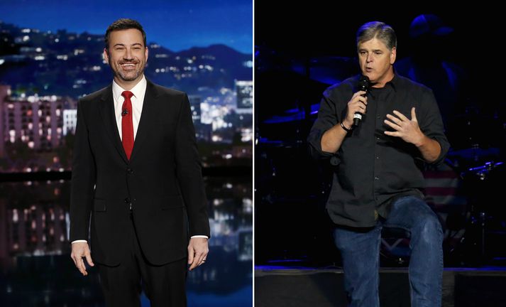 „Rassa-trúðurinn“ Kimmel deilir við „rassa-sirkusinn“ Sean Hannity Samúel Karl Ólason skrifar 6. apríl 2018 22:51 Jimmy Kimmel og Sean Hannity. Vísir/Getty Þáttastjórnandinn Jimmy Kimmel sendi Sean Hannity á Fox News tóninn í þætti sínum í gær eftir að Hannity kallaði Kimmal „Rassa-trúð“. Hannity var illa við að Kimmel hefði gert grín að hreim Melaniu Trump og sagði hann vera „fyrirlitleg smán“. Hann kallaði brandara Kimmel vera „hrottalegan“ og sagði ensku vera eitt af fimm tungumálum sem Melania tali. Því næst beindi Hannity þeirri spurningu að Kimmel hve mörg tungumál hann talaði. Kimmel virðist ekki hafa verið sáttur við þessar skammir. Áður en hann svaraði Hannity velti hann því þó fyrir sér hvað „rassa-trúður“ væri eiginlega og af hverju Hannity væri að tala um rassa og trúða. Því næst veittist Kimmel hart að Hannity. „Þetta er maðurinn sem varði margsakaða barnaníðinginn Roy Moore og ég er fyrirlitleg smán. Ég er rassa-trúðurinn. Ef ég er rassa-trúðurinn, og ég er það mögulega, þá ert þú Sean allur rassa-sirkusinn.“Kimmel sagðist þó vera ánægður með að Hannity væri allt í einu kominn með áhyggjur af þjáningum innflytjenda í Bandaríkjunum. „Vitið þið hvað mér finnst vera vanvirðing við forsetafrúna? Að halda fram hjá henni með klámmyndaleikkonu skömmu eftir að hún eignast barn. Af hverju röflar þú ekki um það Sean Hannity?“ Mest lesið Íslenska stelpan sem gerðist mormóni Lífið Frægir fundu ástina 2025 Lífið „Við erum öll dauð hvort sem er“ Lífið „Við byrjuðum að hlusta á jólalög í júlí“ Lífið „Ég heyrði þá kalla á mig en gat engu svarað“ Lífið Best klæddu Íslendingarnir 2025 Tíska og hönnun Fréttatía vikunnar: Rob Reiner, Dóra Björt og fullir unglingar Lífið Útgefandi Walliams lætur hann róa Lífið 500 Esjuferðir á árinu: „Sumir hrista bara hausinn og lygna augunum“ Lífið Heilsu krónprinsessunnar hrakar gríðarlega Lífið Fleiri fréttir „Við byrjuðum að hlusta á jólalög í júlí“ Frægir fundu ástina 2025 Íslenska stelpan sem gerðist mormóni „Við erum öll dauð hvort sem er“ Fréttatía vikunnar: Rob Reiner, Dóra Björt og fullir unglingar 500 Esjuferðir á árinu: „Sumir hrista bara hausinn og lygna augunum“ Útgefandi Walliams lætur hann róa Fáklæddir barþjónar þegar Regnboginn opnaði í Bíó Paradís Þriðja stigs krabbameinið það besta sem kom fyrir hann Dúnninn bakaður í fjóra sólarhringa til að drepa allt í honum Heilsu krónprinsessunnar hrakar gríðarlega Pete orðinn pabbi Nýkominn úr meðferð og „sjaldan verið betur nýsleginn túskildingur“ Laufey á lista Obama „Ég heyrði þá kalla á mig en gat engu svarað“ Opnar sig í fyrsta sinn: Kyssti yfirmanninn í fyrsta sinn þetta kvöld Sex hundruð ára kastali Björns í Frakklandi svo gott sem klár Fyrirsát að Valgerði, Stund Pírata og meint alzheimer Þráins Bertelssonar „Það jafnar sig enginn eftir svona og við munum aldrei gera það“ Ungir sjálfstæðismenn gefa út vandræðalegt fjölskyldudagatal Keough sögð líffræðileg móðir Benjamin Travolta Rússland aftur í Eurovision - undirskriftasöfnun Óskarsverðlaununum streymt á Youtube Karmað muni bíta þjófinn í rassinn þegar títan og glyttan byrja að dansa í hitanum Hreimur og Ólafur Darri perluvinir sem horfa á enska boltann saman „Ég er mamman sem gat aldrei gefið honum það sem hann óskaði sér“ Áttu að hitta Reiner-hjónin daginn örlagaríka Leynigesturinn hitti Heimi Karls beint í hjartastað Sannkölluð útsýnisperla með potti í Skerjafirði Kristófer Acox og Guðrún Elísabet eiga von á barni Sjá meira