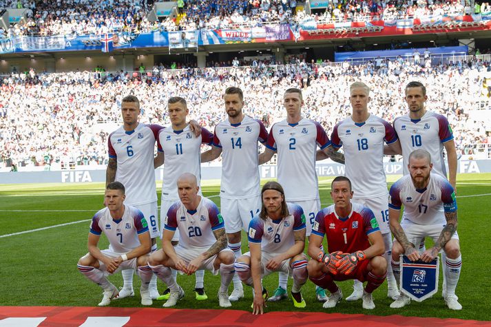 Aron Einar Gunnarsson leiddi íslenska landsliðið út á Spartak völlinn í Moskvu í dag fyrir fyrsta leik Íslands á HM í sögunni. Fyrirliðinn var þó ekkert of stressaður yfir þessu öllu saman og var hinn rólegasti að spjalla við drenginn sem fylgdi honum út á völlinn. Vilhem Gunnarsson, ljósmyndari Vísis, náði þessari skemmtilegu mynd af Aroni Einari og drengnum að ræða saman á leiðinni út á völl. Aron skipti svo um gír og skín einbeitingin úr augum fyrirliðans þegar byrjunarliði stillti sér upp fyrir hina hefðbundnu liðsmynd fyrir leik. Ísland gerði 1-1 jafntefli við Argentínu í leiknum þar sem Alfreð Finnbogason jafnaði fyrir Ísland eftir að Sergio Agureo kom Argentínumönnum yfir.vísir/vilhelm