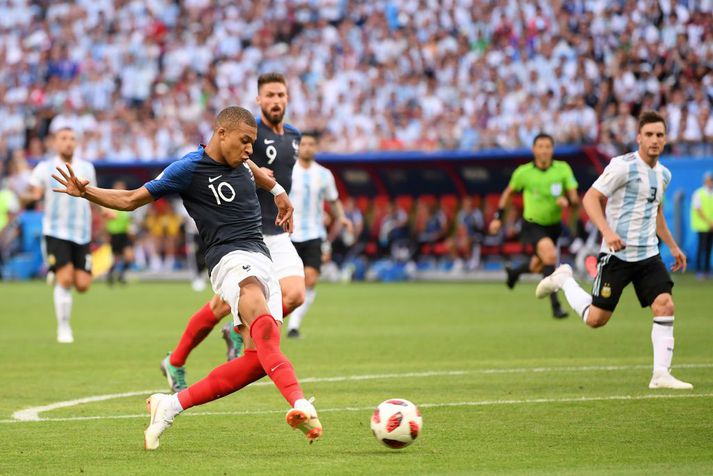 Stórkostlegur Mbappe skaut Frökkum áfram í sjö marka leik Ástrós Ýr Eggertsdóttir skrifar 30. júní 2018 16:00 Kylian Mbappe Vísir/Getty Frakkland er fyrsta þjóðin sem tryggir sig áfram í 8-liða úrslit HM í Rússlandi eftir sigur á Argentínu í sex marka leik í Kasan í dag. Það vantaði ekki dramatíkina í þennan leik og byrjaði hún strax á 10. mínútu. Kylian Mbappe átti frábæran sprett upp völlinn og varnarmenn Argentínu áttu ekki séns í hann. Marcos Rojo náði rétt svo að hlaupa hann uppi en sá sér ekki annan leik á borði en að fella ungstirnið í teignum, réttmæt vítaspyrna dæmd. Antoine Griezmann steig á punktinn og skoraði af öryggi. Hann hefur ekki misnotað vítaspyrnu fyrir franska landsliðið og í öllum leikjum sem hann skorar í vinna Frakkar. Örfáum mínútum seinna fór Mbappe aftur niður í teignum. Dómarinn dæmdi. Brotið var hins vegar rétt fyrir utan vítateigslínuna og aukaspyrna dæmd. Hárrétt hjá dómaranum. Paul Pogba tók spyrnuna en hún var ekki sérstök. Giroud og Griezmann fagna fyrsta marki dagsinsvísir/gettyRétt fyrir hálfleikinn jafnaði Angel di Maria leikinn. Di Maria hefur fengið gagnrýni fyrir frekar slaka frammistöðu á mótinu en han nsvaraði henni svo sannarlega með algjörlega frábæru marki, þrumuskot fyrir utan teiginn og svo mikill snúningur á boltanum að Hugo Lloris átti ekki séns í markinu. Allt jafnt í hálfleik, 1-1. Seinni hálfleikur byrjaði með látum. Argentínumenn komust yfir eftir þrjár mínútur þegar Gabriel Mercado stýrði skoti Lionel Messi í netið. Stuttu seinna er hrikalegur misskilningur í vörn Argentínu, varamaðurinn Federico Fazio á glórulausa sendingu aftur á Franco Armani í markinu en sendingin er langt frá því að rata á Armani og Griezmann fljótur að hugsa og koma sér í baráttuna. Fazio nær að hlaupa til baka og trufla Griezmann með því að toga í treyjuna hans svo skotið fer framhjá. Hefði verið hægt að færa rök fyrir víti en ekkert dæmt.Di Maria skoraði glæsilegt markvísir/gettyFrakkar grétu það þó ekki lengi að hafa ekki fengið vítið því mínútu seinna kom bakvörðurinn Benjamin Pavard Frökkum yfir með stórbrotnu marki á pari við, ef ekki glæsilegra, en skotið frá di Maria. Boltinn berst til hans við hægra vítateigshornið og hann þrumaði boltanum viðstöðulaust út við fjærstöngina og inn, algjörlega óverjandi. Mark Pavard opnaði flóðgáttir og mörkin runnu inn hjá Frökkum. Maður leiksins Kylian Mbappe tók frákastið frá skoti Blaise Matuidi og kom Frökkum yfir. Armani hefði líklega átt að gera betur í markinu en vel klárað hjá Mbappe og forystan Frakka. Mbappe var svo aftur mættur stuttu seinna, Frakkar með virkilega vel spilaða sókn, boltinn flaut á milli manna upp völlinn, Olivier Giroud átti sendinguna inn í hlaupaleið Mbappe sem kláraði framhjá Armani og í netið. Staðan orðin 4-2 og leikurinn svo gott sem úti miðað við spilamennsku Argentínumanna.Mbappe fór á kostumvísir/gettyÞað dofnaði aðeins yfir leiknum eftir þessa markarunu Frakka. Argentínumenn þurftu að sækja mörk en voru ekki líklegir. Lionel Messi komst í upplagt marktækifæri á 85. mínútu en skot hans var lélegt. Kórónaði frekar slæman dag Messi. Í uppbótartíma skoraði varamaðurinn Sergio Aguero með skalla upp úr aukaspyrnu. Argentína hafði eina og hálfa mínútu til þess að jafna. Þeir fengu eitt færi, Aguero átti fyrirgjöf inn í teiginn, boltinn fór af Mazimiliano Meza en ekki á markrammann, vonin úti og Argentína úr leik. Frakkar fara verðskuldað áfram í 16-liða úrslitin eftir algjörlega frábæran leik þar sem ungstirnið Kylian Mbappe fór á kostum. HM 2018 í Rússlandi