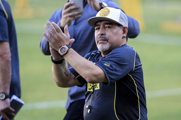 Sjáðu Maradona taka Víkingaklappið í Mexíkó: "Ég var veikur í fjórtán ár“ Óskar Ófeigur Jónsson skrifar 11. september 2018 09:30 Diego Maradona. Vísir/Getty Diego Maradona er tekinn við liði Dorados de Sinaloa frá Mexíkó og ætlar þar að reyna að endurbyggja þjálfaraferill sinn. Maradona er orðinn 57 ára gamall og hefur gengið í gegnum ýmislegt á ævinni. Baráttan við eiturlyfjafíknina hefur sett mikinn svip á hans líf og margir hafa því áhyggjur að sjá hann kominn til Mexíkó. Ekki síst þar sem hann er kominn til Culiacan þar sem Sinaloa-eiturlyfjahringurinn ræður ríkjum. Það var eiturlyfjabaróninn El Chapo Guzman sem stofnaði þau samtök og hann bjó í Culiacan. Maradona ræddi fíkn sína og framhaldið þegar hann hitti blaðamenn í tilefni af ráðningunni. Hann segist nú tilbúinn í heilbrigðara líferni. „Ég vil gefa Dorados það sem ég týndi þegar ég var veikur,“ sagði Diego Maradona sem er kominn á sömu slóðir og hann leiddi Argentínu til heimsmeistaratitils sumarið 1986 með stórkostlegri frammistöðu inn á vellinum.pic.twitter.com/5pv5BBYw6y — #HazlaDeDiez (@Dorados) September 11, 2018„Ég var veikur í fjórtán ár. Nú vil ég sjá sólina og fara að sofa á kvöldin. Ég var ekki einu sinni vanur því að leggjast í rúmið. Ég vissi ekki hvað koddi var. Þess vegna tók ég tilboðinu frá Dorados,“ sagði Maradona. Maradona hefur reynt fyrir sér sem þjálfari hjá argentínska landsliðinu, og arabísku félögunum Al Wasl og Fujairah. Maradona var boðinn velkominn hjá Dorados de Sinaloa í gær og þar þakkaði hann fyrir móttökurnar með því að taka Víkingaklappið með leikmönnum og stuðningsmönnum. Það má sjá það hér fyrir neðan.Haciendo click. pic.twitter.com/cqD0GdEJcp — #HazlaDeDiez (@Dorados) September 11, 2018Maradona mætti á HM í Rússlandi í sumar og sá meðal annars leik Íslands og Argentínu. Hann virðist hafa lært Víkingaklappið í leiðinni. Hann var búinn að taka að sér starf stjórnarformanns hjá Dinamo Brest í Hvíta Rússlandi fyrr á þessu áru en ekki er vitað hvað þessu ráðning, til liðs hinum megin á hnettinum, muni enda það ævintýri. „Ég vil vera lengi hjá Dorados,“ sagði Maradona sem lofar endurbótum á sínu lífi. „Fólk getur sagt margt um mig. Ég var á niðurleið og var fara illa með mig. Það var skref aftur á bak en fótboltinn er skref fram á við. Allt er breytt hjá mér og ég þakka dætrum mínum fyrir það,“ sagði Maradona. Það var vel tekið á móti kappanum eins og sést hér fyrir neðan.El D1eg0 de la gente. #HazlaDeDiezpic.twitter.com/IjK6Sh5Mxf — #HazlaDeDiez (@Dorados) September 11, 2018 Fótbolti HM 2018 í Rússlandi Mest lesið Áfallið staðreynd og Isak búinn í aðgerð Enski boltinn Einn leikmaður með samning og völlurinn ólöglegur Fótbolti Vildi tapa legg: „Mesti hávaði sem ég hef heyrt“ Sport Salah færði Egyptum draumabyrjun Fótbolti Körfuboltakvöld: Tilþrif tímabilsins til þessa Körfubolti Steraleikarnir segi ungu fólki að það sé aldrei nógu fullkomið Sport Hættur aðeins þrítugur Golf Afkáralegt fagn hjá hetju Sambíu Fótbolti Aron Einar lagði upp dýrmætt sigurmark Fótbolti Sagði látna systur sína hafa tryggt sigurinn ótrúlega Sport Fleiri fréttir Einn leikmaður með samning og völlurinn ólöglegur Salah færði Egyptum draumabyrjun Fulham skildi Forest eftir við fallsvæðið Áfallið staðreynd og Isak búinn í aðgerð Neres hetja Napoli í Sádi-Arabíu Aron Einar lagði upp dýrmætt sigurmark Afkáralegt fagn hjá hetju Sambíu Glódís Perla veik í jólafríið en enn taplaus Glódís og Hákon best í fótboltanum á árinu Frelsaði fjárfestirinn Dani Alves gefur sjálfum sér samning Fagnaði titli Liverpool sem óður maður um alla borg Mbappé breytti um fagn af góðu tilefni „Allir virðast elska hann“ Meira en 37 stöðugildi hjá Knattspyrnusambandi Íslands Táningur fær mikið hrós fyrir viðbrögð sín þegar mótherji missti meðvitund „Þetta mun ekki buga okkur“ Guardiola mun vigta leikmenn Man City eftir jólin „Ef þið væruð Antoine Semenyo, hvert mynduð þið fara?“ Freyr himinlifandi með íslensku strákana Sjáðu geggjaðan snúning Alberts áður en hann skoraði frábært mark Óskar Hrafn um komu Arnórs Ingva: „Gífurlega dýrmætt fyrir KR“ Áhorfendur ærðust eftir mögulega mark mótsins í fyrsta leik Sjáðu mörkin: Rogers sá um Manchester United Hleður Kjartan lofi eftir frábæra frumraun með Aberdeen Óttast að Isak hafi fótbrotnað Túfa gerir þriggja ára samning í Svíþjóð Arnór Ingvi orðinn leikmaður KR Albert skoraði í fyrsta sigri Fiorentina Bæjarar aftur á sigurbraut Tvenna frá Rogers tryggði Villa sigur gegn Manchester United Sjá meira