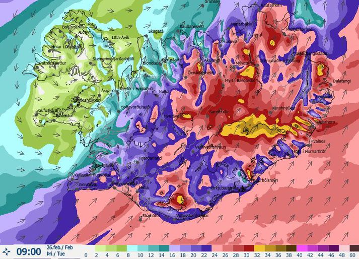 Veður Tengdar fréttir Rétt að vera við öllu búin í óveðrinu Nú er skollið á óveður á ríflega helmingi landsins og segir veðurfræðingur að það megi „nánast draga línu frá Suðurlandi til norðausturs af Tröllaskaga. 26. febrúar 2019 06:55 Mest lesið Trump nefnir nýja kynslóð orrustuskipa í höfuðið á sjálfum sér Erlent Hyggst kæra dyraverði Auto til lögreglu Innlent Fjölgun eldri kvenna í Kvennaathvarfi: „Þessar konur bíða ekki“ Innlent Skapari Call of Duty lést í bílslysi Erlent Virðist ekki vera hægt á Íslandi Viðskipti innlent Hiti geti mest náð átján stigum Veður „Krítískur massi af snarbrjáluðu fólki nær yfirhöndinni“ Innlent Ný könnun Maskínu: „Væri alveg ný staða í íslenskum stjórnmálum“ Innlent „Ótrúlega sorglegt að pabbi sé búinn að vera svona lengi í þessari stöðu“ Innlent Ráðist á pilt á heimleið Innlent Fleiri fréttir Stjórnvöld eigi að sjá sóma sinn í að greiða allan kostnað Ráðning ráðgjafafyrirtækja skekki myndina milli stjórnar og stjórnarandstöðu „Krítískur massi af snarbrjáluðu fólki nær yfirhöndinni“ Fjölgun eldri kvenna í Kvennaathvarfi: „Þessar konur bíða ekki“ Ráðist á pilt á heimleið Stytting framhjá Blönduósi ekki á samgönguáætlun Vestmannaeyingar fá að eiga Vestmannaeyjar Hyggst kæra dyraverði Auto til lögreglu „Ótrúlega sorglegt að pabbi sé búinn að vera svona lengi í þessari stöðu“ Höfðu samband við dönsku herstjórnina á Grænlandi Ný könnun Maskínu: „Væri alveg ný staða í íslenskum stjórnmálum“ Glæný Maskínukönnun og jólaóveður Ársæll hringdi beint í utanríkisráðherra eftir fundinn Ósannað að fimmtán ára stúlka hafi stungið sextán ára pilt tvisvar Sameina Farice, Öryggisfjarskipti og hluta Neyðarlínunnar Gaf fingurinn á Miklubraut Birtir drög að lögum um lagareldi: Hyggst leggja niður Fiskeldissjóð Hundrað og fjörutíu milljarða bótakrafa á Samherja sé súrrealísk Skemmdir í kirkjugörðum vegna aksturs utan vegar Ólýsanlegur harmur fyrir fjölskylduna og söfnun hleypt af stokkunum „Ég hef aldrei upplifað annan eins harm“ Vill leiða lista Sjálfstæðismanna í Reykjanesbæ „Þetta hefur verið þungur tími“ Naut aðstoðar samskiptasérfræðinga vegna veiðigjaldamálsins Hrindir af stað söfnun fyrir móður stúlkunnar sem lést í Suður-Afríku Varð vitni að ótrúlegum norðurljósum: „Mér fannst þetta magnað“ Færir nýársboðið fram á þrettándann Fjórir fluttir á sjúkrahús eftir bílveltu á Suðurlandi Leggur aftur til hverfislögreglustöð í Breiðholti Nú má heita Love, Tóní, Ranimosk og Draumur Sjá meira