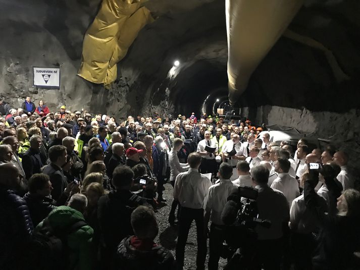 Slegið í gegn í Dýrafjarðargöngum Sunna Kristín Hilmarsdóttir skrifar 17. apríl 2019 16:34 Karlakórinn Ernir tók lagið í göngunum í dag og hlóð í Stuðmannalagið "Slá í gegn“ með nýjum texta. vísir/kmu Eftirvæntingin skein úr andlitum fólks í Dýrafjarðargöngum í dag þegar Sigurður Ingi Jóhannsson, samgönguráðherra, og Hreinn Haraldsson, fyrrverandi vegamálastjóri, sprengdu síðasta haftið í göngunum. Mikið fjölmenni var við sprenginguna en Dýrafjarðargöng verða mikil samgöngubót fyrir Vestfirðinga. Þau stytta leiðina á milli Reykjavíkur og Ísafjarðar um 27 kílómetra og taka af einhvern erfiðasta fjallveg landsins, Hrafnseyrarheiði. Enn er þó um 15 mánaða vinna eftir þar til göngin verða opnuð. Karlakórinn Ernir tók lagið í göngunum í dag og hlóð í Stuðmannalagið „Slá í gegn“ með nýjum texta. Nánar verður fjallað um málið í kvöldfréttum Stöðvar 2. Dýrafjarðargöng Tengdar fréttir Viðhafnarsprenging í Dýrafirði á morgun Boðað hefur verið til mannfagnaðar í Dýrafirði á morgun í tilefni þess að þá verður slegið í gegn í Dýrafjarðargöngum. Sjaldan eða aldrei hefur jarðgangagerð á Íslandi gengið jafn vel og þessi. 16. apríl 2019 17:15 Mest lesið „Ég hef aldrei upplifað annan eins harm“ Innlent Gaf fingurinn á Miklubraut Innlent Hrindir af stað söfnun fyrir móður stúlkunnar sem lést í Suður-Afríku Innlent Breiddi út faðminn fyrir rasista: „Þið þurfið ekki að biðjast afsökunar á að vera hvít lengur“ Erlent Hundrað og fjörutíu milljarða bótakrafa á Samherja sé súrrealísk Innlent „Þetta hefur verið þungur tími“ Innlent Sprengdu rússneskan hershöfðingja í loft upp í Moskvu Erlent Appelsínugular og gular viðvaranir á aðfangadag Veður Undirbúningur árásarinnar stóð yfir í marga mánuði Erlent Naut aðstoðar samskiptasérfræðinga vegna veiðigjaldamálsins Innlent Fleiri fréttir Sameina Farice, Öryggisfjarskipti og hluta Neyðarlínunnar Gaf fingurinn á Miklubraut Birtir drög að lögum um lagareldi: Hyggst leggja niður Fiskeldissjóð Hundrað og fjörutíu milljarða bótakrafa á Samherja sé súrrealísk Skemmdir í kirkjugörðum vegna aksturs utan vegar Ólýsanlegur harmur fyrir fjölskylduna og söfnun hleypt af stokkunum „Ég hef aldrei upplifað annan eins harm“ Vill leiða lista Sjálfstæðismanna í Reykjanesbæ „Þetta hefur verið þungur tími“ Naut aðstoðar samskiptasérfræðinga vegna veiðigjaldamálsins Hrindir af stað söfnun fyrir móður stúlkunnar sem lést í Suður-Afríku Varð vitni að ótrúlegum norðurljósum: „Mér fannst þetta magnað“ Færir nýársboðið fram á þrettándann Fjórir fluttir á sjúkrahús eftir bílveltu á Suðurlandi Leggur aftur til hverfislögreglustöð í Breiðholti Nú má heita Love, Tóní, Ranimosk og Draumur Kvartar til umboðsmanns og vonar að Vegagerðin sjái að sér Ætlar ekki að beita sér í máli starfsmanns Útlendingastofnunar „Ég vil ekki nokkurn tímann sjá neitt svona aftur“ Gyðingar á Íslandi upplifa aukinn ótta Ferðaþjónusta blómstrar í uppsveitum Árnessýslu „Þetta er bara ljótt“ Hljóti að vera komið að því að skoða öryggisgæslu við skóla Ætlar að skýra hvenær rjúfa megi þagnarskyldu Þagnarskylda heilbrigðisstarfsfólks og öryggisgæsla við grunnskóla Eyjólfur í orlof og Inga þrefaldur ráðherra Vegagerðin segir flóðin í Vík fyrirséð Fjölmiðlar, bókmenntir og hægrimennska á Sprengisandi „En hver sagði að þetta ætti að vera auðvelt?“ Milljónir til almannatengla og átta sinnum meira en í fyrra Sjá meira