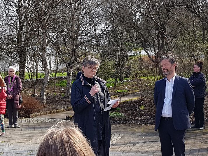 Fyssa, listaverk Rúríar í Grasagarðinum í Laugardal, var endurvígð í dag þegar vatni var hleypt á hana eftir sex ára hlé. Eftirleiðis verður vatni hleypt á verkið á sumardaginn fyrsta og slökkt fyrir fyrstu frost til þess að forðast þau vandamál sem komu upp í tengslum við að hafa vatnsrennsli yfir vetrartímann. Verkið er frá árinu 1995 en hefur staðið óvirkt frá árinu 2012 eftir að búnaður í dælustöð verksins bilaði þegar flæddi inn á hann. Því hafa vatnsdælurnar verið ónýtar og vatnsgangurinn ekki virkað. Fjöldi fólks var samankomið í Grasagarðinum í dag til að fylgjast með því þegar vatni var hleypt á verkið en Fyssa er flestum landsmönnum vel kunnug enda eitt helsta kennileiti garðsins. Fjöldi fólks fylgdist með því þegar Fyssa var endurvígð.Vísir/AtliÁrið 2017 afgreiddi borgarráð sérstaka fjárveitingu til Listasafns Reykjavíkur vegna bráðaviðgerða á útilistaverkum í borginni sem að sögn Ólafar Kristínar Sigurðardóttur, safnstjóra Listasafns Reykjavíkur, hafði viðhald verið vanrækt frá árinu 2008 þegar viðhaldsfé var skorið niður. Á heimasíðu listakonunnar Rúríar segir að grunnhugmynd verksins sé náttúruöflin eins og þau birtast á Íslandi. „Jörðin rifnar svo sprungur og gjár myndast, berggangar verða til í gosum, jarðlög eyðast og drangar rísa. Vatn safnast í gjár, frýs í glufum og klýfur björg.“Verkið er hannað af listakonunni Rúrí og var hún viðstödd þegar vatni var hleypt á verkið að nýju.Vísir/Atli
