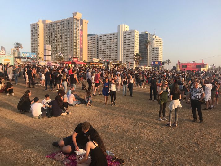 Segja má að stærsta partýið í Tel Aviv sé í bakgarði Hatara. Frá tíu á morgnana og langt fram á kvöld. Eurovision Village er afdrep Eurovision aðdáenda og annarra við ströndina í Tel Aviv. Þar kemur fólk saman til að hlusta á tónlist, fá sér að borða, baða sig í sólinni og skemmta sér.Neðst í fréttinni má sjá innlag frá heimsókn í Euro Village.Gestir í garðinum eru í áskrift að sól og blíðu líkt og aðrir sem staddir eru í Tel Aviv.Vísir/Kolbeinn TumiEin umferðargata skilur að Dan Panorama hótelið þar sem Hatari og íslenski hópurinn dvelur og þorpið. Lætin frá þorpinu eru mikil stærstan hluta dagsins enda risastórir hátalarar sem sjá til þess að hljóðið berist sem víðast, hvort sem fólki líkar betur eða verr.Stærsta sviðið í þorpinu.Vísir/Kolbeinn TumiÞorpið er þó alls ekkert þorp að stærð. Það spannar afar stórt svæði og þegar fulltrúar Vísis litu við á sjöunda tímanum að staðartíma voru mörg þúsund manns mætt til að skemmta sér. Þá voru enn þrír til fjórir tímar þar til síðara undanúrslitakvöldið í Eurovision hæfist.Kunnugleg andlit en alls konar listamenn selja varning í garðinum.Vísir/Kolbeinn TumiÍ garðinum er hægt að hlusta á lifandi tónlist á nokkrum sviðum, kaupa sér að því er virðist allan mögulegan mat, njóta áfengra sem óáfengra drykkja og kaupa Eurovision-varning eða aðrar vörur. Þótt margan Eurovision-aðdáandann sé að finna í garðinum þá fjölmenna heimamenn frá Ísrael í garðinn til að skemmta sér.Þessi fjölskylda verður vonandi ekki fyrir vonbrigðum með myndina af sér.Vísir/Kolbeinn TumiHeimamenn sem blaðamenn ræddu við voru allir á einu máli um að þeir kynnu virkilega vel að meta Ísland. Íslenska lagið? Það voru skiptar skoðanir um það og sumir höfðu hreinlega ekki heyrt um Hatara. Vísir tók púlsinn á gestum í þorpinu.
