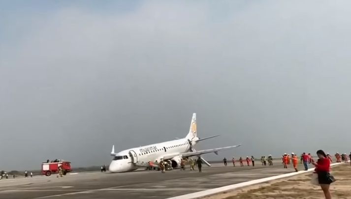 Flugmaður mjanmarska flugfélagsins Myanmar National Airlines þótti vinna þrekvirki þegar hann lenti farþegaflugvél félagsins án nefhjólsins á flugvelli í Mandalay í gær. Enginn slasaðist við lendinguna en 82 farþegar og sjö áhafnarmeðlimir voru um borð í vélinni sem er af gerðinni Embraer-190. Nokkurrar ringulreiðar gætti meðal farþega þegar flugvélin lenti, ef marka má myndband sem deilt var á samfélagsmiðlum í gær, en þeir komust allir heilu og höldnu úr vélinni.Haft er eftir stjórnanda hjá flugráðuneyti Mjanmar að flugmaðurinn hafi ítrekað reynt að virkja lendingarbúnaðinn á fremri hluta vélarinnar, fyrst sjálfvirkt og svo handvirkt, án árangurs. Flugvélin hafi hringsólað við flugvöllinn áður en ákveðið var að lenda án framhjólanna. Atvikið er nú rannsakað en um er að ræða aðra bilunina í flugi í Mjanmar á einni viku. Fjórum dögum áður hafnaði flugvél flugfélagsins Biman Bangladesh Airlines utan flugbrautar við lendingu á Yangon-flugvellinum í miklu óveðri. Ellefu farþegar slösuðust í slysinu.