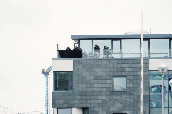 Mike Pence, varaforseti Bandaríkjanna, og kona hans Karen Pence, eru á leið í Höfða í Borgartúni þar sem hann mun funda með utanríkisráðherra í dag. Aðilar úr íslensku og bandarísku viðskiptalífi sitja viðskiptaþing í byggingunni sem gert er ráð fyrir að hefjist klukkan 14:30. Mikil öryggisgæsla er í kringum komu Pence. Þannig fást engar upplýsingar um hvaða leið varaforsetinn ekur til Höfða og sömuleiðis hefur ekki fengist staðfest hvar þeir munu funda með forsetahjónunum Guðna Th. Jóhannessyni og Elizu Reid. Leyniskyttur eru á þökum Arion banka og Advania en fyrirtækin eru í næstu byggingum við Höfða. Ljósmyndari Vísis náði meðfylgjandi myndum á öðrum tímanum í dag.Fylgjast má með gangi mála í Höfða í beinni útsendingu á Vísi.Grannt fylgst með gangi mála af þaki Arion banka.Vísir/vilhelmByssurnar komnar upp.VísirSkyttur á þaki Arion banka.