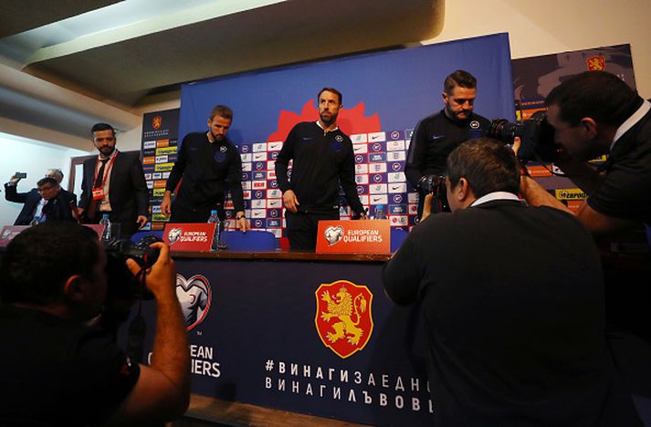 Blaðamannafundur truflaður af Búlgara: Myndatökumaður sagði Southgate að halda kjafti Anton Ingi Leifsson skrifar 15. október 2019 13:30 Gareth Southgate býr sig undir blaðamannafund. vísir/getty Það var mikill hiti eftir leik Búlgaríu og Englands í undankeppni EM 2020 í gærkvöldi en leikmenn enska landsliðsins urðu fyrir rasisma. Margir Búlgarar vildu þó ekki kannast við það og sagði meðal annars þjálfari þeirra að hann hafi ekki heyrt neitt af rasismanum sem hafi átt að hafa skeð. Blaðamannafundurinn eftir leik var fjörugur og búlgarskir fjölmiðlamenn létu þar vel í sér heyra. Kaveh Solhekol, blaðamaður Sky Sports, greinir frá þessu á Twitter-síðu sinni í gær en hann segir að einn þeirra hafi truflað fundinn með að segja að kynþáttaníðið hafi ekki verið svo slæmt. Annar þeirra, myndatökumaður, sagði svo Southgate undir lok fundarins að halda kjafti. Mikill hiti á fundinum í gær. UEFA hefur enn ekki gefið út yfirlýsingu vegna málsins.Gareth Southgate post-match press conference briefly interrupted by Bulgarian journalist who’s convinced racism at the game was not as bad as we witnessed. Bulgarian cameraman next to me tells Southgate to fuck off at the end — Kaveh Solhekol (@SkyKaveh) October 14, 2019 Enski boltinn Tengdar fréttir Þjálfari Búlgaríu skaut föstum skotum á stuðningsmenn Englands Krasimir Balakov, þjálfari Búlgaríu, lét gamminn geisa er hann ræddi við fjölmiðla eftir 6-0 tapið gegn Englandi í gærkvöldi. 15. október 2019 12:00 Þjálfari Búlgaríu kannast ekkert við rasíska söngva: „Ég heyrði ekkert“ Krasimir Balakov, þjálfari búlgarska landsliðsins, segist ekki hafa heyrt rasíska söngva á pöllunum er Búlgaría tapaði 6-0 fyrir Englandi í undankeppni EM. 15. október 2019 08:30 Forsætisráðherra Búlgaríu krefst þess að formaður knattspyrnusambandsins segi af sér Íþróttamálaráðherra Búlgaríu, Krasen Kralev, segir að forsætisráðherra landsins, Boyko Borissov, hafi óskað eftir því að formaður knattspyrnusamband landsins segi af sér. 15. október 2019 10:30 Fordæma aðgerðarleysi UEFA og að leikur Englands hafi ekki verið flautaður af Samtökin Kick It Out, sem vinna gegn kynþáttaníði í fótbolta, gáfu út yfirlýsingu í kjölfar leiks Búlgaríu og Englands í gærkvöld þar sem þau segja að hætta hefði átt við leikinn. 15. október 2019 07:00 England íhugaði að ganga af velli í gær Rosalegur rasismi í Búlgaríu í gær og enska liðið íhugi að ganga af velli. 15. október 2019 07:30 Mest lesið Áfallið staðreynd og Isak búinn í aðgerð Enski boltinn Einn leikmaður með samning og völlurinn ólöglegur Fótbolti Vildi tapa legg: „Mesti hávaði sem ég hef heyrt“ Sport Salah færði Egyptum draumabyrjun Fótbolti Hættur aðeins þrítugur Golf Steraleikarnir segi ungu fólki að það sé aldrei nógu fullkomið Sport Afkáralegt fagn hjá hetju Sambíu Fótbolti Körfuboltakvöld: Tilþrif tímabilsins til þessa Körfubolti Sagði látna systur sína hafa tryggt sigurinn ótrúlega Sport Aron Einar lagði upp dýrmætt sigurmark Fótbolti Fleiri fréttir Fulham skildi Forest eftir við fallsvæðið Áfallið staðreynd og Isak búinn í aðgerð Fagnaði titli Liverpool sem óður maður um alla borg „Allir virðast elska hann“ „Þetta mun ekki buga okkur“ Guardiola mun vigta leikmenn Man City eftir jólin „Ef þið væruð Antoine Semenyo, hvert mynduð þið fara?“ Sjáðu mörkin: Rogers sá um Manchester United Óttast að Isak hafi fótbrotnað Tvenna frá Rogers tryggði Villa sigur gegn Manchester United Fimmta sinn sem Arsenal er á toppnum um jólin: Unnu ekki titilinn í fyrstu fjögur skiptin „Viljum við að okkar verði minnst fyrir að vera skræfur?“ „Ef dómarinn hefði sinnt sínu starfi almennilega hefði Romero ekki fengið spjald“ Haaland gaf barnabarni Hareide gjöf Sjáðu mörkin úr enska: Sviptingar, sænskt þema og svakalegar tæklingar Calvert-Lewin hættir ekki að skora Gyökeres skaut Arsenal aftur á toppinn Slot fámáll um stöðuna á Isak Gleði og sorg í sigri Liverpool Dramatík er Broja reyndist hetja Burnley Haaland frábær er Manchester City komst á toppinn Andri Lucas skoraði í langþráðum sigri Blackburn Chelsea vann upp tveggja marka forskot á St James' Park Ekkert fararsnið á Guardiola sem segir að City verði að vera undirbúið Tíu bestu mörkin úr leikjum Liverpool og Tottenham Salah bað samherjana afsökunar Lineker fokillur við blaðamann: „Þvílíkt kjaftæði“ Skírði soninn LFC og Mac Allister lét draum feðganna rætast Jóga og pílates lykillinn að snöggri endurkomu Fantasýn: „Hann setti allt á 3 og það kom upp 19“ Sjá meira