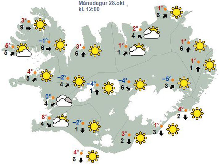 Veður Mest lesið Ríkissjóður greiðir fyrir flutning hinna látnu til Íslands Innlent Falskar netverslanir: Auglýsir rýmingarsölu nokkrum dögum eftir opnun Innlent „Krítískur massi af snarbrjáluðu fólki nær yfirhöndinni“ Innlent Ekið á konu á Langholtsvegi Innlent Íslendingur í gæsluvarðhaldi í Kólumbíu vegna gruns um kynferðisbrot Erlent Trump nefnir nýja kynslóð orrustuskipa í höfuðið á sjálfum sér Erlent Lögreglan lýsir eftir Birni Þorláki Innlent Undrandi á ráðningu ráðgjafa Innlent Hyggst kæra dyraverði Auto til lögreglu Innlent Sektaður um hundruð þúsunda fyrir að sparka í hund Innlent Fleiri fréttir Lögreglan lýsir eftir Birni Þorláki Sigríður Halldórsdóttir nýr ritstjóri Kastljóss Forsætisráðuneytið eyddi meiru í almannatengla í fyrra en í ár Inkalla snuð vegna of mikils magns BPA-plastefna Svanhildur Sif heiðruð Falskar netverslanir: Auglýsir rýmingarsölu nokkrum dögum eftir opnun Meðallaun upplýsingafulltrúa hækkuðu hlutfallslega mest Skötuilmurinn leggst yfir landið og Samkeppniseftirlitið ætlar að fylgjast vel með bensínverðinu Áfram auknar líkur á eldgosi Sektaður um hundruð þúsunda fyrir að sparka í hund Stýra fjármálum og mannauðsmálum Þjóðleikhússins Sló mann í höfuðið með glerflösku á ísfirskum skemmtistað Ekið á konu á Langholtsvegi Ríkissjóður greiðir fyrir flutning hinna látnu til Íslands Undrandi á ráðningu ráðgjafa „Krítískur massi af snarbrjáluðu fólki nær yfirhöndinni“ Fjölgun eldri kvenna í Kvennaathvarfi: „Þessar konur bíða ekki“ Ráðist á pilt á heimleið Stytting framhjá Blönduósi ekki á samgönguáætlun Vestmannaeyingar fá að eiga Vestmannaeyjar Hyggst kæra dyraverði Auto til lögreglu „Ótrúlega sorglegt að pabbi sé búinn að vera svona lengi í þessari stöðu“ Höfðu samband við dönsku herstjórnina á Grænlandi Ný könnun Maskínu: „Væri alveg ný staða í íslenskum stjórnmálum“ Glæný Maskínukönnun og jólaóveður Ársæll hringdi beint í utanríkisráðherra eftir fundinn Ósannað að fimmtán ára stúlka hafi stungið sextán ára pilt tvisvar Sameina Farice, Öryggisfjarskipti og hluta Neyðarlínunnar Gaf fingurinn á Miklubraut Birtir drög að lögum um lagareldi: Hyggst leggja niður Fiskeldissjóð Sjá meira