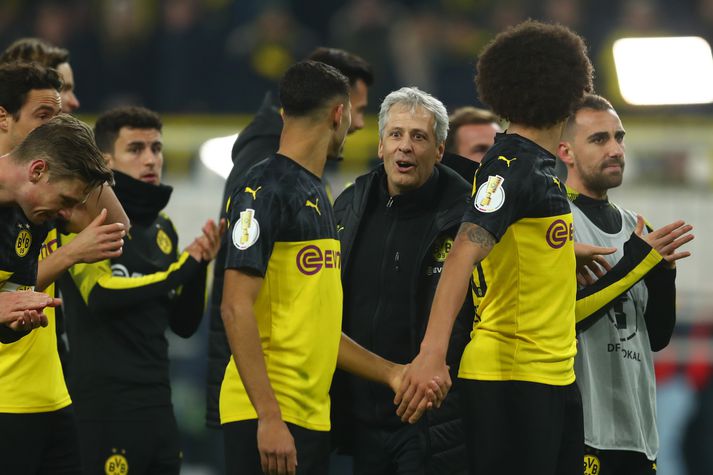 Dortmund komst áfram í þýska bikarnum í gærkvöldi er liðið vann 2-1 sigur á Borussia Mönchengladbach en það komust þó ekki allir heilir frá sigrinum. Marcus Thuram, sonur Lillian Thuram, kom Mönchengladbach yfir á 71. mínútu en tvö mörk á næstu níu mínútum frá Julian Brandt tryggðu Dortmund sigurinn. Sigurmarkið sjálft kom á 80. mínútu er Brandt skoraði eftir undirbúning Thorgan Hazard en Lucian Favre, þjálfari Dortmund, var eðlilega sáttur með sigurmarkið.Dortmund boss Lucien Favre managed to pick up an injury celebrating his team’s winner last night pic.twitter.com/huZS98R0dy — ESPN UK (@ESPNUK) October 31, 2019 Hann fagnaði markinu vel en eitthvað virðist lærið hafa gefið sig því skömmu síðar hélt Favre um lærið og virtist sárþjáður. Dortmund hélt út og er komið áfram í 16-liða úrslit bikarkeppninnar en liðið mætir Wolfsburg í þýsku deildinni um helgina. Fróðlegt að sjá hvort Favre verði heill heilsu þá.