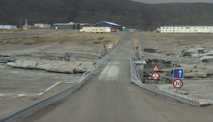 Grænlenska þingið hefur í fyrsta sinn samþykkt fjárveitingu til þjóðvegagerðar í þessu næsta nágrannalandi Íslands. Fyrsti þjóðvegur Grænlands verður 170 kílómetra langur og lagður milli aðalflugvallar landsins og næst stærsta bæjarins. Frá þessu var greint í fréttum Stöðvar 2.Kangerlussuaq, eða Syðri Straumfjörður, var bandarísk herstöð til ársins 1992. Brúin er yfir jökulfljót sem þar rennur til sjávar.Stöð 2/Egill Aðalsteinsson.Malarvegirnir sem núna liggja út frá flugvellinum í Kangerlussuaq eru um fimmtíu kílómetra langir og þeir langlengstu á Grænlandi og þar geta menn búist við að sjá sauðnaut í vegkantinum. Aðrir vegir Grænlands ná aðeins fáeina kílómetra út frá stærstu byggðum landsins og engir tveir bæir eru tengdir saman með vegi.Sauðnaut við Kangerlussuaq. Hreindýr eru einnig algeng á svæðinu, sem státar af fjölskrúðugasta dýralífi Grænlands.Stöð 2/Egill Aðalsteinsson.En núna hefur grænlenska þingið með fjárlögum næsta árs samþykkt fjárveitingu sem nemur 900 milljónum íslenskra króna til að hefjast handa við gerð fyrsta þjóðvegar landsins, milli hafnarbæjarins Sisimiut og Kangerlussuaq-flugvallar, sem áður var þekktur sem Syðri Straumfjörður. Fjármunirnir fara til að skipuleggja og hanna veginn en heildarkostnaður við verkið er talinn verða milli sjö og níu milljarðar króna.Vegurinn verður um 170 kílómetra langur.Grafík/Stöð 2.Sisimiut er tæplega sexþúsund manna bær og ráðamenn þar telja að vegurinn opni á fiskflutninga með flugi en leiði einnig til uppbyggingar í ferðaþjónustu. Þannig skýrði grænlenski fjölmiðillinn Sermitsiaq nýlega frá áhuga íslenska fyrirtækisins Arctic Adventures á því að koma að fjögurra milljarða króna fjárfestingu í ferðaþjónustu á svæðinu að því tilskyldu að vegurinn verði lagður. Hér má sjá frétt Stöðvar 2: