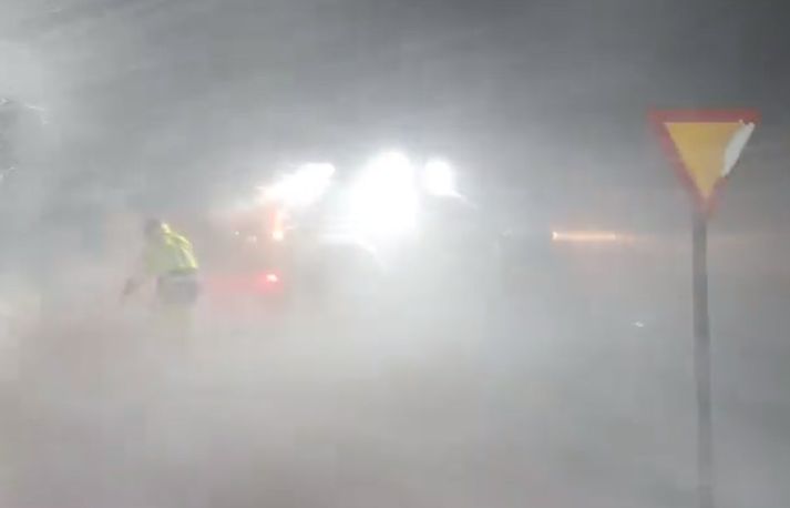 Björgunarsveitarmaður fýkur þvert yfir Suðurstrandarveg Hallgerður Kolbrún E. Jónsdóttir skrifar 10. desember 2019 22:49 Björgunarsveitarmaðurinn fýkur yfir Suðurstrandarveg. facebook/skjáskot Erfiðar aðstæður hafa verið á Suðurnesjum síðustu klukkustundir en mikill veðurofsi er í Keflavík og Grindavík. Þó er eitthvað búið að lægja og hefur útköllum fækkað aðeins. Þá er mikið fok í Keflavík og er búið að loka fyrir alla umferð við Víkurbraut og hafnarsvæðið í Keflavík. Mikið er um lausa muni sem fjúka og geta þeir valdið miklum skemmdum á ökutækjum og slasað fólk verði það fyrir fjúkandi munum. „Það tók svona tvær klukkustundir að hjálpa þeim aftur í bæinn vegna þess að það sást ekki fyrir framan húddið á bílnum. Við þurftum að keyra eftir GPS tækjum eftir þjóðveginum,“ sagði Otti Rafn Sigmarsson, björgunarsveitarmaður í Grindavík í samtali við fréttastofu Vísis en hann náði merkilegu myndbandi af björgunarsveitarmanni fjúka þvert yfir Suðurstrandarveg þegar björgunaraðgerðir stóðu þar yfir. Koma þurfti tveimur bílum til aðstoðar þar sem fólkið þurfti að stöðva bílana á veginum og treysti sér ekki til að halda lengra vegna veðurofsa. Varla sást fram fyrir bílana vegna éljagangs og segir Otti að stikur hafi ekki sést við vegi fyrr en komið var alveg upp að þeim. Einn mannanna sem var fastur í öðrum bílnum á Suðurstrandavegi hafði beðið þar í þrjá til fjóra klukkutíma áður en hann hafi ákveðið að hringja og biðja um aðstoð. Þá hafi þeim hætt að lítast á blikuna. Þá segir hann að björgunarsveitarmanninum sem sést á myndbandinu hafi ekki orðið meint af fokinu, hann hafi náð að stoppa þegar hann var rétt kominn úr mynd. Hann hafi þó orðið skelkaður enda hafði hann ekki búist við því að takast á loft. Otti segir að aðgerðir björgunarsveitarinnar hafi gegnið vel í kvöld og sveitin hafi náð að halda í við verkefnin hingað til. Bæði hafi verkefnin falist í óveðursaðstoð, þar sem björgunarsveit er kölluð til m.a. vegna brotinna rúða eða fjúkandi þakplatna og svo björgunaraðgerðir líkt og á Suðurstrandavegi. Hann segir þó ekki marga hafa verið á vappi, hvorki inni í bænum né á utanbæjarvegum. Þó hafi verkefnin verið mörg en engin slys hafi orðið á fólki.Allar nýjustu upplýsingar af veðrinu má finna í Veðurvaktinni. Björgunarsveitir Grindavík Óveður 10. og 11. desember 2019 Veður Mest lesið Blússandi hagvöxtur í Bandaríkjunum Erlent Minni rekstrarkostnaður fyrir eigendur bensínháka Innlent Maður í umferðarslysi reyndist fíkniefnasali Innlent Bæta við allt að 200 íbúðum og mathöll í Spöngina Innlent Hafnar „jólakveðju“ ríkisins Innlent Tveir lögreglumenn sprengdir í loft upp Erlent Hefði þurft hjólbörur undir öll verðlaunin sín Innlent Ekkert því til fyrirstöðu að Ásthildur Lóa verði aftur ráðherra Innlent Innflytjendamálin almenningi efst í huga Innlent „Krítískur massi af snarbrjáluðu fólki nær yfirhöndinni“ Innlent Fleiri fréttir Innflytjendamálin almenningi efst í huga Bæta við allt að 200 íbúðum og mathöll í Spöngina Maður í umferðarslysi reyndist fíkniefnasali Minni rekstrarkostnaður fyrir eigendur bensínháka Hafnar „jólakveðju“ ríkisins Hefði þurft hjólbörur undir öll verðlaunin sín Ýmis ráð til taugatrekktra á Þorláksmessu Ekkert því til fyrirstöðu að Ásthildur Lóa verði aftur ráðherra Óvissa um ráðherraskipan og skata fyrir byrjendur Maðurinn fundinn Sigríður Halldórsdóttir nýr ritstjóri Kastljóss Íslendingur í gæsluvarðhaldi í Kólumbíu vegna gruns um kynferðisbrot Forsætisráðuneytið eyddi meiru í almannatengla í fyrra en í ár Inkalla snuð vegna of mikils magns BPA-plastefna Svanhildur Sif heiðruð Falskar netverslanir: Auglýsir rýmingarsölu nokkrum dögum eftir opnun Meðallaun upplýsingafulltrúa hækkuðu hlutfallslega mest Skötuilmurinn leggst yfir landið og Samkeppniseftirlitið ætlar að fylgjast vel með bensínverðinu Áfram auknar líkur á eldgosi Sektaður um hundruð þúsunda fyrir að sparka í hund Stýra fjármálum og mannauðsmálum Þjóðleikhússins Sló mann í höfuðið með glerflösku á ísfirskum skemmtistað Ekið á konu á Langholtsvegi Ríkissjóður greiðir fyrir flutning hinna látnu til Íslands Undrandi á ráðningu ráðgjafa „Krítískur massi af snarbrjáluðu fólki nær yfirhöndinni“ Fjölgun eldri kvenna í Kvennaathvarfi: „Þessar konur bíða ekki“ Ráðist á pilt á heimleið Stytting framhjá Blönduósi ekki á samgönguáætlun Vestmannaeyingar fá að eiga Vestmannaeyjar Sjá meira